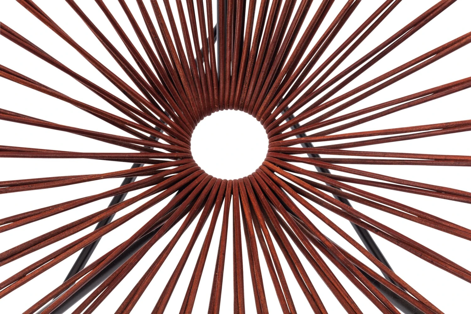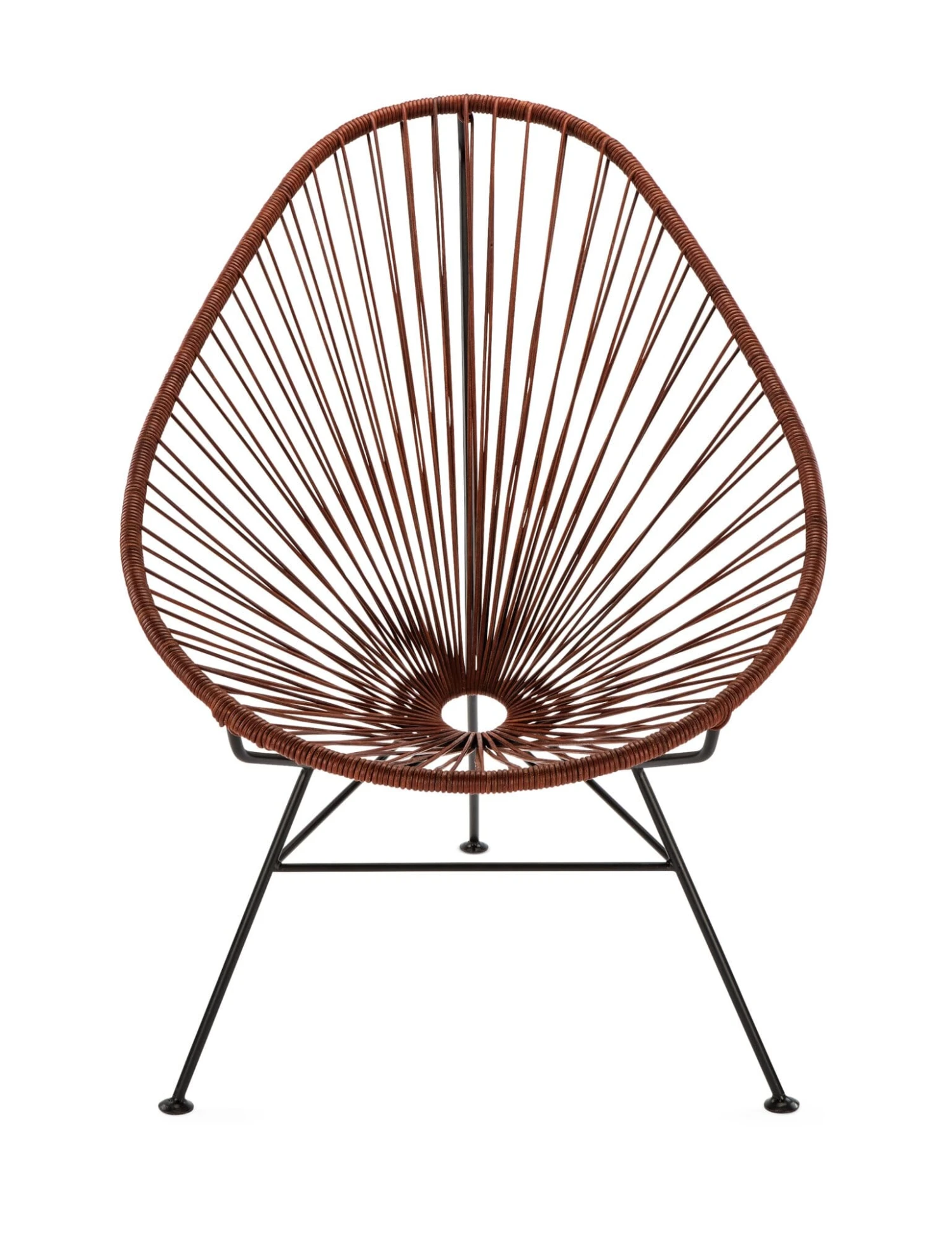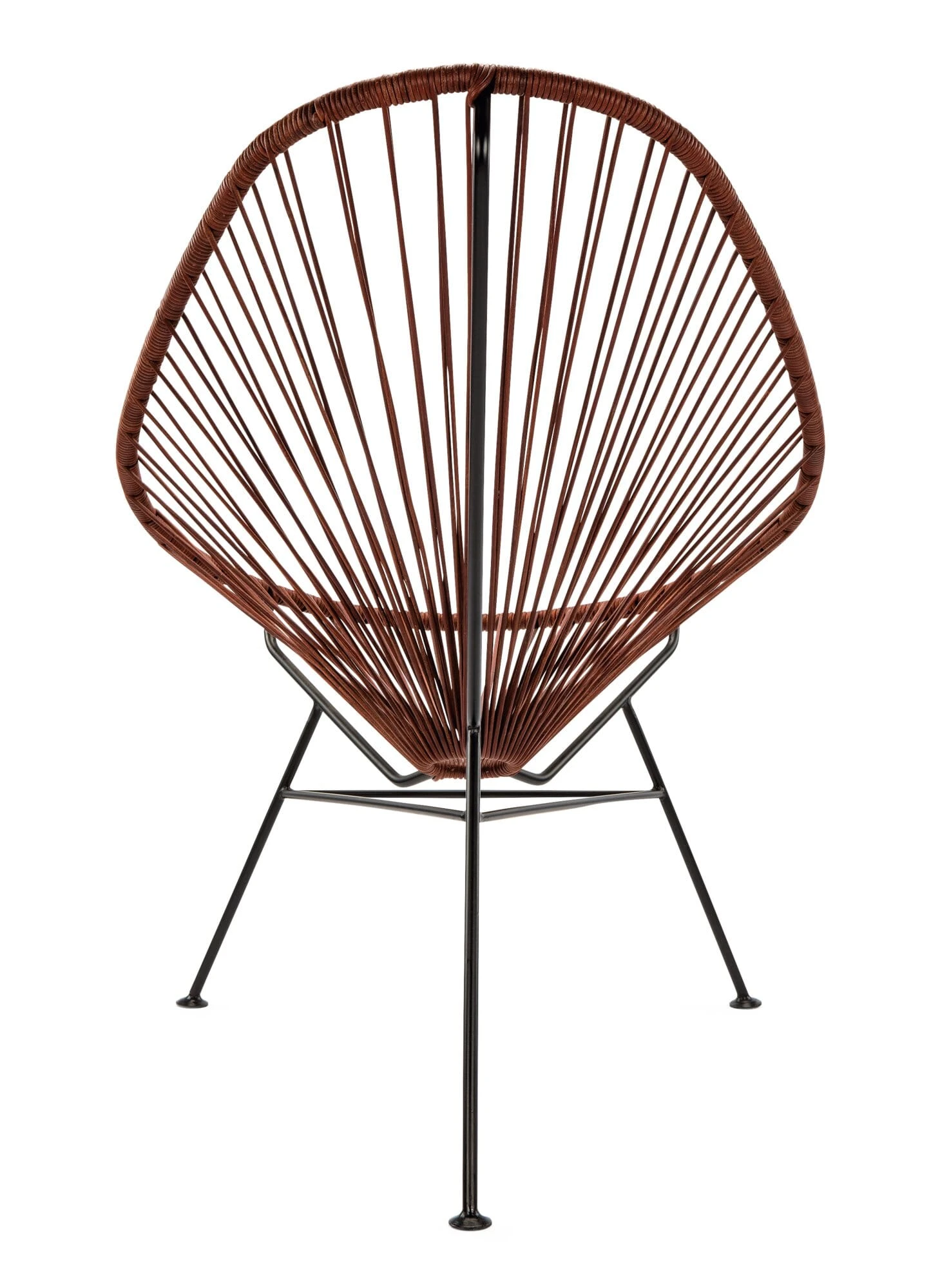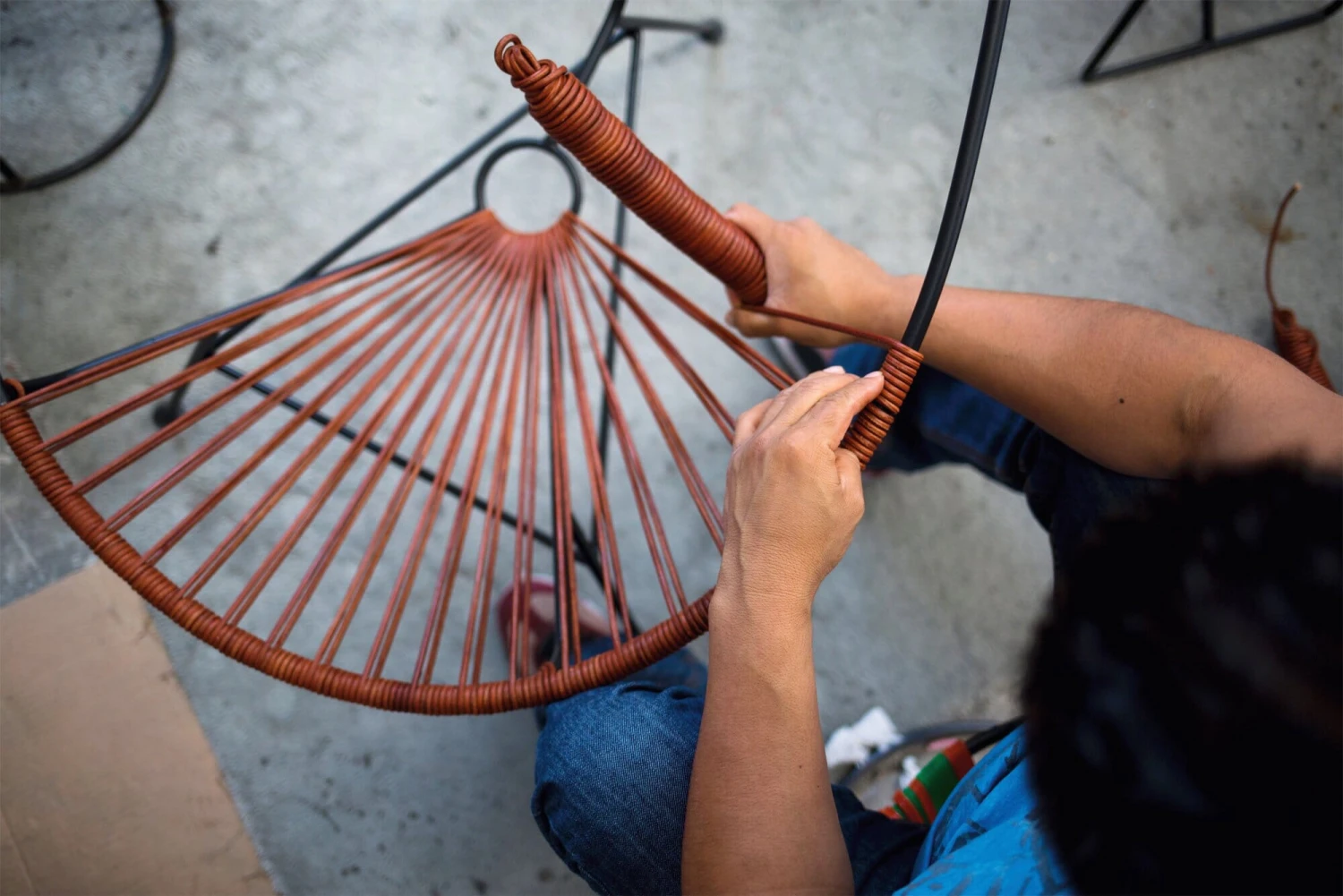De Acapulco Chair ontleent zijn kenmerkende vorm aan zijn ondoorzichtige, geweven zitting. Het is handgemaakt – lange banden zijn om het gepoedercoate frame gewikkeld. Oorspronkelijk (en ook nu nog) was de stalen constructie gevlochten met gekleurde PVC-koorden, waardoor de meubelen geschikt waren voor gebruik buitenshuis. Wij bieden een met lederen koorden beklede versie, die uiterst robuust is, maar alleen bedoeld voor gebruik binnenshuis. Het gebruikte leer is afkomstig van Mexicaanse runderen en is plantaardig gelooid, soepel gemaakt met oliën en draadborstels en in vorm gebracht met een gatenschaar. Tenslotte maakt de Noord-Amerikaanse fabrikant de zitting van de 4,8 mm brede lederen koorden. Daartoe spannen de medewerkers het materiaal op bepaalde afstanden tussen het eivormige bovenframe – dat later de rug- en armleuningen zal worden – en een centrale ring in het onderste deel van het stalen frame. De openingen die ontstaan op het bovenframe worden daarbij ook met leer omwikkeld.