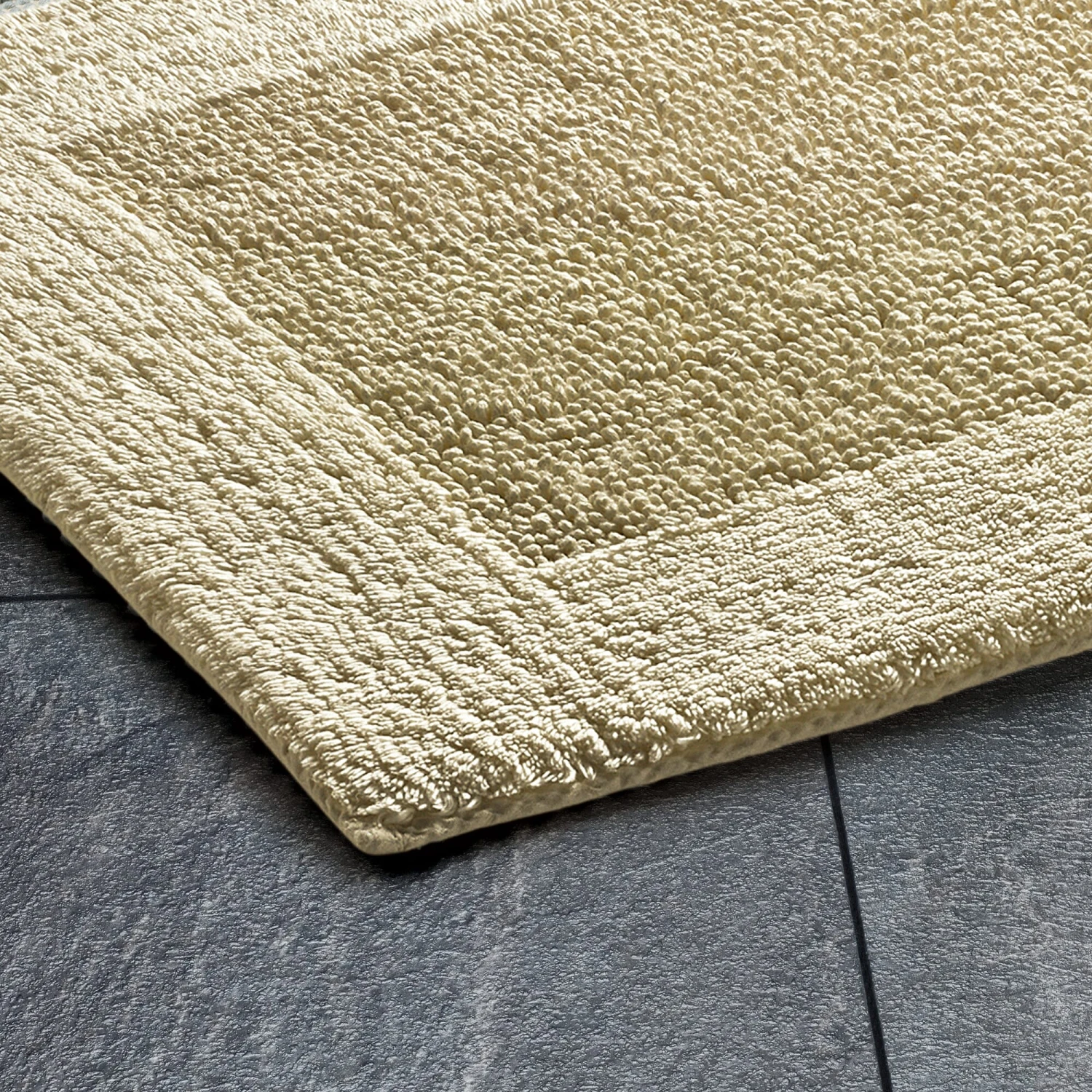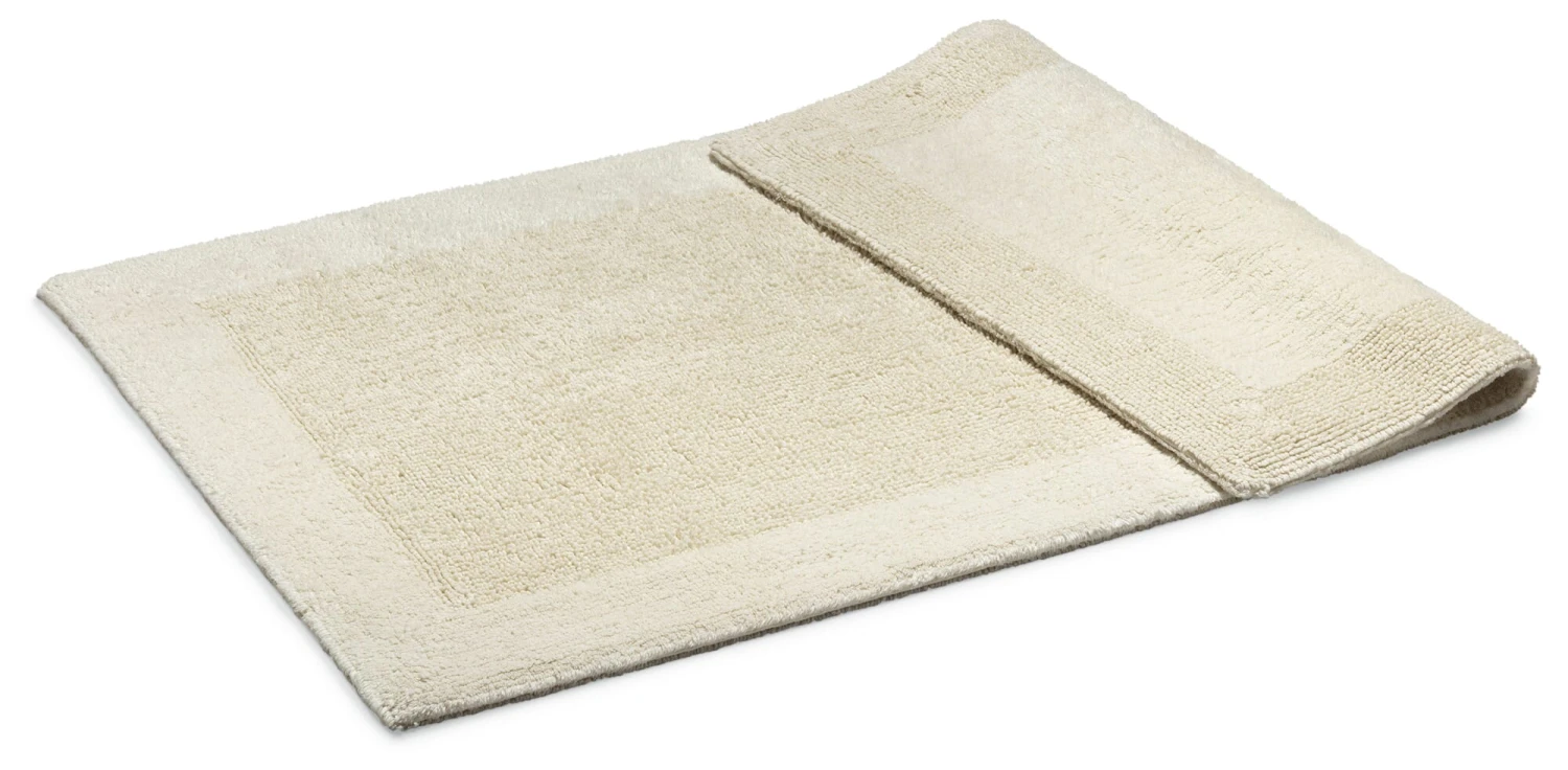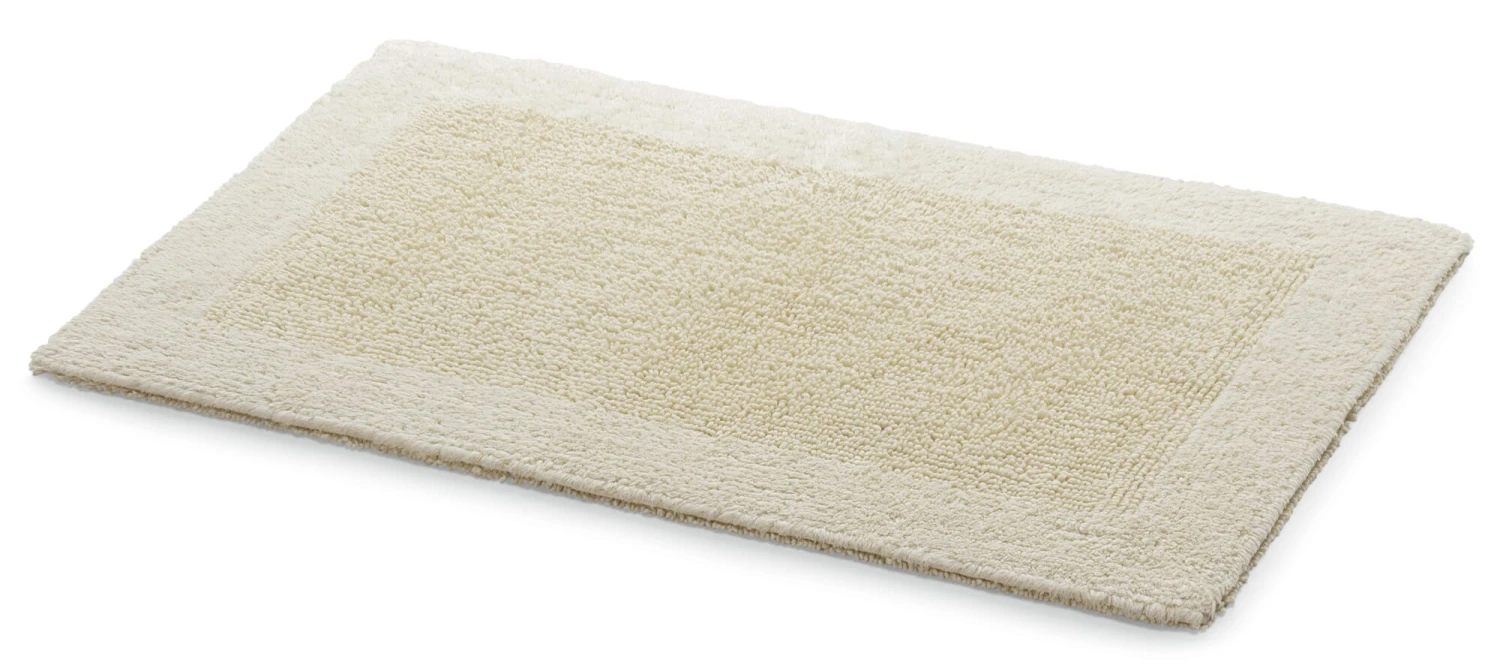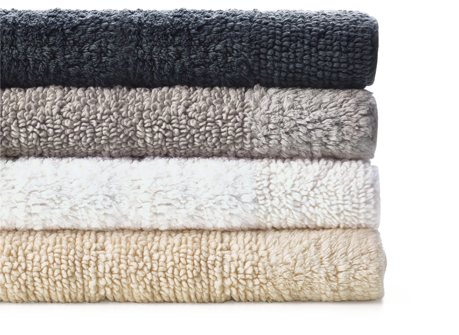 Je kunt niet zachter in de badkamer staan dan op deze bad- of douchematten. Hun weelde ligt in de techniek van het tuften. Een basisweefsel wordt “genaaid” met een ringgesponnen garen van langharige katoenvezels. Het wordt op zijn plaats gehouden met speciale grijparmen om aan beide zijden een dikke pool te creëren. De ontstane lussen worden aan een van de zijden opengesneden; het resultaat is een open velourszijde en een gesloten luszijde – de badmat toont aan elke zijde het “negatief” van de achterzijde. De pool krijgt zijn goede stand door een eerste wasbeurt in de fabriek, waar de basisstof in schering en inslag anders wordt gebroken en onder spanning komt te staan. Dit werkt het best met deze zware kwaliteit van 2.100 g/m² en een dikte van 20 mm. 100% katoen. Machinewas op 40 °C; in de droger worden de matten weer voller.