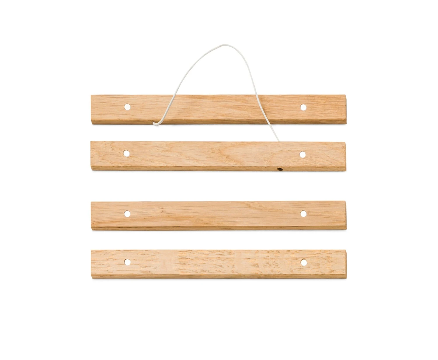 Deze discrete stripconstructie is een geslaagd alternatief voor de klassieke fotolijst, omdat hij uiterst gemakkelijk te vullen en aan de muur te bevestigen is. De boven- en onderrand van het gekozen papier worden eerst ingesloten tussen twee eiken strips die voorzien zijn van magneten, waarna het geheel met een koord aan de bovenste strip kan worden opgehangen. Het document kan even snel worden bevestigd als verwisseld; het tentoongestelde stuk blijft intact. Wij bieden de stroken, die doen denken aan klassieke school- of lesborden, aan in drie DIN-breedtes (A4, A3, A2) alsook in een breedte van 50 cm – er is ruimte voor foto’s, tekeningen, prenten en posters, maar ook voor zelfgemaakte documenten zoals kalenders of overzichten en grafieken met werkmethodewaarde. De houten strips worden vervaardigd in een Beierse werkplaats voor mensen met een handicap.