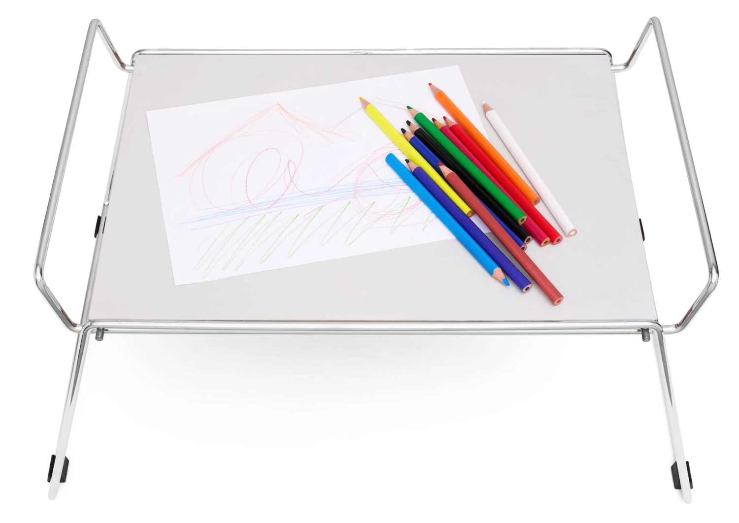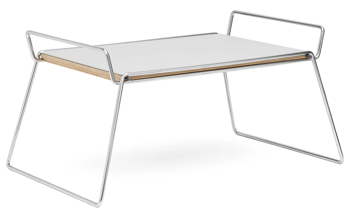Dienblad en tafel in dezelfde afmetingen en prachtige kleine universele meubels: bijzettafel naast fauteuil of bank, dienblad in bed, werktafel op de bank, kleine speelplaats voor de kinderen – er is nauwelijks een situatie in het dagelijks leven waarin BLOCH geen goede taak vindt en zijn rol perfect vervult. De stabiele structuur van staaldraad ondersteunt een met linoleum bekleed blad. De ergonomisch goed geplaatste en uitgebalanceerde handgrepen maken de constructie gemakkelijk en veilig te dragen.