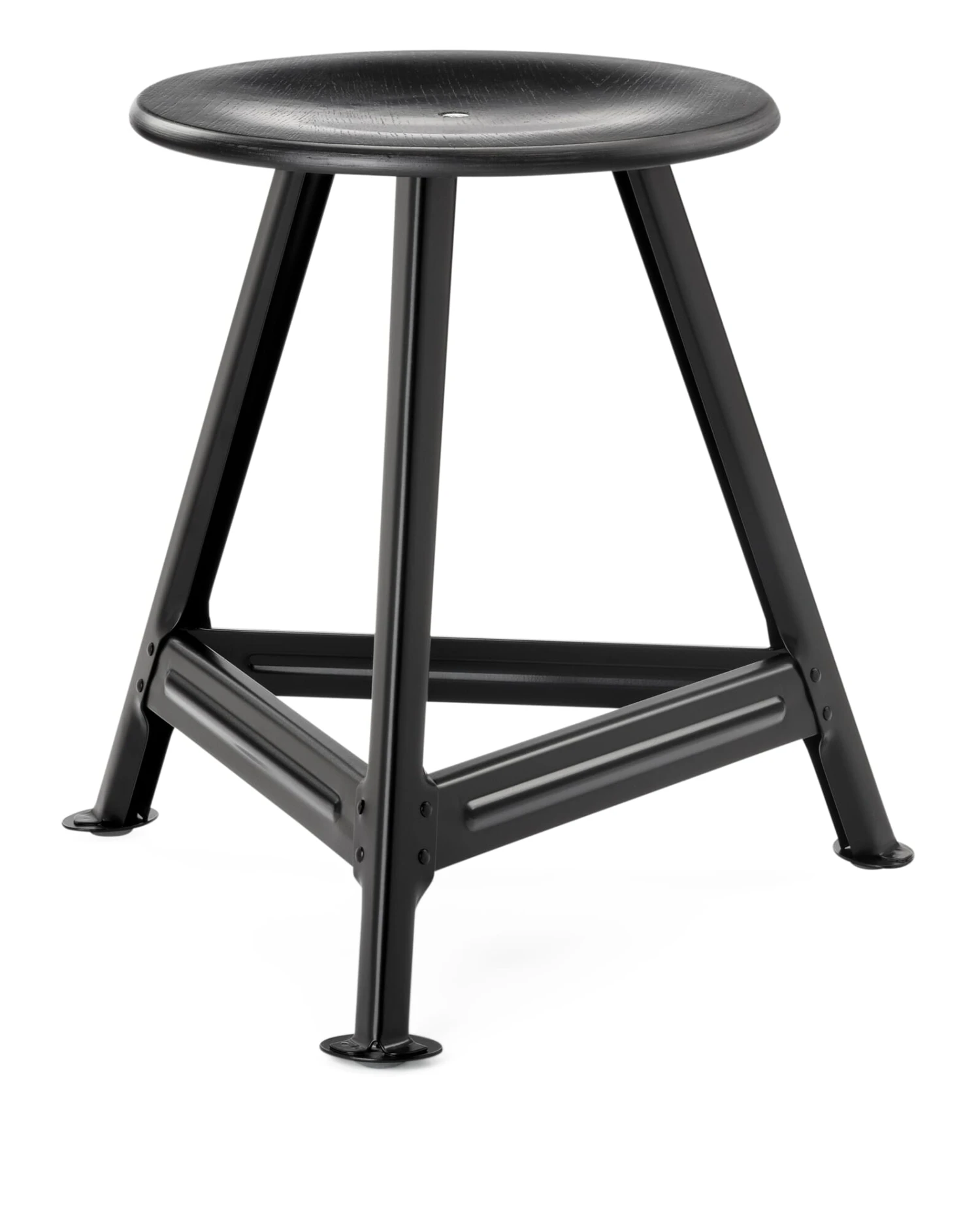 De industriële werkkruk bij uitstek: het ontwerp van dit zitmeubel bestaat al sinds de jaren 1920 en wordt ook nu nog beschouwd als een van de meest gebruikte werkmeubelen – althans in de tijd van de wijdverbreide handmatige productie in de industriële productie. Het is geen nostalgische neiging die ons ertoe brengt dit meubelstuk opnieuw in ons programma op te nemen. Wat ons aantrekt is het purisme, de heldere en onvervalste opbouw. Sinds de jaren zestig wordt het onveranderd en in de beste industriële kwaliteit geproduceerd in een Zwabische fabriek voor werkmeubelen. De krukken hebben stevige rubberen glijders op hun poten, de licht gevormde zitting heeft een meerlaagse constructie, de zichtbare laag is van eikenhout en is naturel gelaten. Snelle patinering – indien niet gewenst – wordt vermeden door het oppervlak te oliën of in de was te zetten.