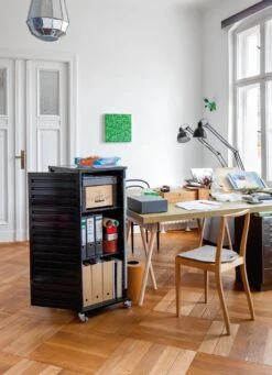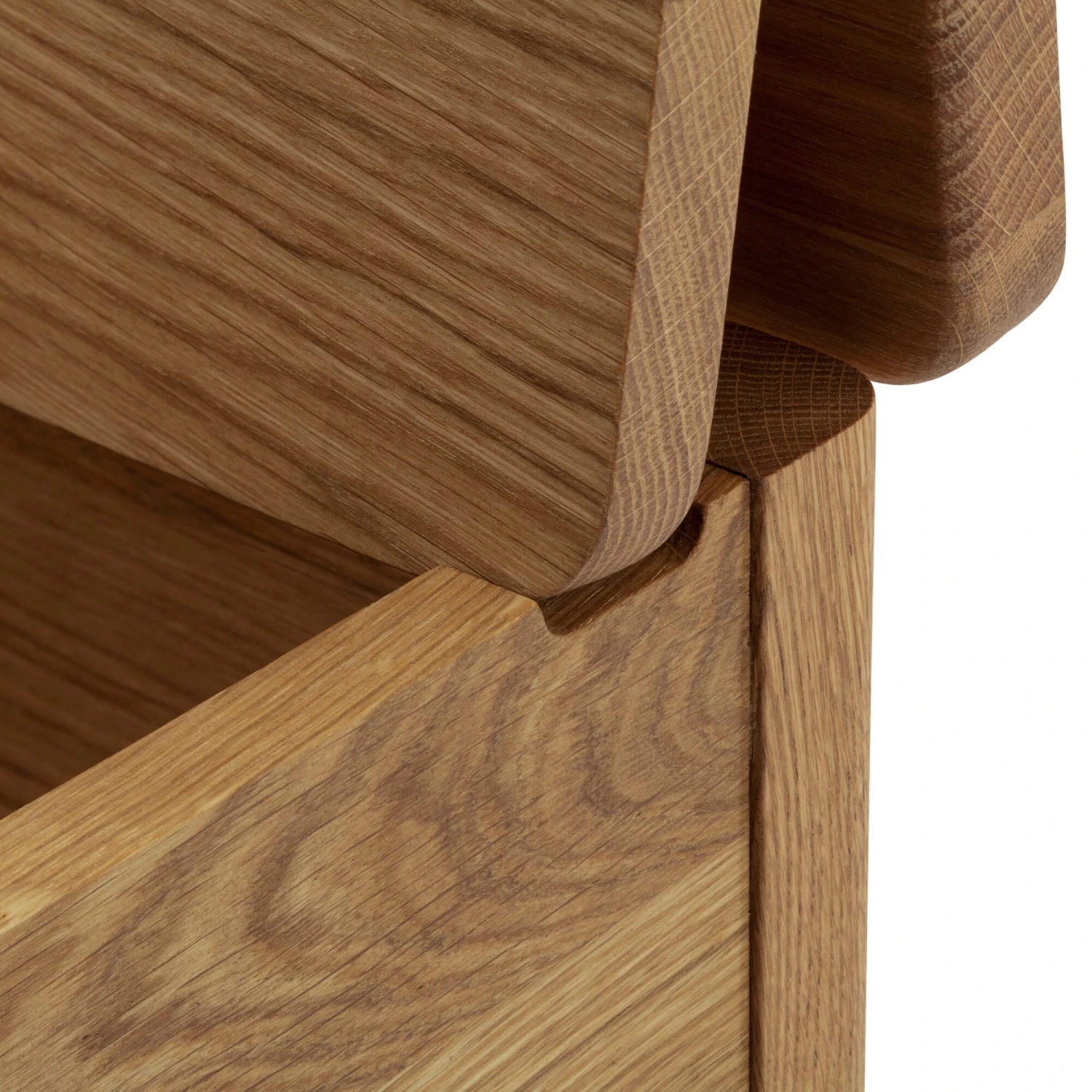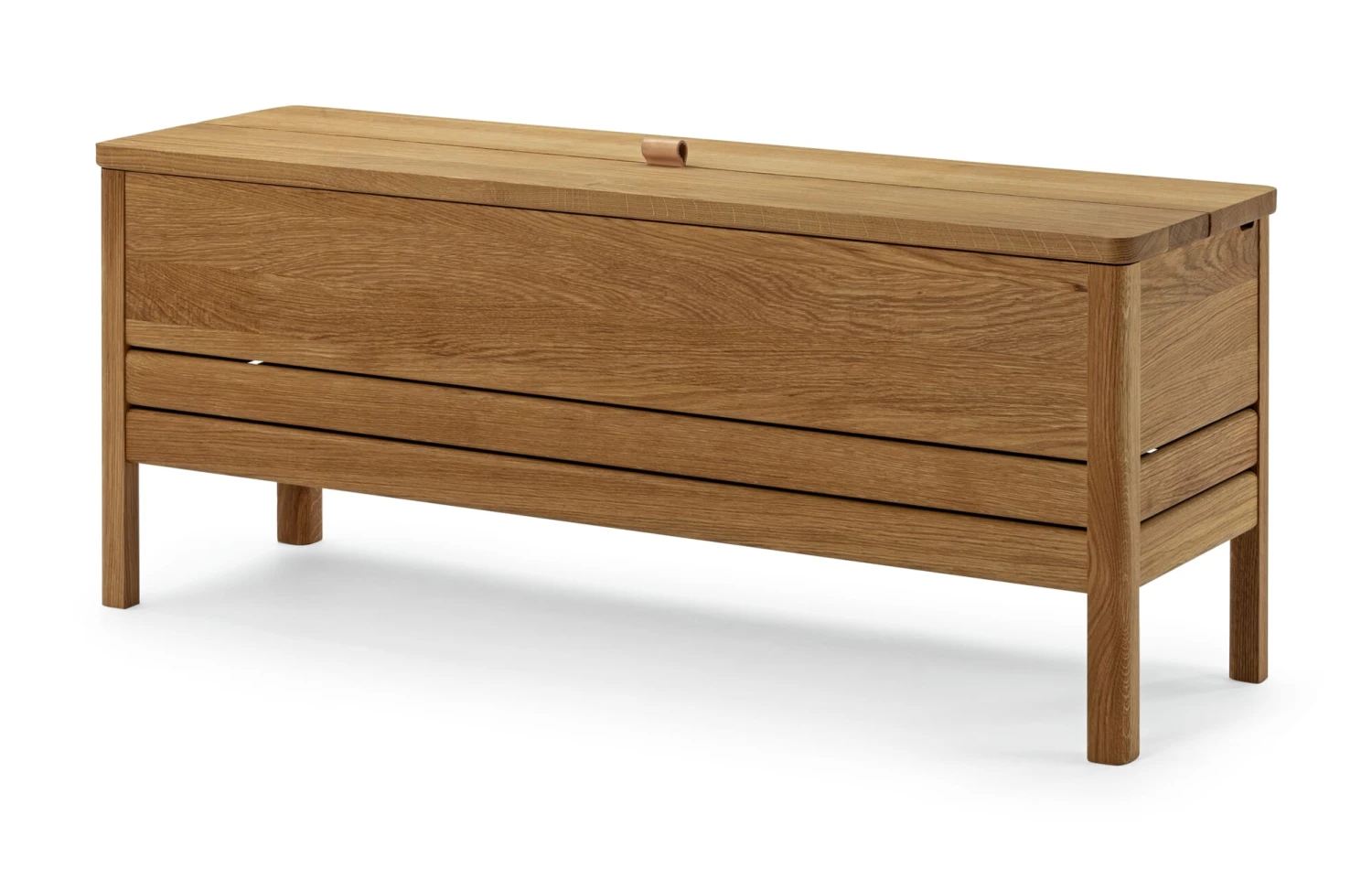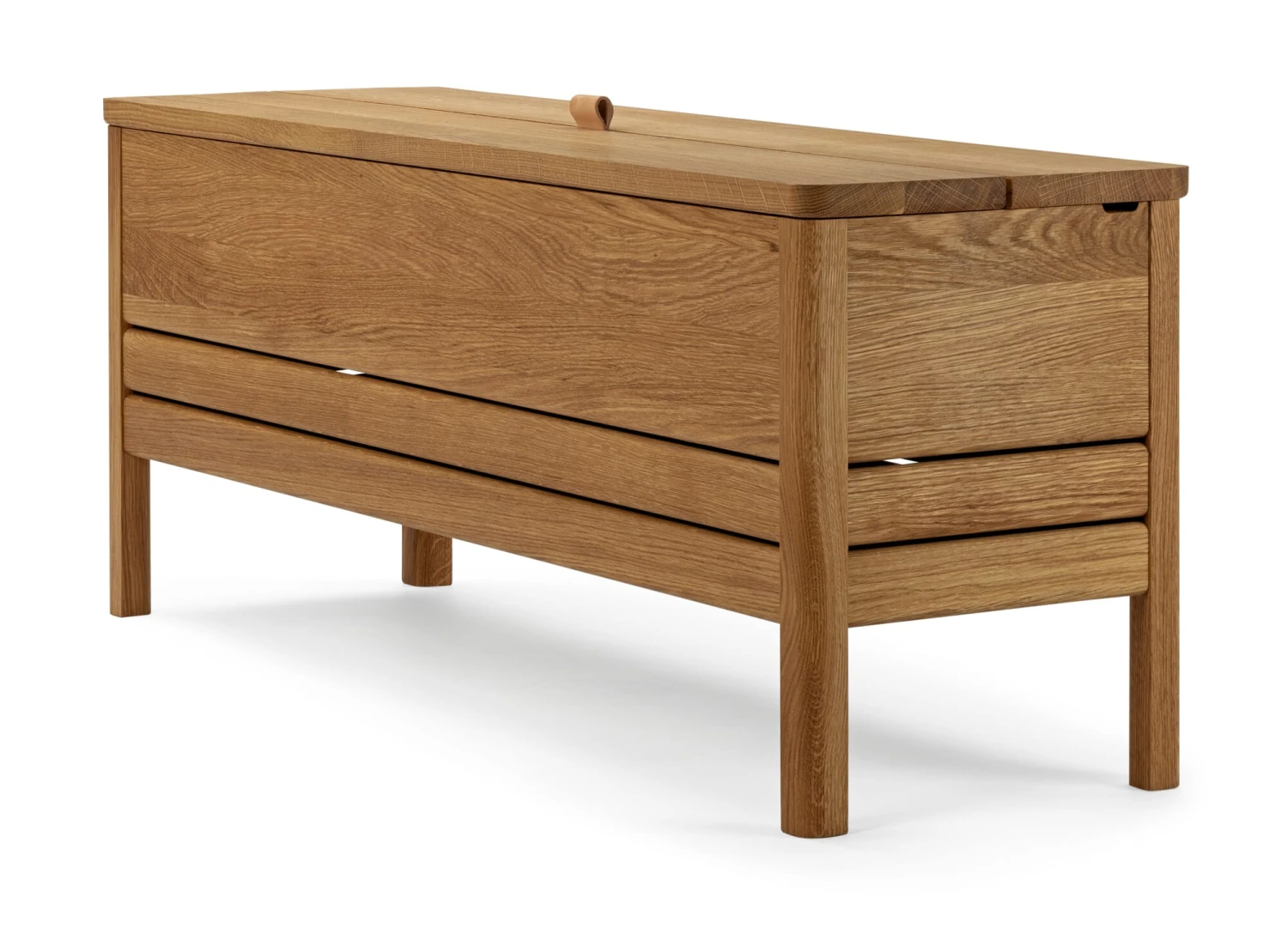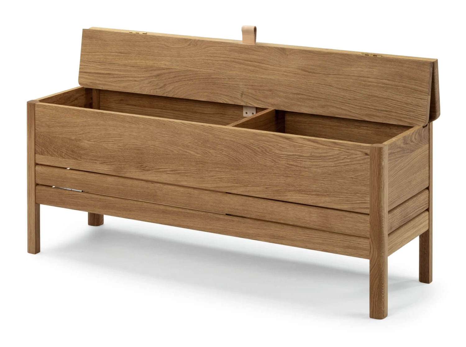 De kistbank is een zeldzame soort geworden. Ten onrechte, want het combineert de functionaliteiten van opbergen en erop zitten in één meubel, waardoor het goed staat in de gang en garderobe, maar ook in de slaapkamer of kleedkamer. Hier is er zo een, in alle delen gemaakt van massief, geolied eikenhout en met een duidelijke vorm, die beslist dicht bij de traditie van de Shaker meubelen staat. Het tweedelige deksel wordt geopend door middel van een lus van plantaardig gelooid, ongeverfd leer en klikt aan de achterkant vast. De bergruimte, die eveneens in twee delen is verdeeld, wordt geventileerd door openingen in de verbinding tussen de bodem en de poten, alsmede in de uitsparing die is gefreesd om het deksel vast te zetten – wat handig is wanneer bijvoorbeeld schoenen of textiel in de kistbank worden opgeborgen.