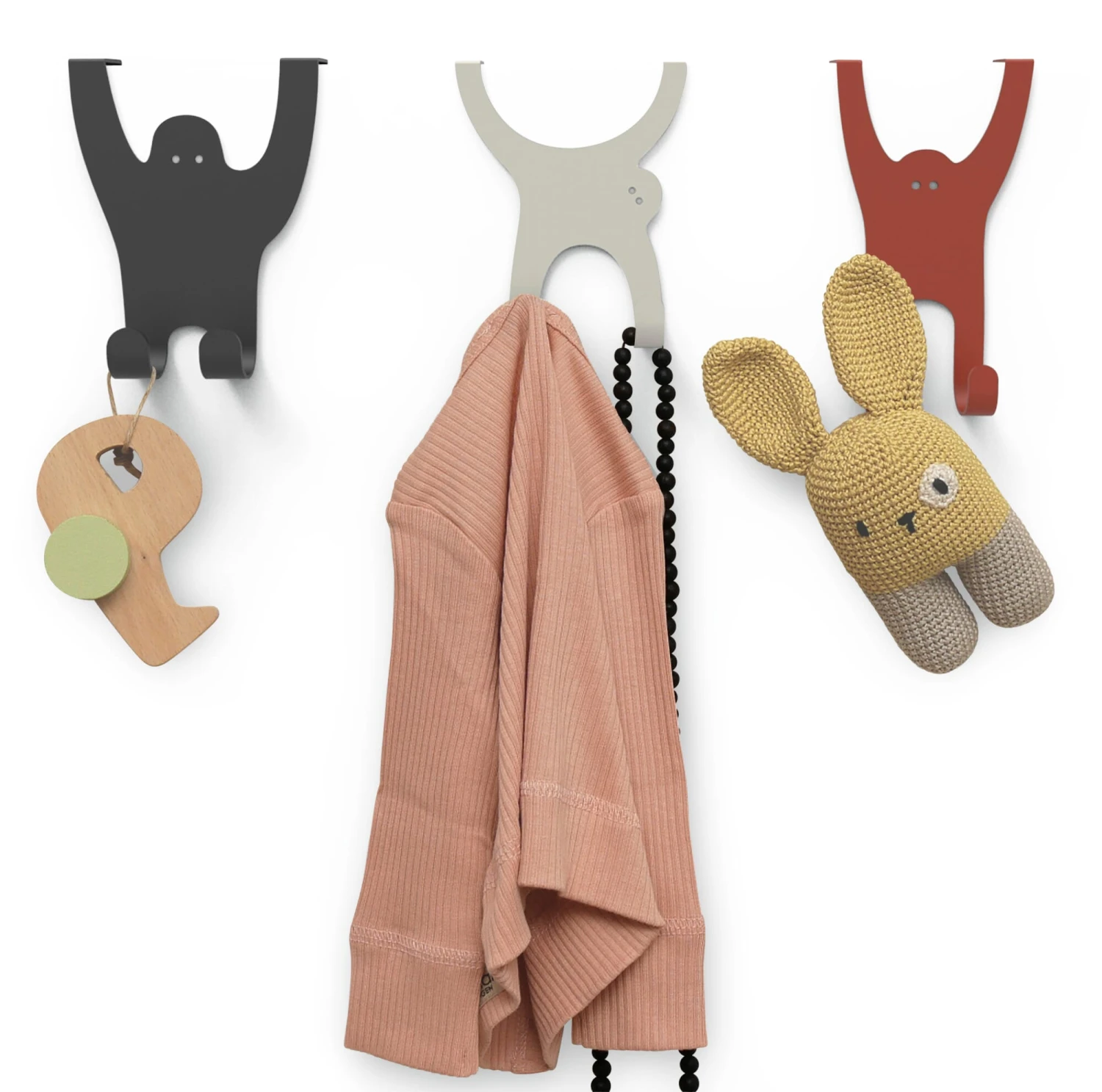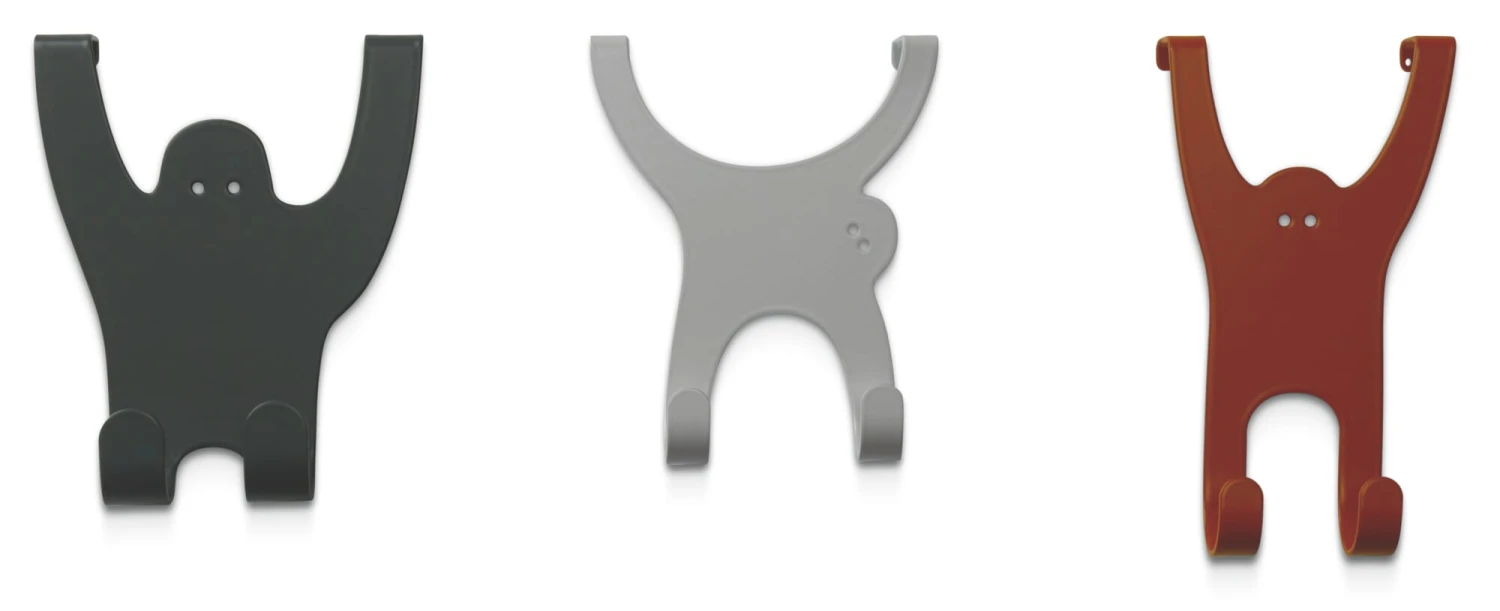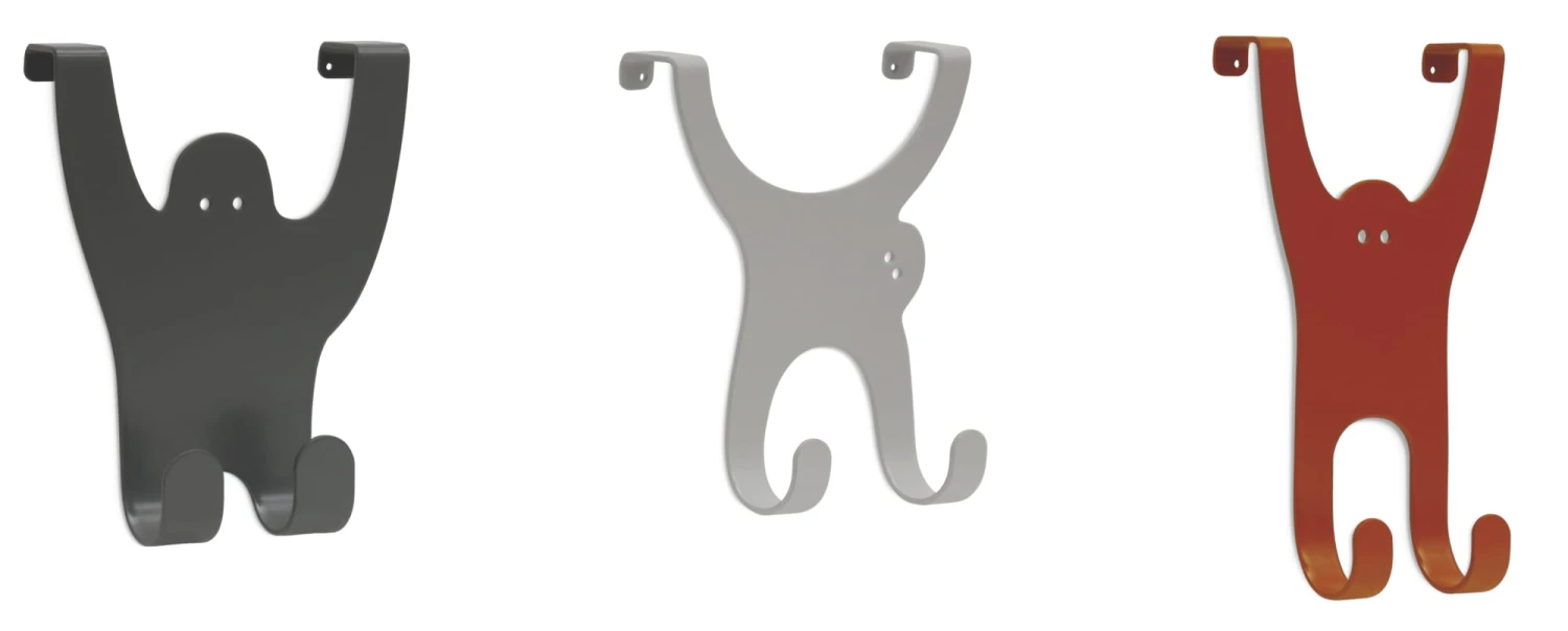 De bende apen biedt hun lange ledematen enerzijds aan als haken en anderzijds als veilige houders op standaard deurbladen (tot ca. 18 mm). De set bestaat uit een gorilla, een orang-oetan en een gibbon. Drie met laser gesneden en gevouwen vormen van plaatstaal in de vorm van apen in drie verschillende kleuren.