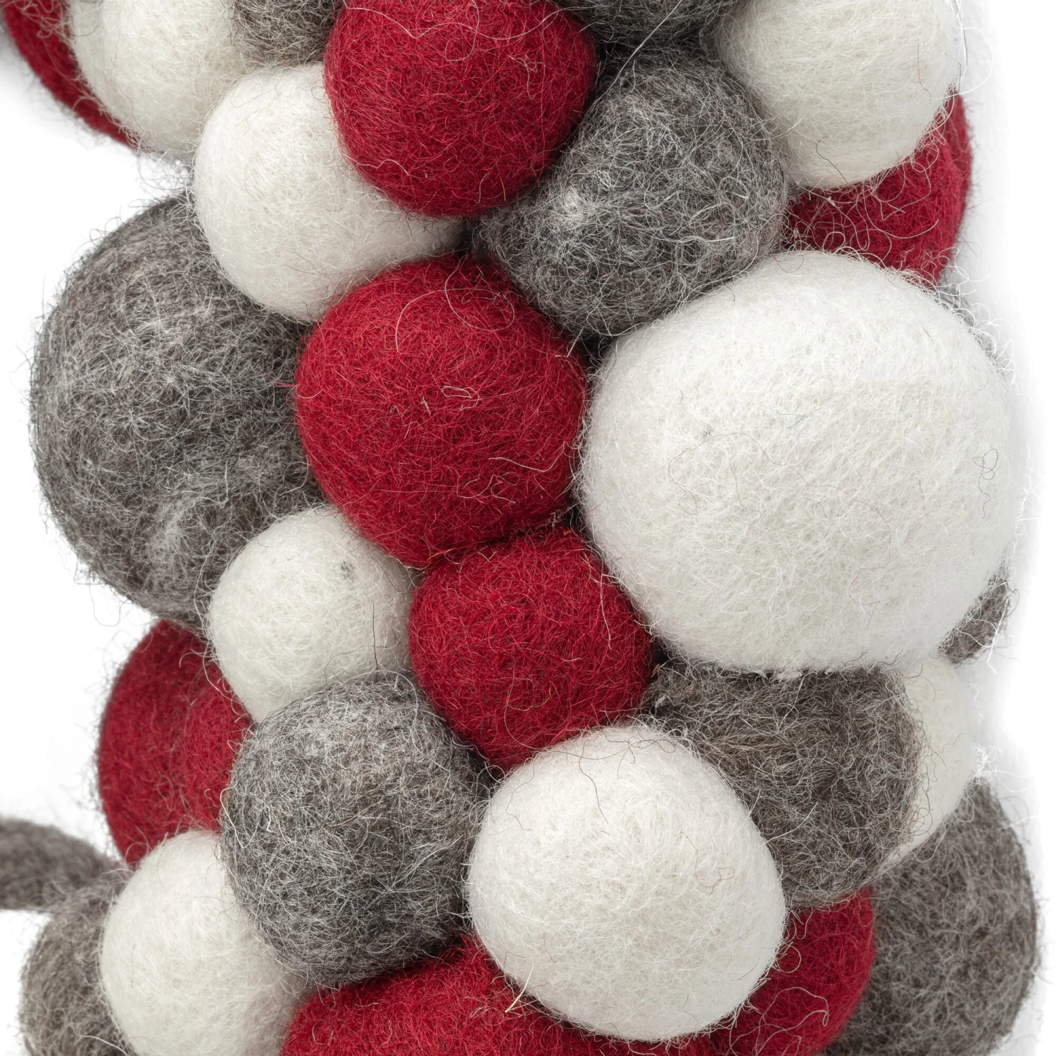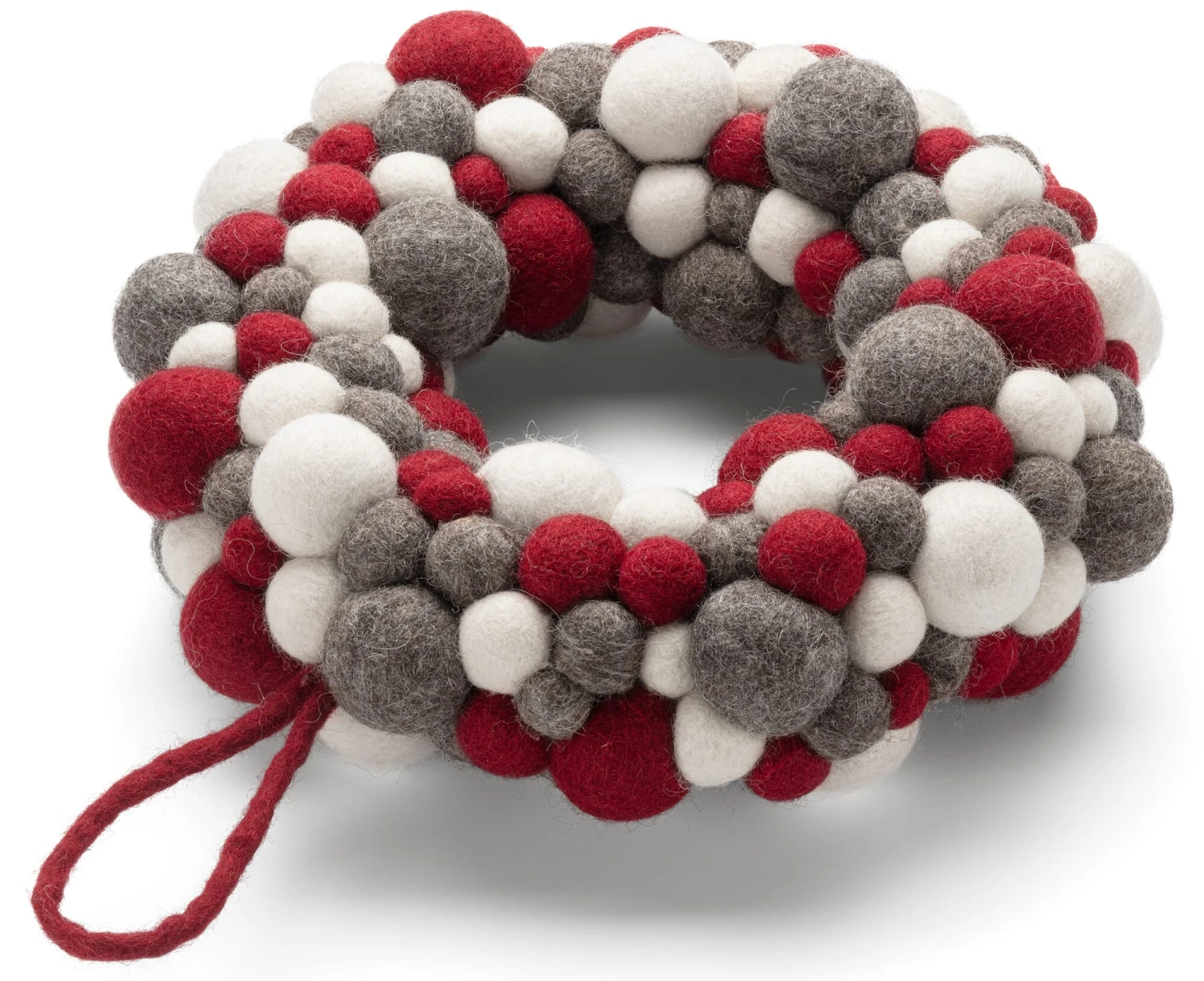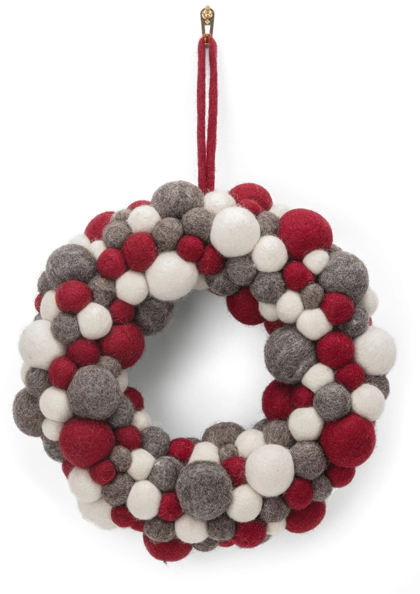 100% scheerwol (herkomst Nieuw-Zeeland). Krans Ø buiten ca. 29 cm, Ø binnen ca. 10 cm. Viltballen Ø ca. 1,5-4 cm. Gewicht ongeveer 700 g.