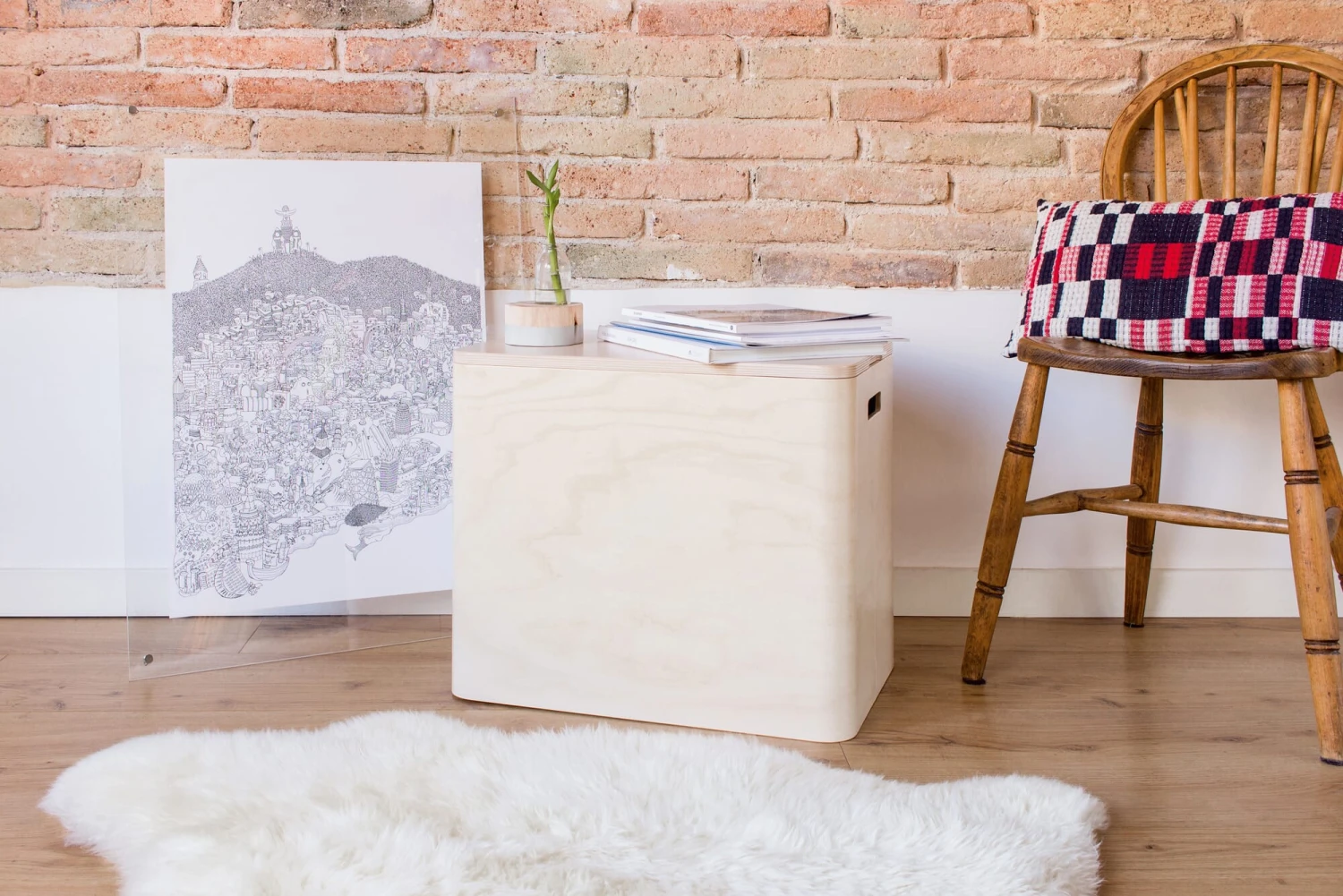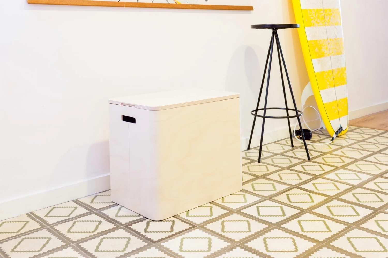 Mooie doos, fijn gemaakt van Fins multiplex. Twee afzonderlijk insteekbare verdelers zorgen voor een individuele indeling van het interieur. ECOSMOL is een opbergmeubel voor vele doeleinden: op kantoor als archiefdoos voor tijdschriften enz., in het huishouden als opbergmeubel voor keukengerei of als afvalverzamelaar en -sorteerder. Dankzij de stabiele constructie kan ECOSMOL ook worden gebruikt als krukje in bijvoorbeeld de gang of als bijzettafeltje naast het bed of de bank.
