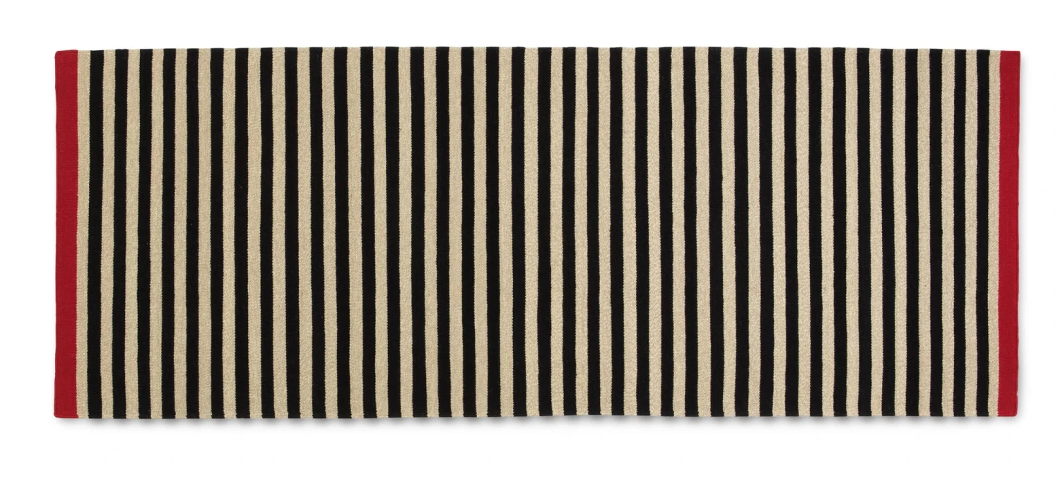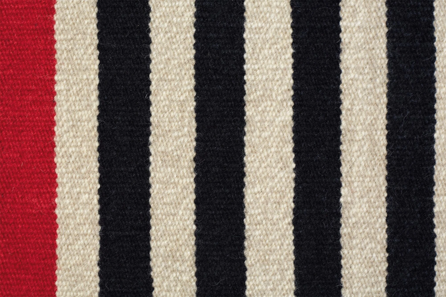 Scandinavisch design: het duidelijke streeppatroon van het handgeweven tapijt wordt door de textielontwerpster Lisbet Friis omlijst met felrode geweven afwerkingen. Bij het Deense familiebedrijf Fabula ontmoet Scandinavisch design oosters vakmanschap – de kilimweving houdt in dat de inslagdraad het patroon aan beide zijden van het tapijt vormt, waardoor het aan beide zijden bruikbaar is. Dankzij de lage poolhoogte is ROSEMARY bijzonder geschikt voor gebruik in gangen en hallen. Made in India.