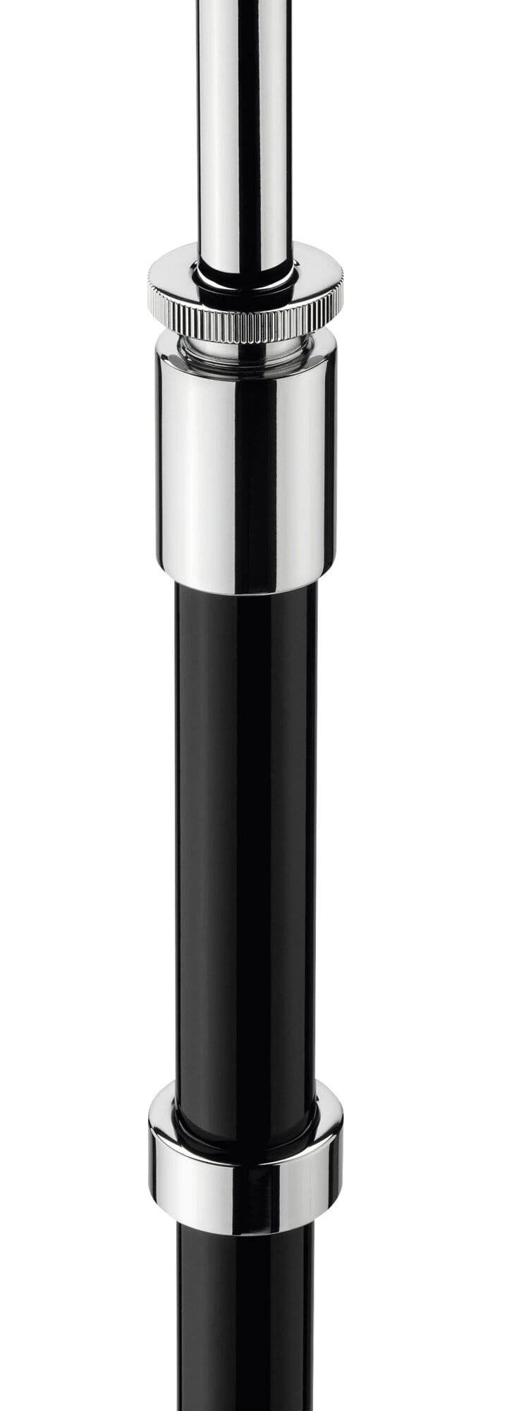 Schaduwplaat staal, buitenkant zwart glanzend nat gelakt, binnenkant wit gelakt. Bovenste standbuis verchroomd messing, onderste standbuis en voet staal, glanzend zwart nat gelakt. Plastic kabel (lengte 180 cm) en stopcontact. Hoogte 125-135 cm, Ø voet 22,5 cm, Ø kap 21 cm. Gewicht 6,3 kg. Stopcontact E27, maximaal stroomverbruik 60 W. Beschermende contactstekker (type F).