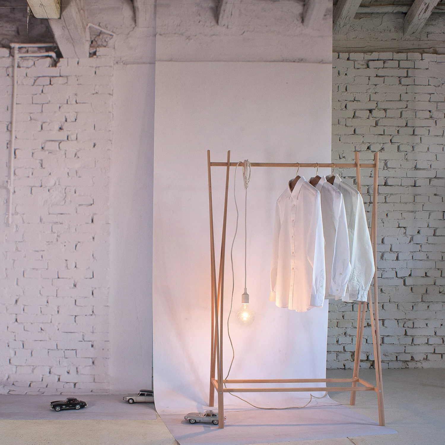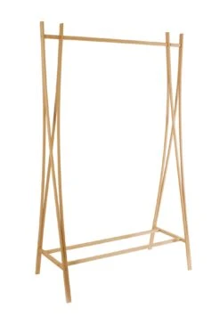 De brede en meer ruimte biedende versie van de TRA kapstok, met een kledingstang en een plank die onderaan eindigt. Met de identieke designkenmerken van de kleinere vrijstaande kapstok, die gebruik maakt van de elasticiteit van het beukenhout. Het meubel wordt gedemonteerd geleverd en kan met weinig moeite worden gemonteerd.