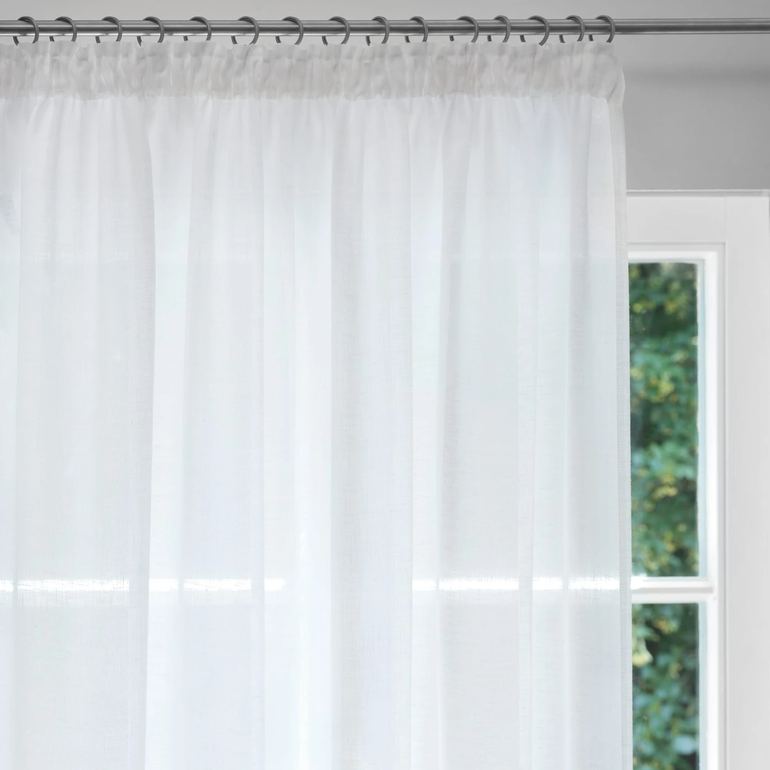 100% linnen. Herkomst Europa. Basisgewicht 104 g/m². De krimp is 3-4%. Kleur zuiver wit. De zoom is 10 cm breed, de gordijnband 5 cm. Geweven en geconfectioneerd in Oostenrijk. Levering zonder gordijnroede en ringen.