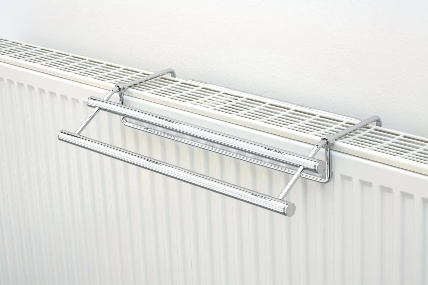 Dit rek, opgehangen boven de radiator in de badkamer of keuken, biedt een praktische manier om handdoeken (of zelfs handgewassen klein textiel, keukendoeken …) op te hangen en te drogen. Door middel van de traploos verstelbare beugel kan hij worden aangepast aan radiatoren tot 11 cm diep.