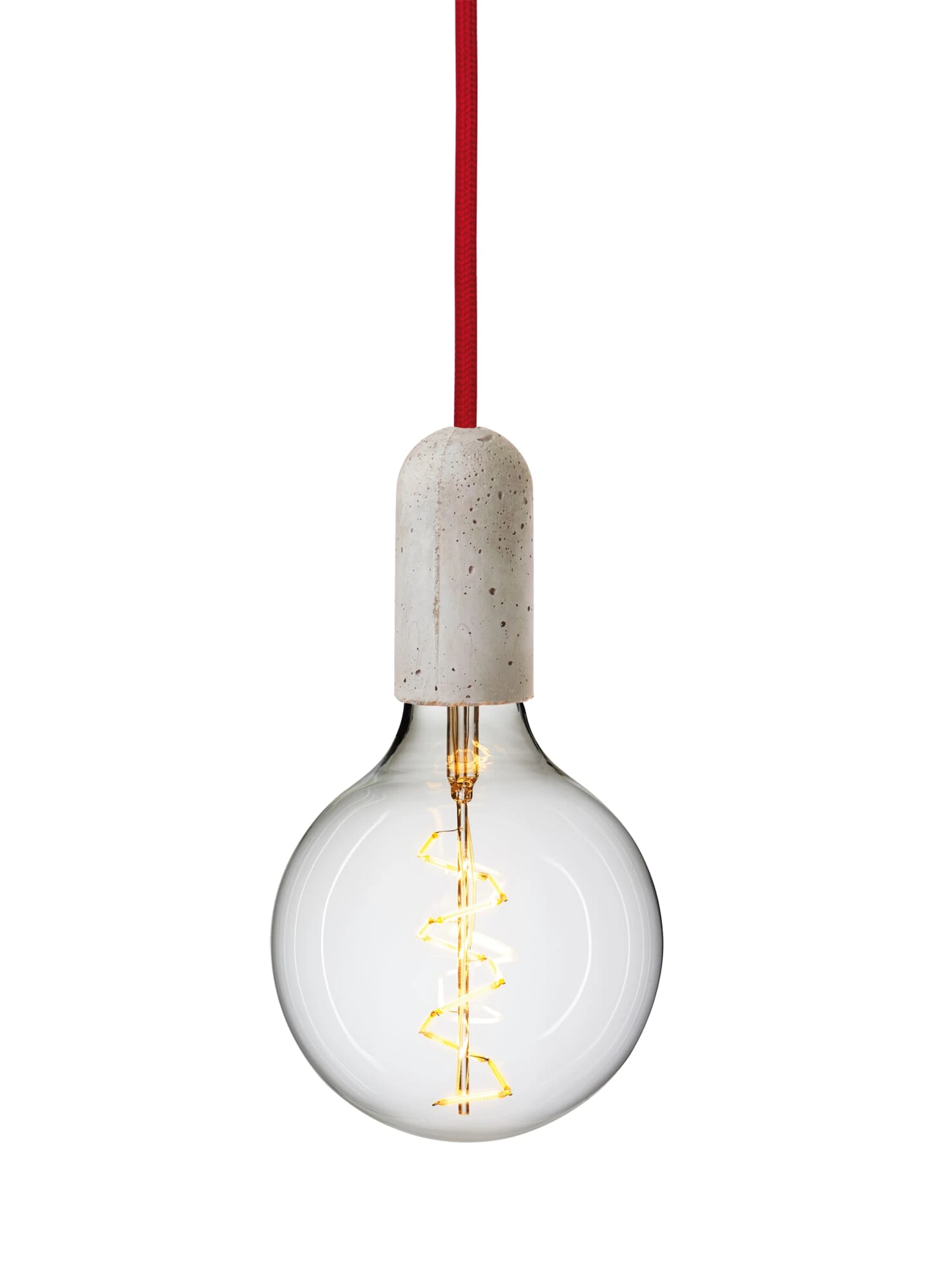 Lamphouder in een betonnen behuizing aan een met textiel beklede kabel. Een heerlijk eenvoudig ding met een industrieel karakter. Een kleine plafondkap van witte kunststof maakt de lamp compleet.