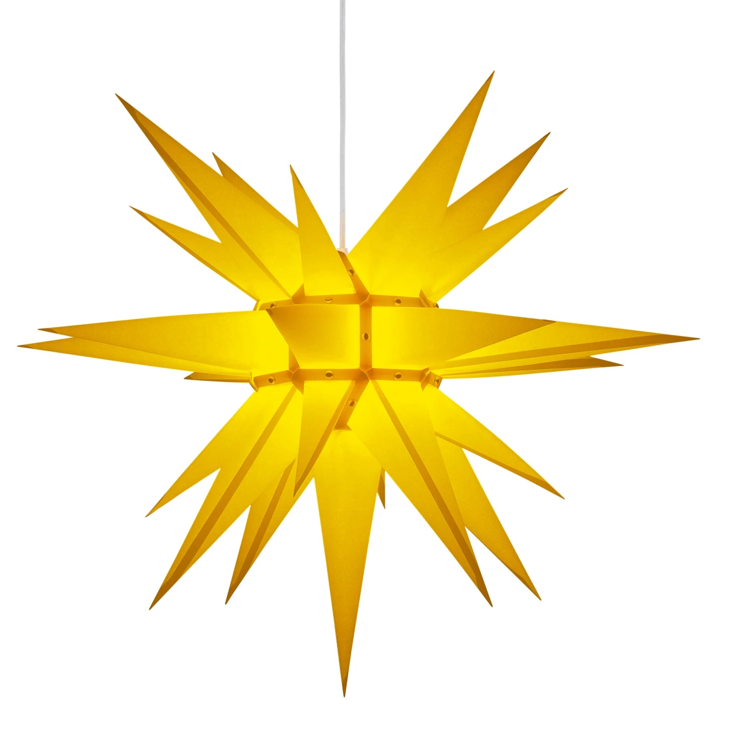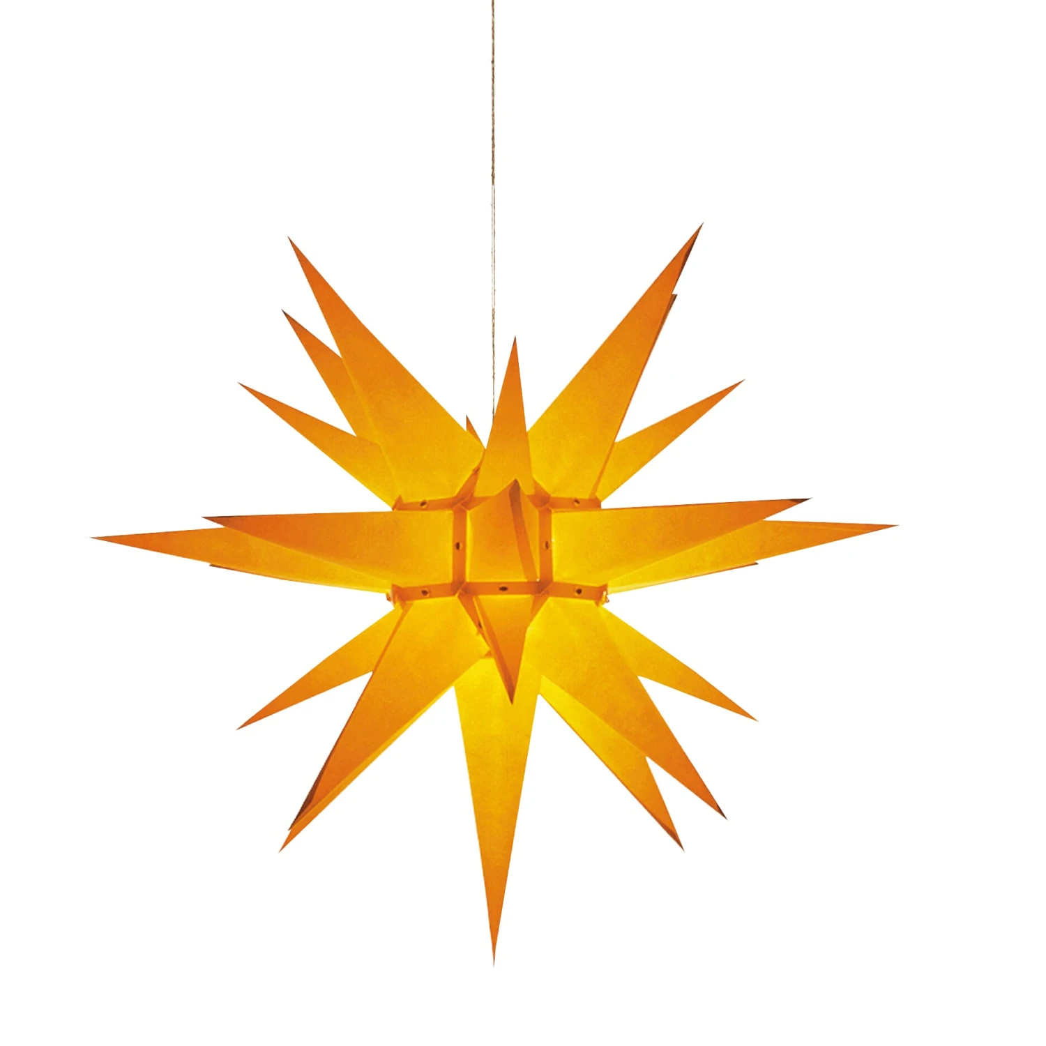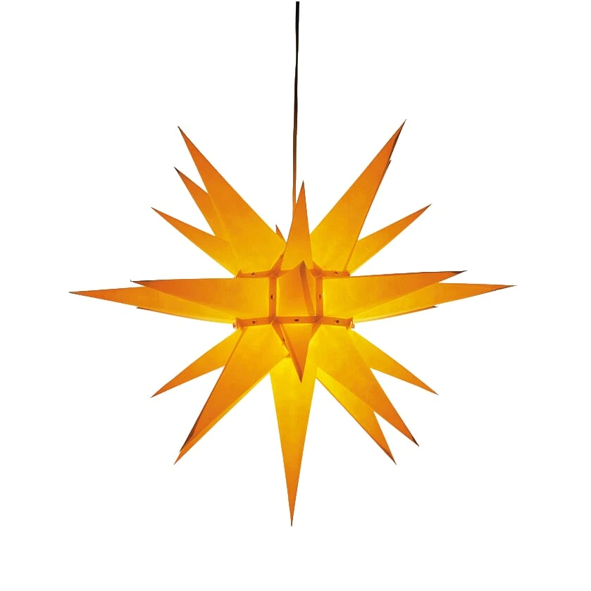 De beroemde adventster van de Moravische Kerk, met zijn indrukwekkende 25 stralen, maakt al vele jaren deel uit van ons assortiment en blijft zeer gewild. Net als zijn kleinere broer kan deze grotere ster worden verlicht door een gloeilamp van maximaal 40 watt, maar ook onverlicht draagt hij bij tot een sfeervolle ambiance.