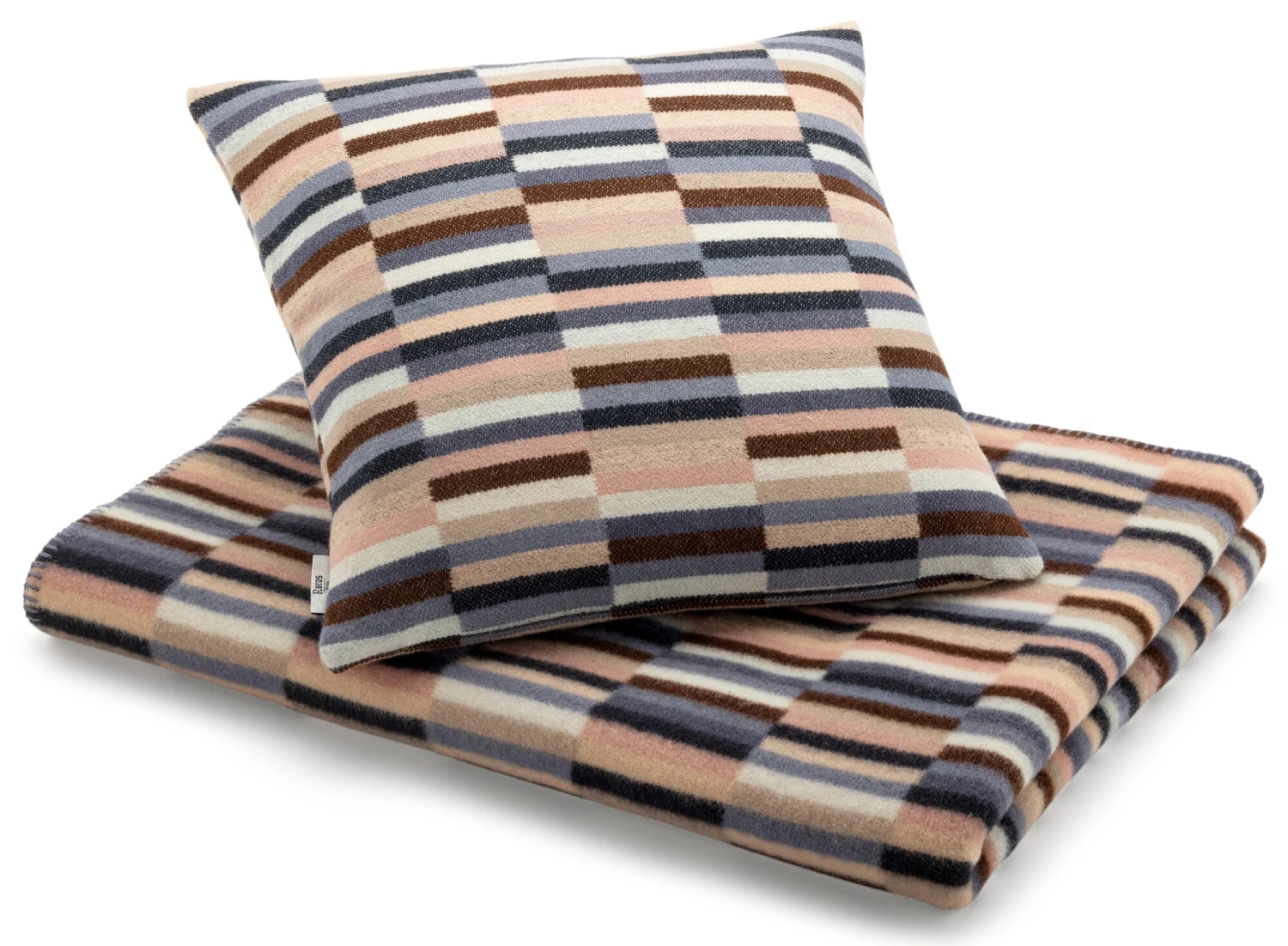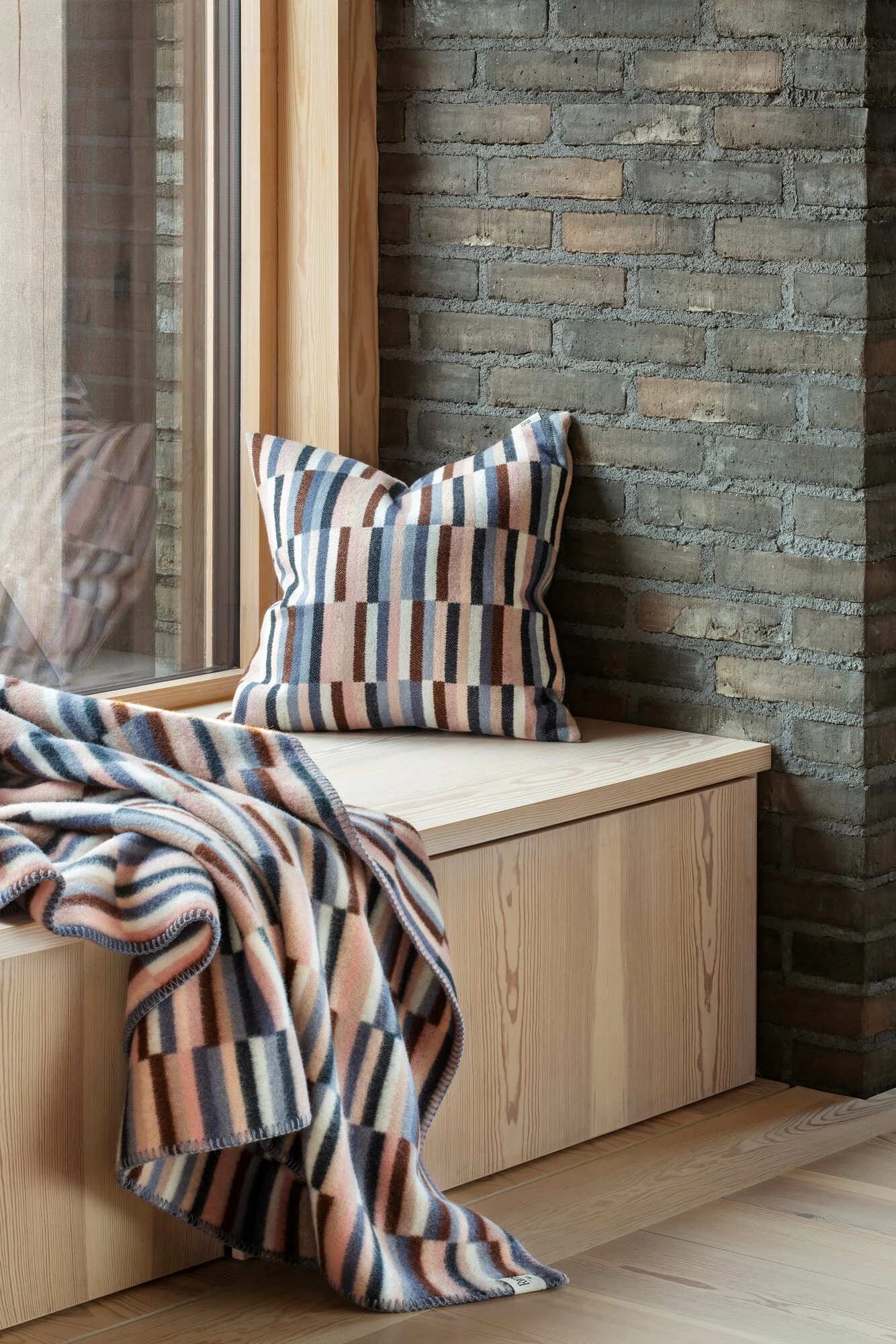 Wij zijn altijd onder de indruk van de trefzekere hand voor stijl en kleurcombinaties in de ontwerpen voor de dekens en kussenhoezen van Røros Tweed. Voor het ontwerp van Ida liet het ontwerpersduo Anderssen & Voll zich inspireren door patchwork-quilts en handgeweven wandtapijten. Het uiteindelijke patroon werd op schaal gemaakt van gekleurd papier, zodat sporen van het handwerk achterbleven en hun weg vonden naar het geweven patroon. Het resultaat is een eerder kleinschalig, grafisch patroon dat dankzij de onnadrukkelijke, perfect op elkaar afgestemde kleuren in gedempte tinten of pastels een rustig totaaleffect heeft, maar toch een mooi kleuraccent op de bank vormt. De kleuren zijn bovendien zo gekozen dat ze overeenkomen met die van andere dekens en kussenovertrekken van Røros Tweed. Voor de zachte wollen stof gebruikt Røros Tweed Noorse lamswol in de gebruikelijke zachte, soepele kwaliteit. De oppervlakken van de stof zijn extra geruwd, waardoor de toch al soepele, warme lamswol nog zachter en volumineuzer wordt en nog meer warmte-isolerende lucht kan vasthouden.