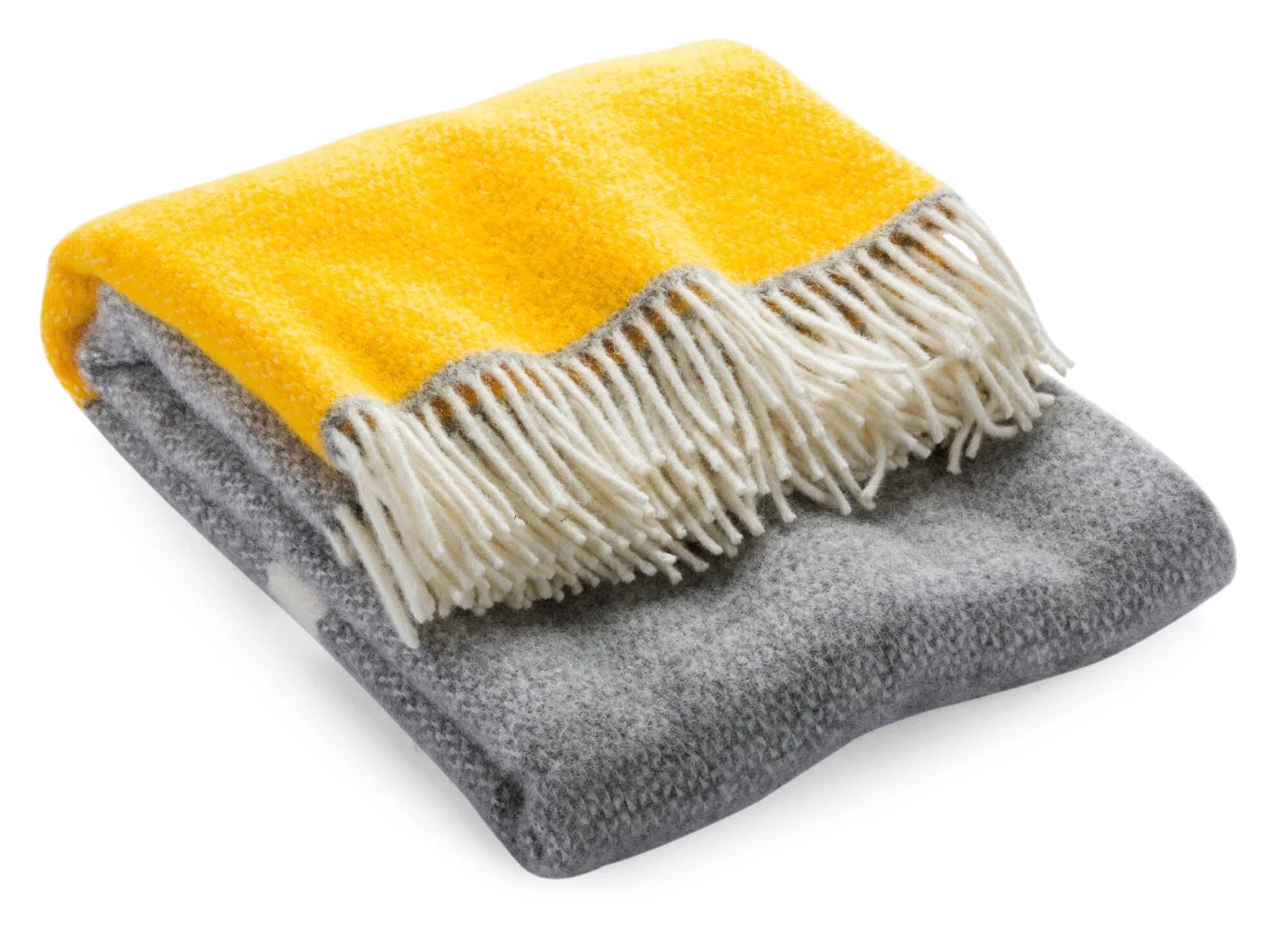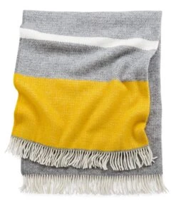 Dicht geweven deken van zacht wolgaren – met een brede kleurenstreep en gedraaide franjes. Het geweven patroon bestaat uit kleine driehoekjes die een ingehouden structuur van kleine pinwheels vormen. Dankzij het royale formaat kan de deken het best worden gebruikt als throw en warmer. Het wordt gemaakt in een Welsh familiebedrijf dat bekend staat om zijn bijzonder zorgvuldige en hoogwaardige afwerking.