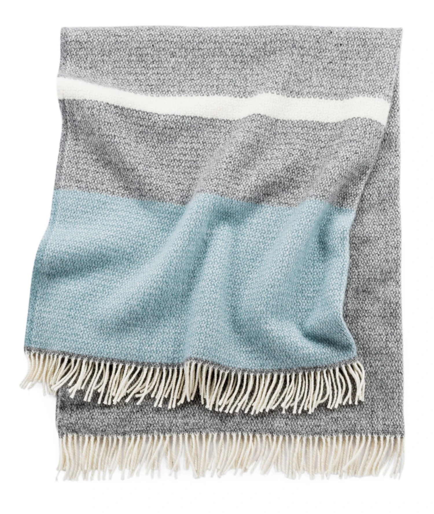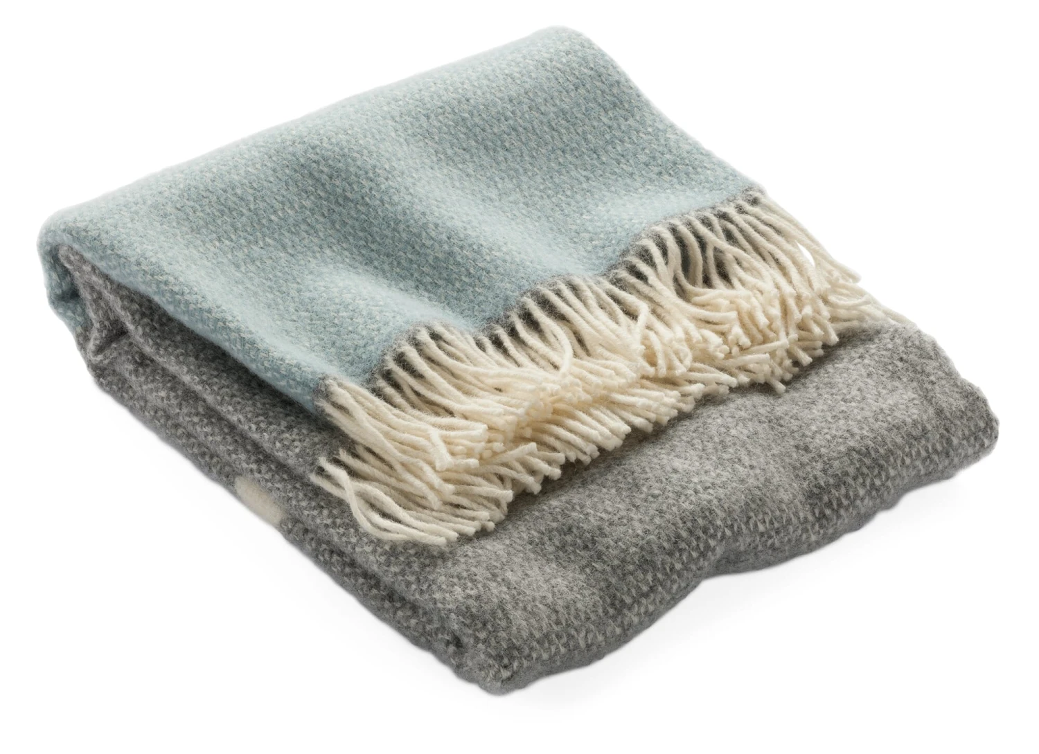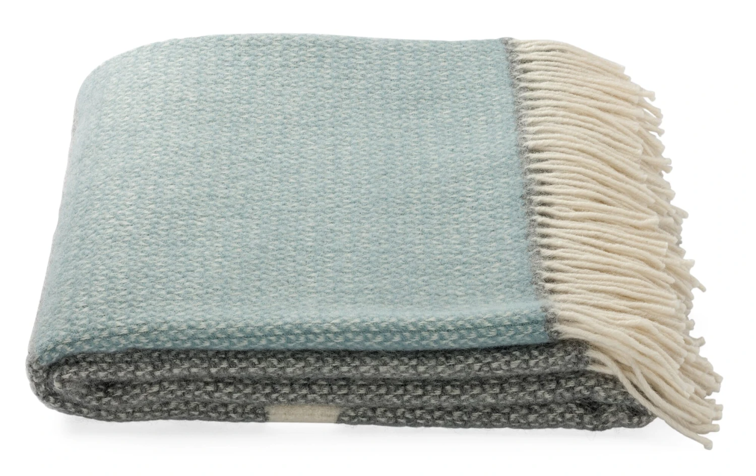 Dicht geweven deken van zacht wolgaren – met een brede kleurenstreep en gedraaide franjes. Het geweven patroon bestaat uit kleine driehoekjes die een ingehouden structuur van kleine pinwheels vormen. Dankzij het royale formaat kan de deken het best worden gebruikt als throw en warmer. Het wordt gemaakt in een Welsh familiebedrijf dat bekend staat om zijn bijzonder zorgvuldige en hoogwaardige afwerking.