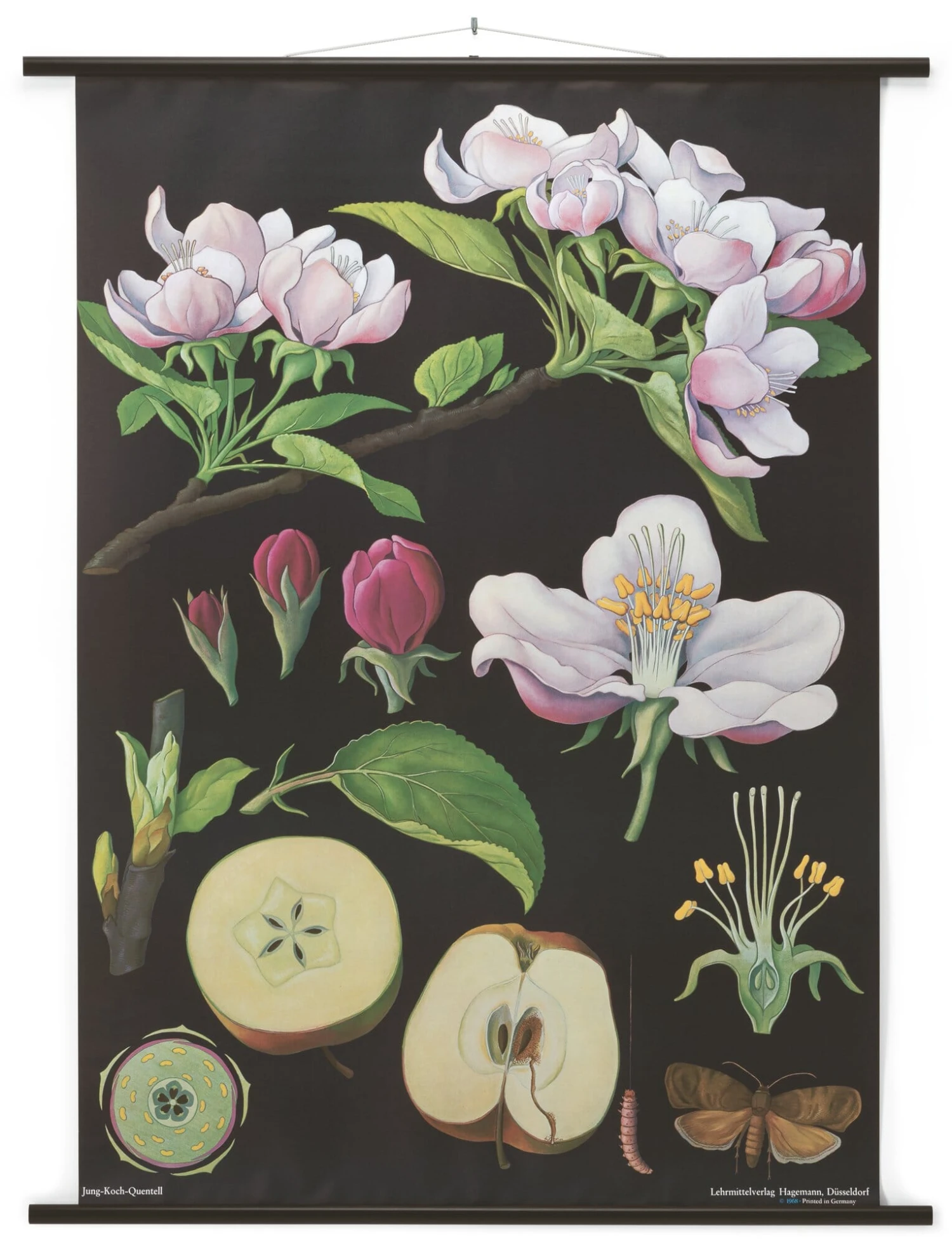 De schoolwandkaarten met gedetailleerde tekeningen van flora en fauna uit de Jung-Koch-Quentell-serie uit de jaren zestig zijn “oldschool” in de waarste zin van het woord en juist daarom echte retroklassiekers die ook in uw eigen vier muren fascinerende visuele objecten zijn. Tegen een zwarte achtergrond tonen de op canvasdoek gelamineerde posters belangrijke details en de afzonderlijke ontwikkelingsstadia van paardenbloemen, appelbomen en aardappelen met bijbehorende plagen zoals de fruitmot of de coloradokever. De educatieve borden zijn voorzien van stevige houten stangen aan de onderkant en een lus om ze op te hangen en komen toen en nu van de educatieve uitgeverij Hagemann Düsseldorf, die sinds 1929 verschillende media voor kleuterscholen en scholen aanbiedt.