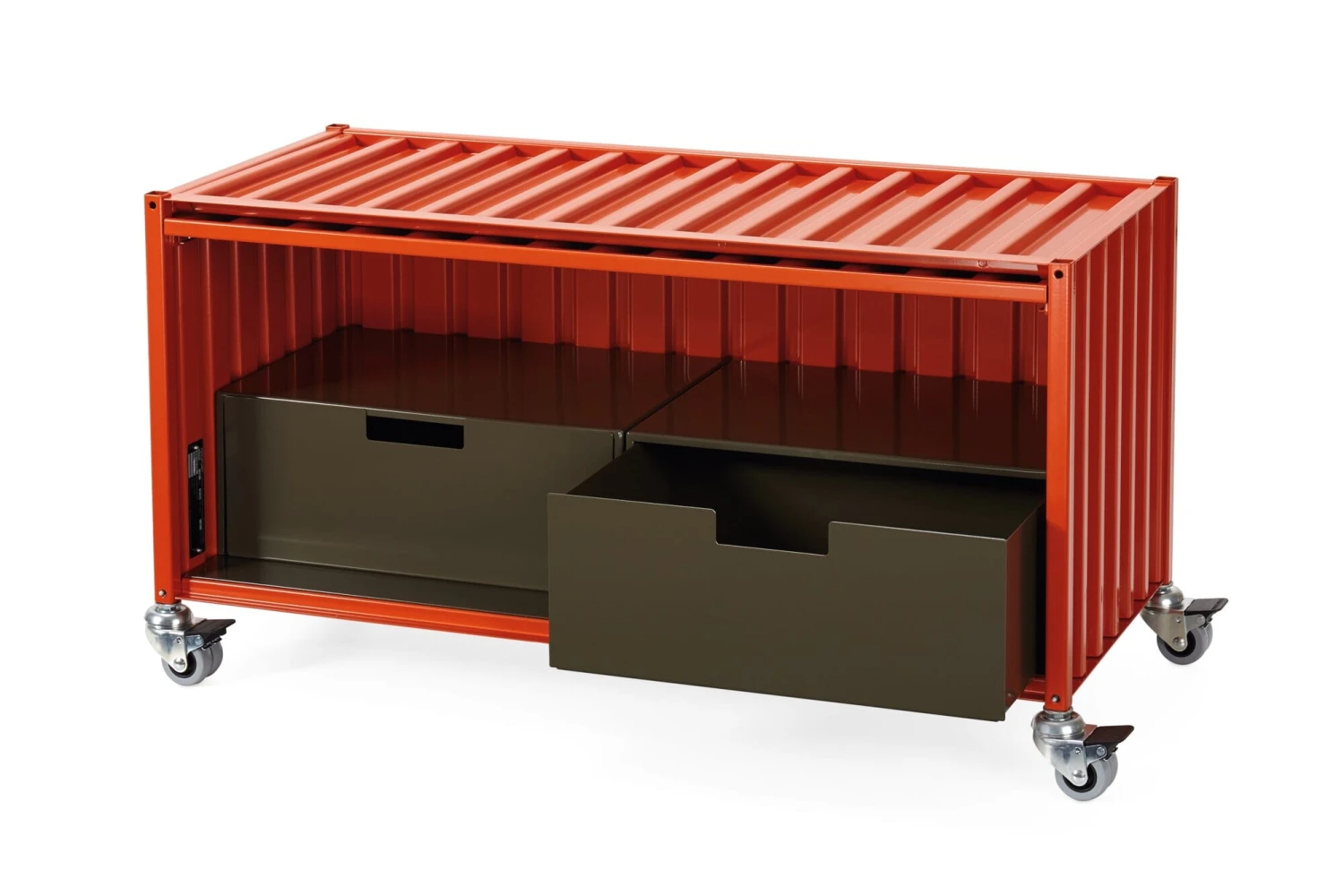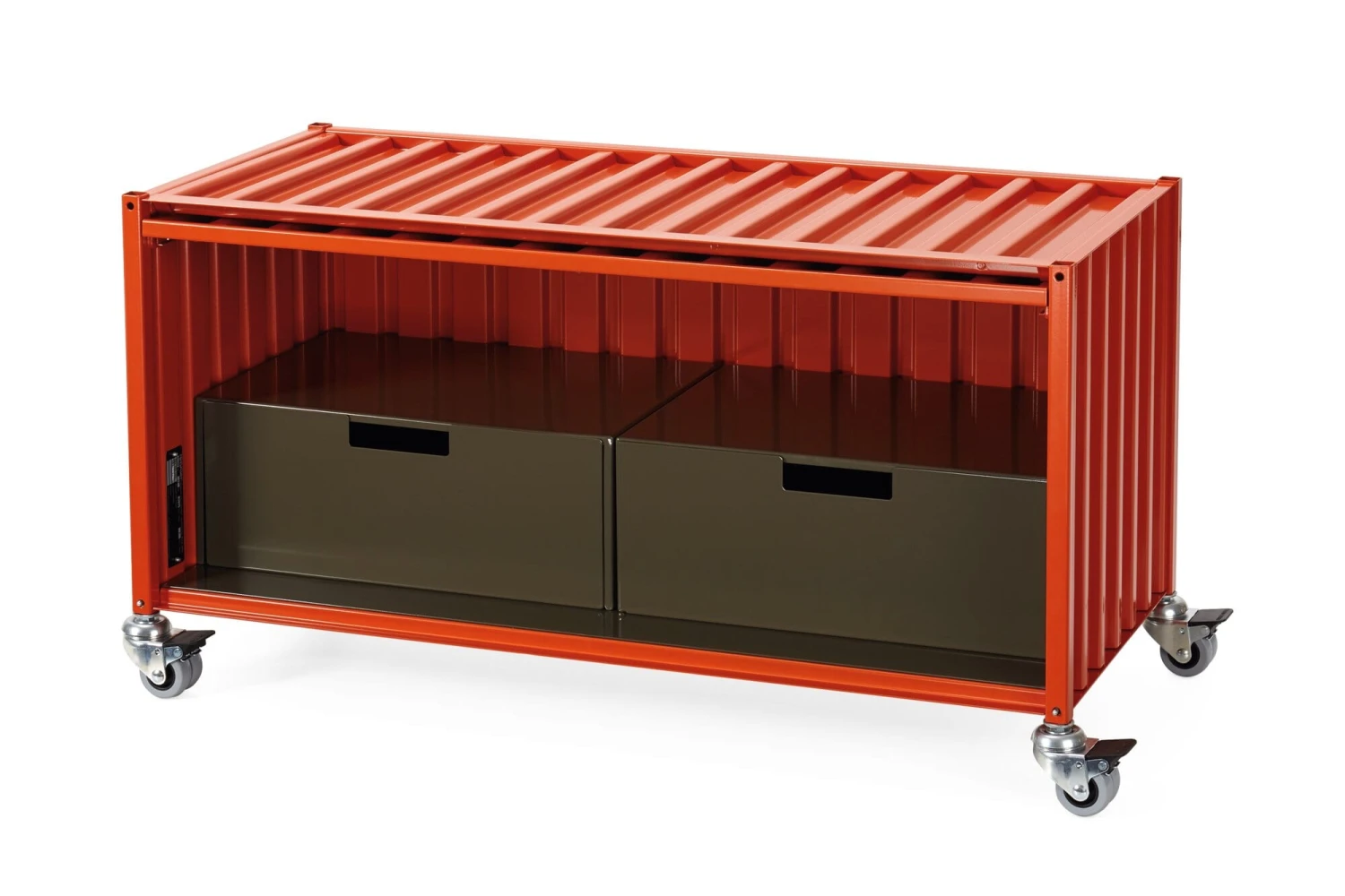 Synoniem voor opslag en transport: de container in zijn oervlak van gevouwen staal. Wij bieden dit kastmeubel in de geminiaturiseerde vorm van de overzeese container aan in vier verschillende uitvoeringen. Deze goed geproportioneerde opbergboxen dienen vele doeleinden en toepassingsgebieden. Alle containers hebben perforaties in de bodem om kabels door te voeren. Zowel de klassieke container als de platte en kleine containers hebben deuren die aan de bovenkant van de bak scharnieren, die bij het openen in de bovenkant van de bak schuiven en zo bijna volledig verdwijnen. De CONTAINER DS PLUS staat rechtop en heeft een conventionele scharnierende deur aan de zijkant.
