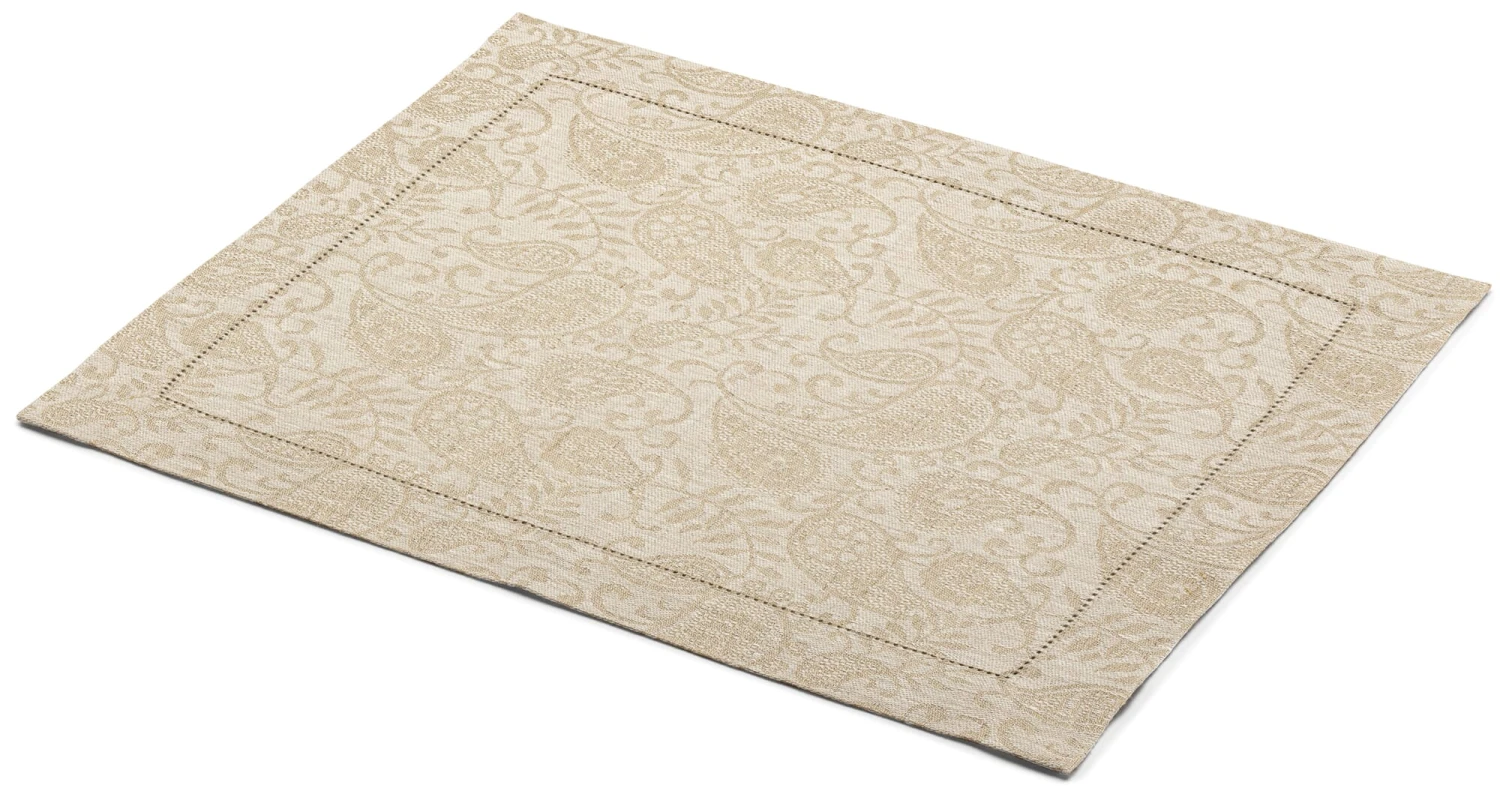 Het delicate paisleypatroon van deze zuivere linnen placemat is gemaakt op jacquardweefgetouwen. Het linnen wordt gemaakt van het beste Europese langvezelige vlasgaren, waardoor het weefsel zijn delicate, glanzende glans en lichte glans krijgt die typisch zijn voor goed linnen. Het gebruik van ongeverfd linnen in de ketting en geverfd garen in de inslag zorgt voor de blauwe achtergrond waartegen de natuurlijk gekleurde paisley prachtig afsteekt. Het naturel gekleurde patroon gebruikt het ongeverfde garen in de inslag. Rondom siert een handgemaakte zoomsteek de placemat, die even geschikt is voor de feesttafel als voor dagelijks gebruik, want linnen is vuilafstotend, gemakkelijk schoon te maken, uiterst duurzaam en gaat dus zeer lang mee. Vooral als u ervoor zorgt dat het nog vochtig is als u het strijkt – dat beschermt de stof en maakt het strijken gemakkelijker.