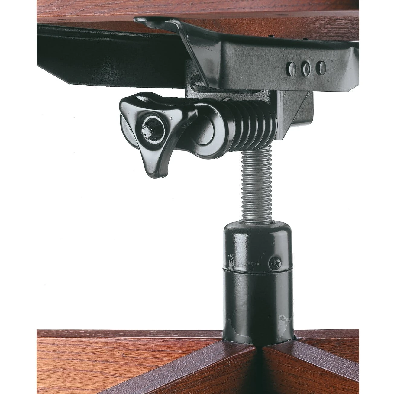Met wipmechanisme. Frame gemaakt van massief, braun gebeitst, blank gelakt eikenhout (herkomst USA). Zithoogte 42-50 cm, zitvlak B (voorzijde) 50 cm × 40 cm. Staand oppervlak ca. 79 cm Ø. Gemaakt in de VS. Totale hoogte 81-89 cm. Gewicht 21 kg. Max. belasting 135 kg.