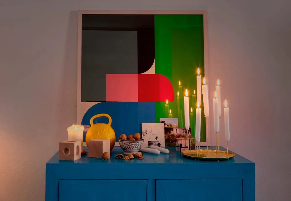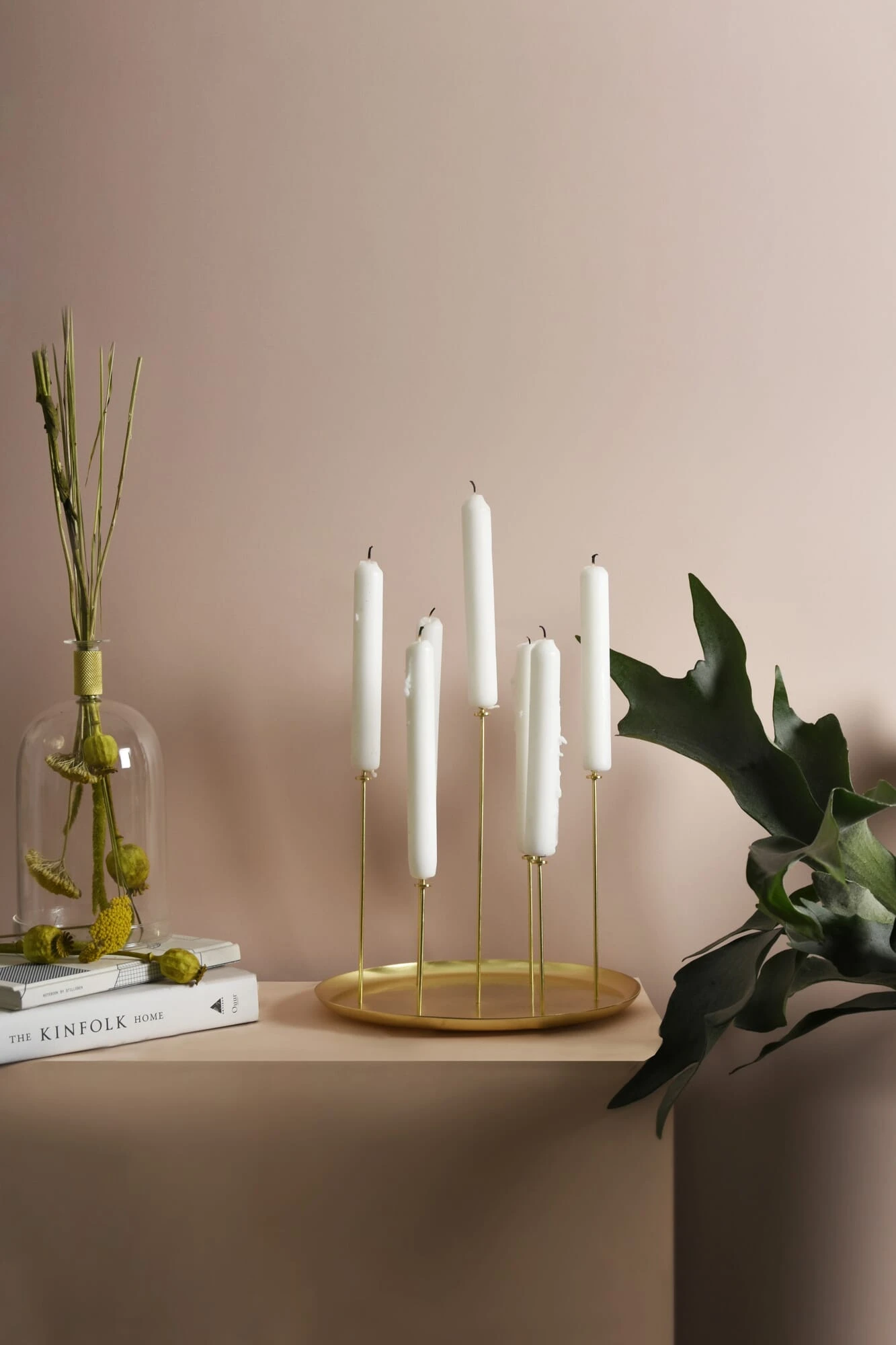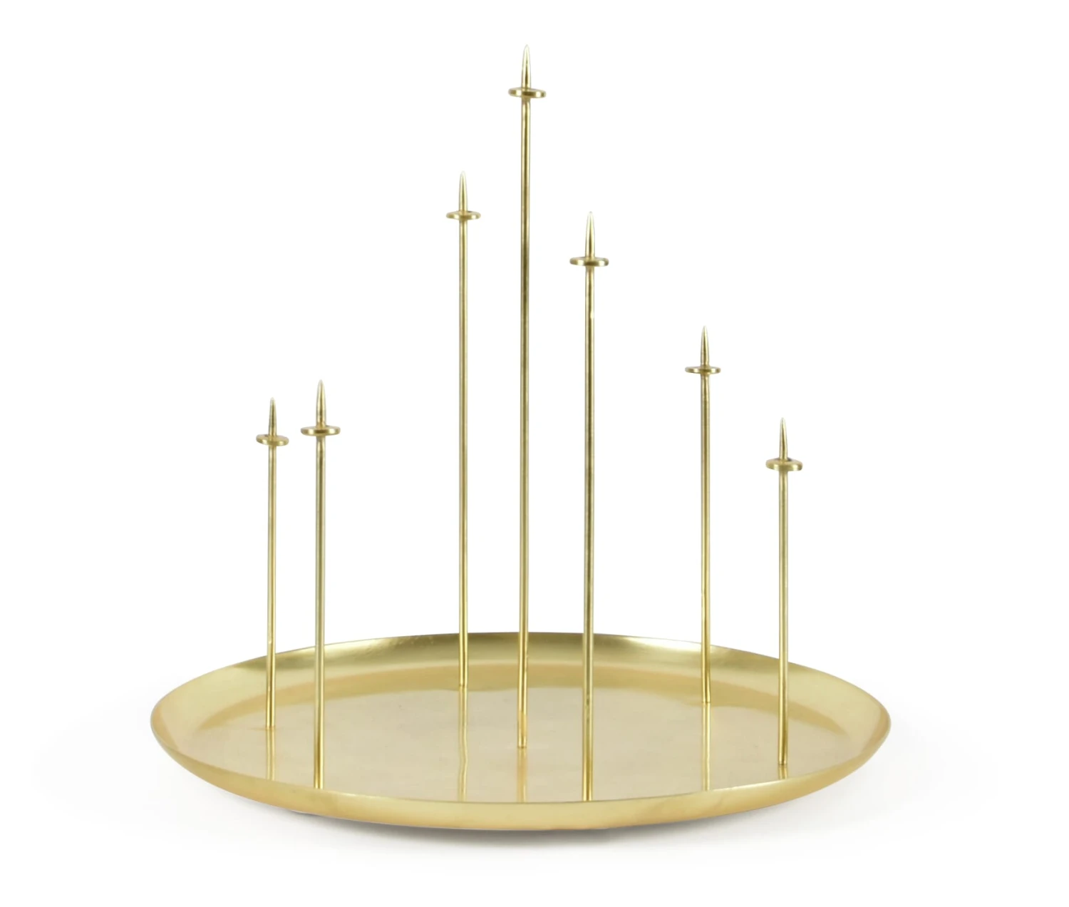 Zeven messing pinnen, stevig verbonden met een messing plaat, dragen kaarsen van verschillende hoogte en diameter. Druipende was kan gemakkelijk van de plaat worden verwijderd. Levering zonder kaarsen.