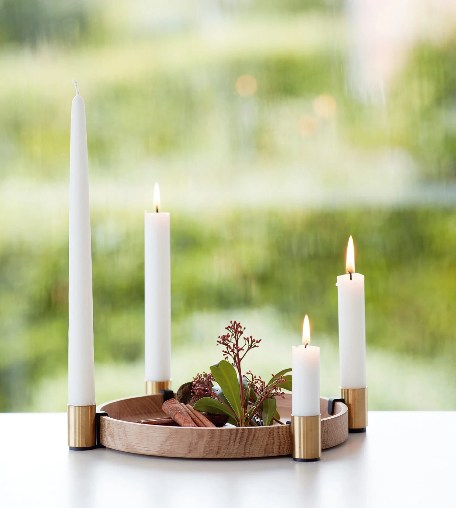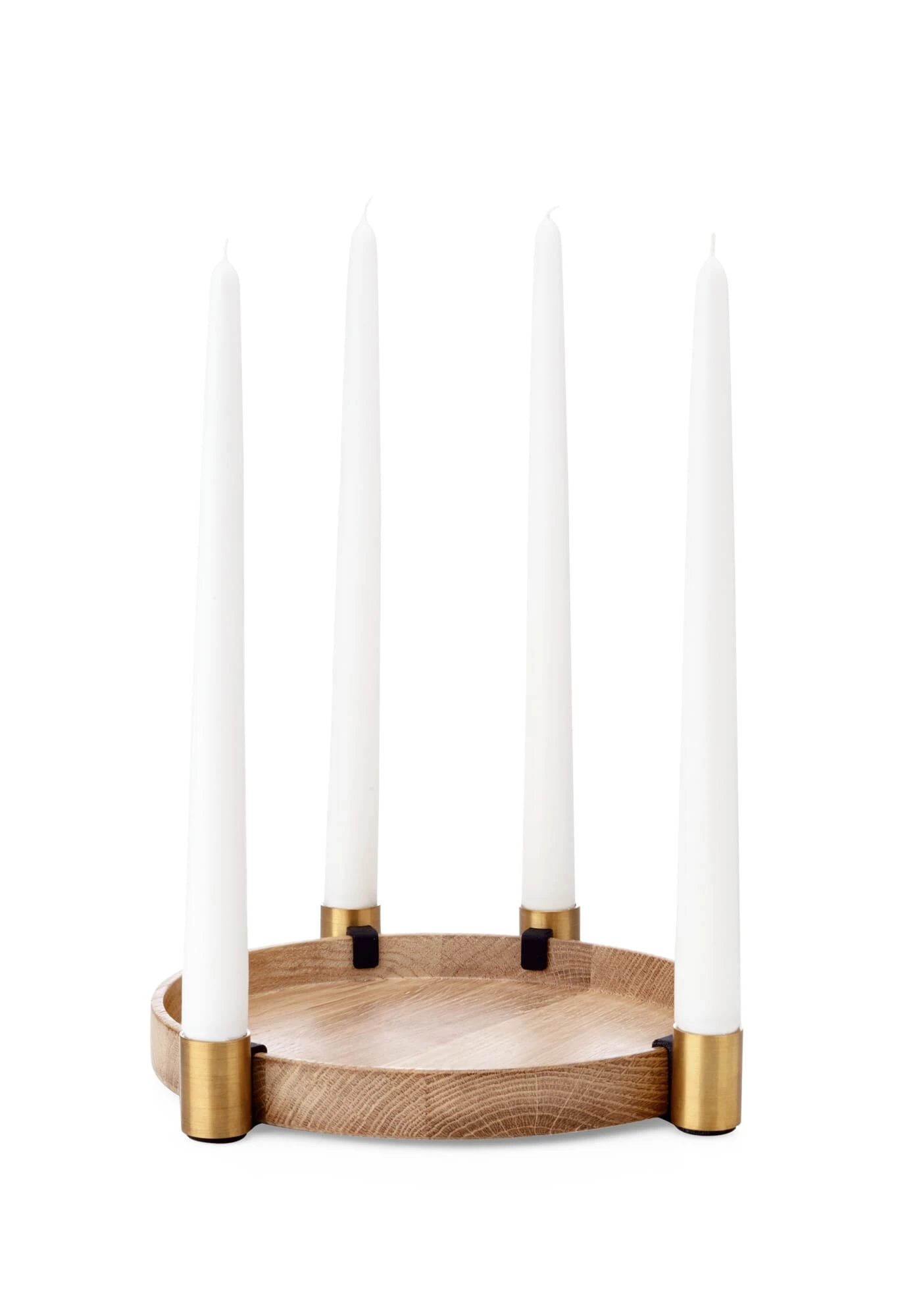 Afmetingen: Dienblad: Ø 22 cm (incl. kaarsenhouder: Ø 27) × H 3,7 cm. Kaarsenhouder: Ø 27) × H 3,7 cmGewicht: 380 gMateriaal: Eiken, natuurlijk (herkomst: Noord-Europa), houder: kunststof; staal, gepoedercoat resp. BrassDesign: Anders Nørgaard