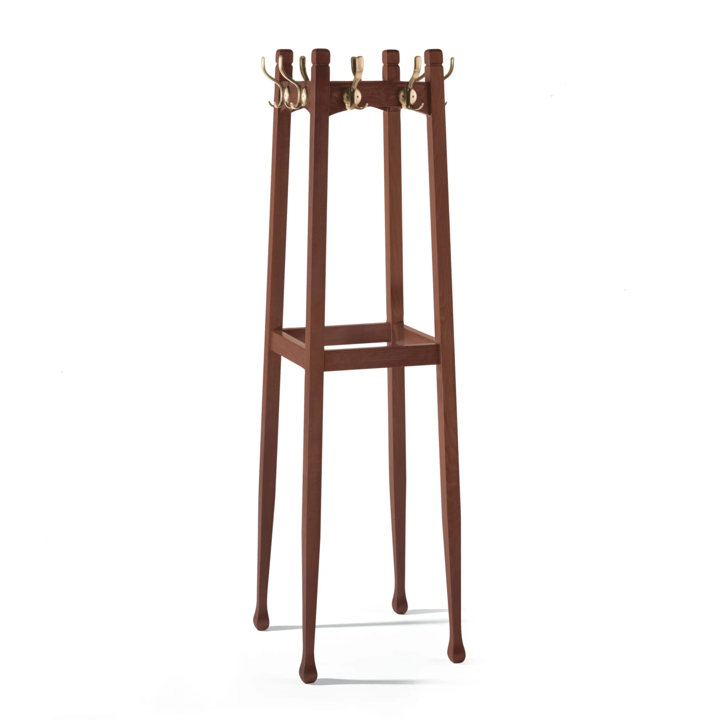 Kapstok, massief beukenhout, gebeitst en blank gelakt. Acht jashaken van gepolijst gegoten messing. Hoogte 180 cm, breedte 50 cm, diepte 50 cm. Gewicht 13 kg.