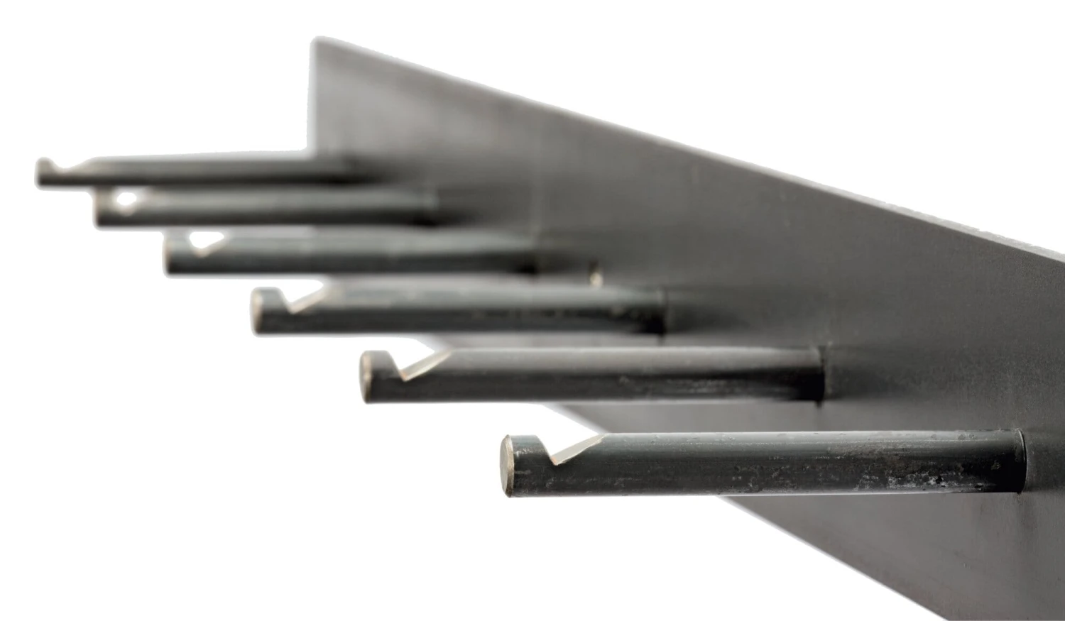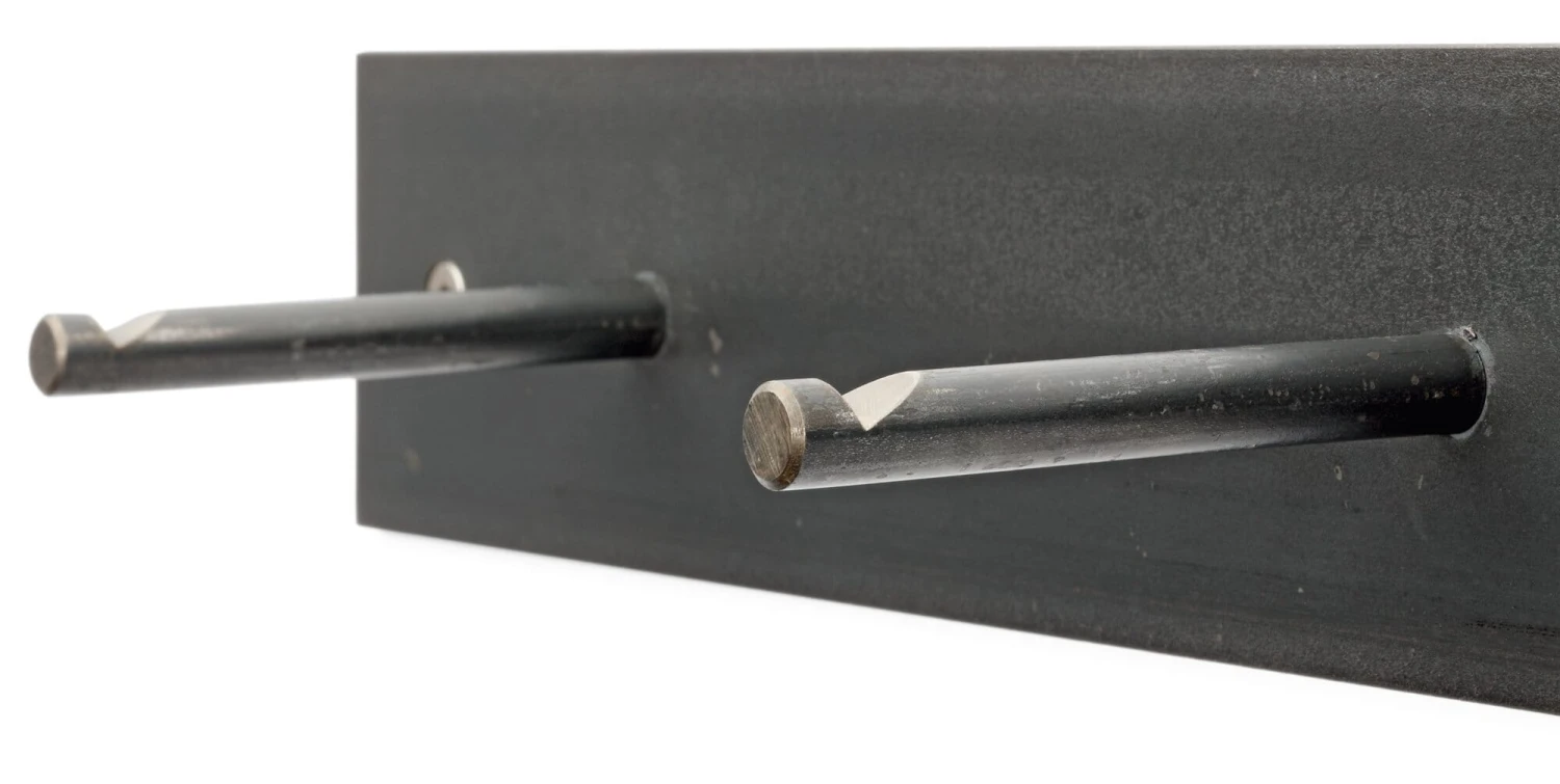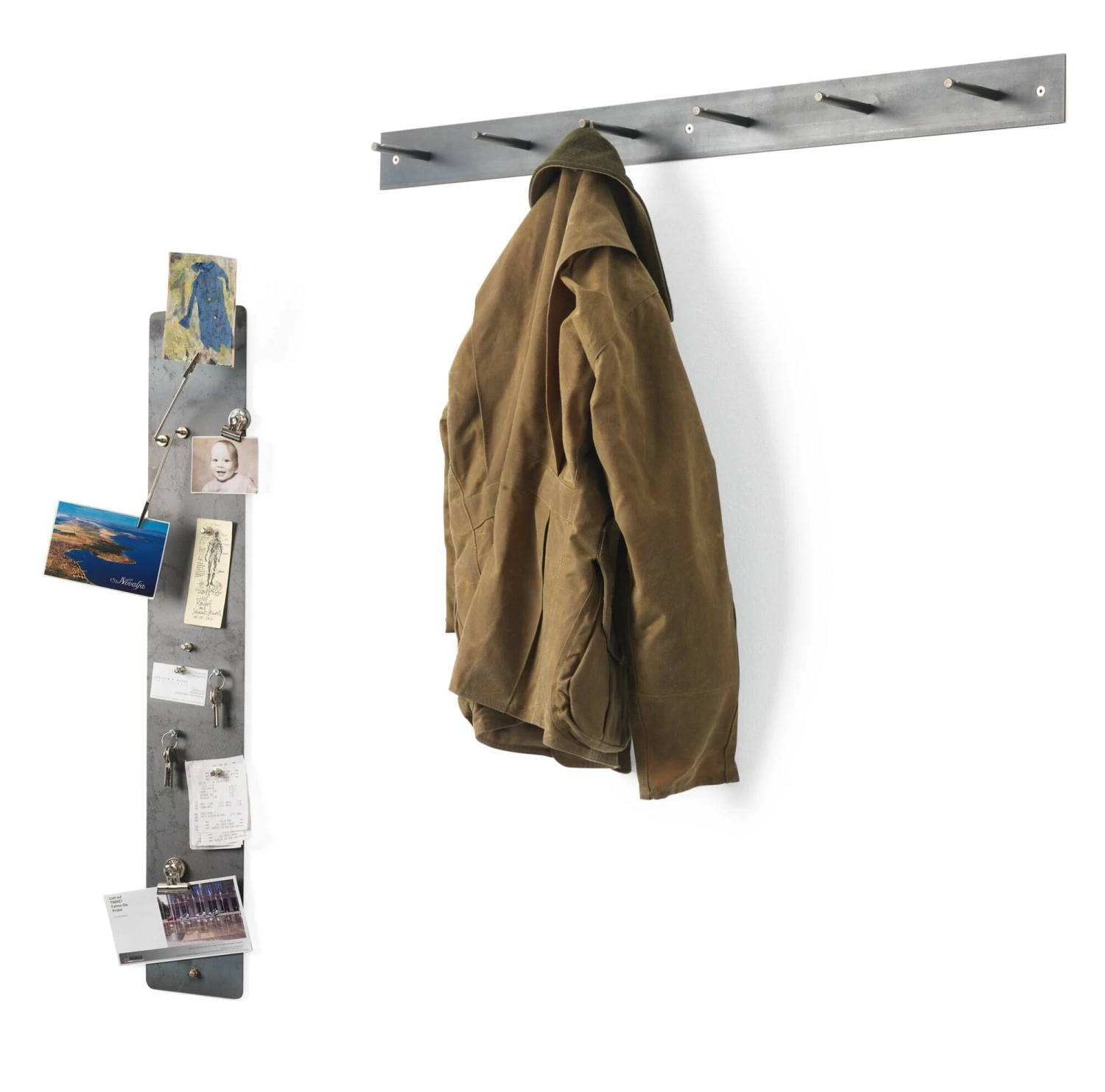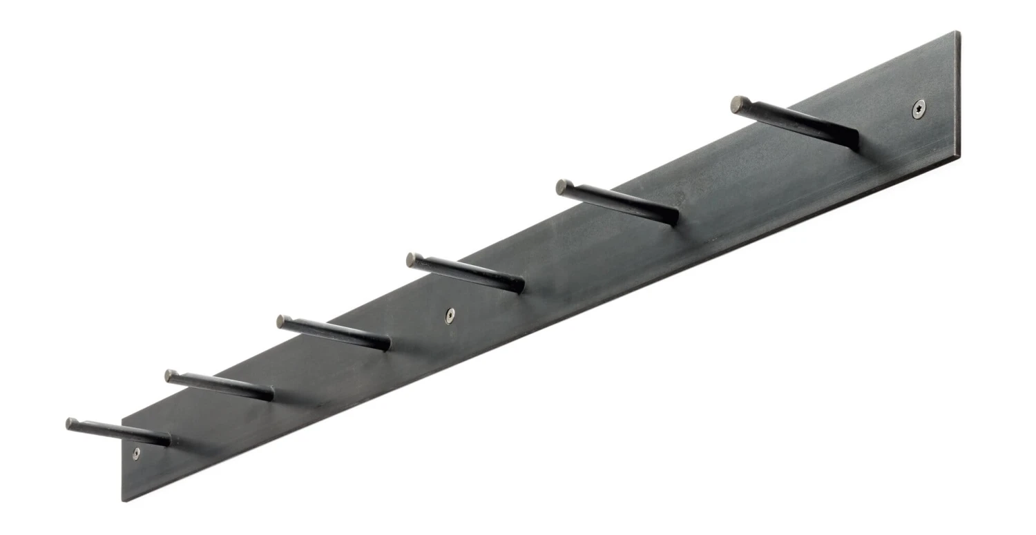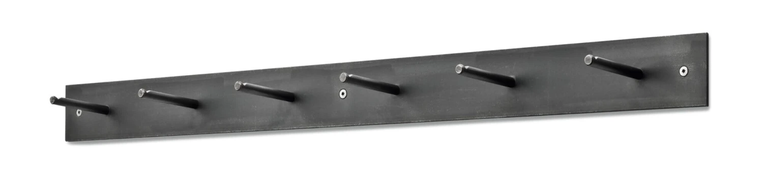 Het kan bijna niet kleiner en tegelijkertijd functioneler. Deze kapstok bestaat uit een stuk plat staal en zes gekerfde ronde staven als haken. Zij zijn zo bevestigd dat zelfs wanneer twee of meer van deze kapstokken naast elkaar worden gemonteerd, de afstanden tussen de haken altijd dezelfde zijn. Het materiaal is niet roestvrij, maar het ruwe staal is geolied. Roest is dan ook geen probleem buiten vochtige ruimtes. Uit Duitsland.