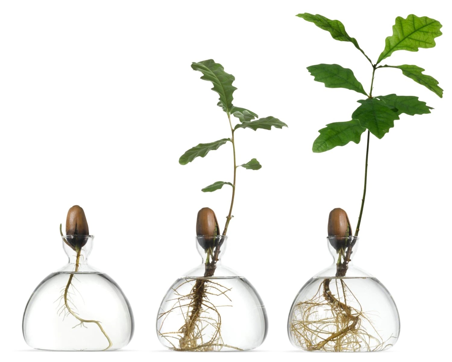 Voor stadsbewoners, natuurliefhebbers en nieuwsgierige kinderen: gevormde vaas van borosilicaatglas in twee verschillende maten – ideaal als eikel- en avocadopotten. De waterbak geeft het wortelstelsel veel ruimte om zich te ontwikkelen en biedt zicht op de ontstane groei.