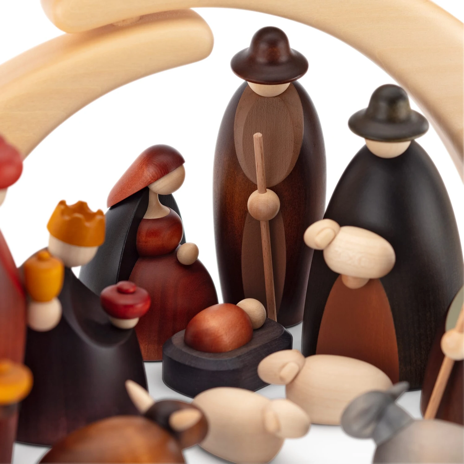 Lindehout, gedeeltelijk gebeitst en blank gevernist. 14-delige kerststal, bestaande uit een 2-delige kerststalboog (H 18/14 × B 44/32 cm) en 12 kerststalfiguren: Maria, Jozef en kindje Jezus in de wieg, Wijzen, 2 herders met 2 schapen, os en ezel. Hoogte van de staande figuren max. 11,5 cm, hoogte van de knielende figuren max. 7,6 cm. Totaal gewicht 960 g.