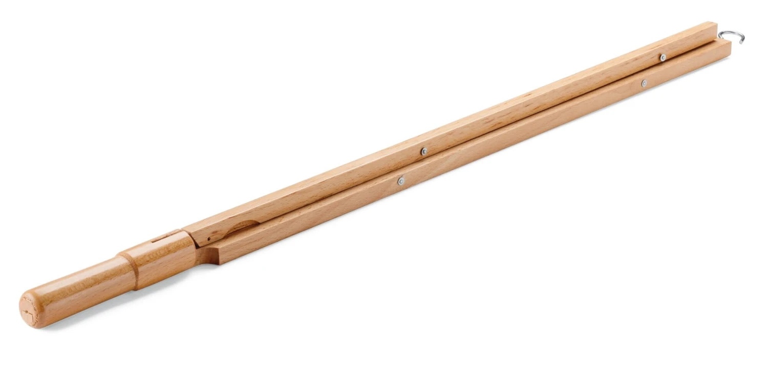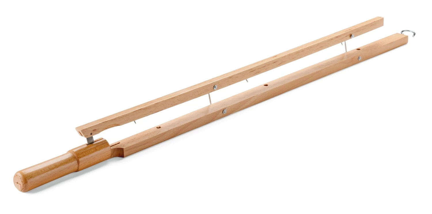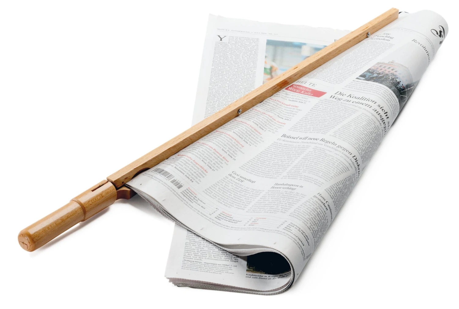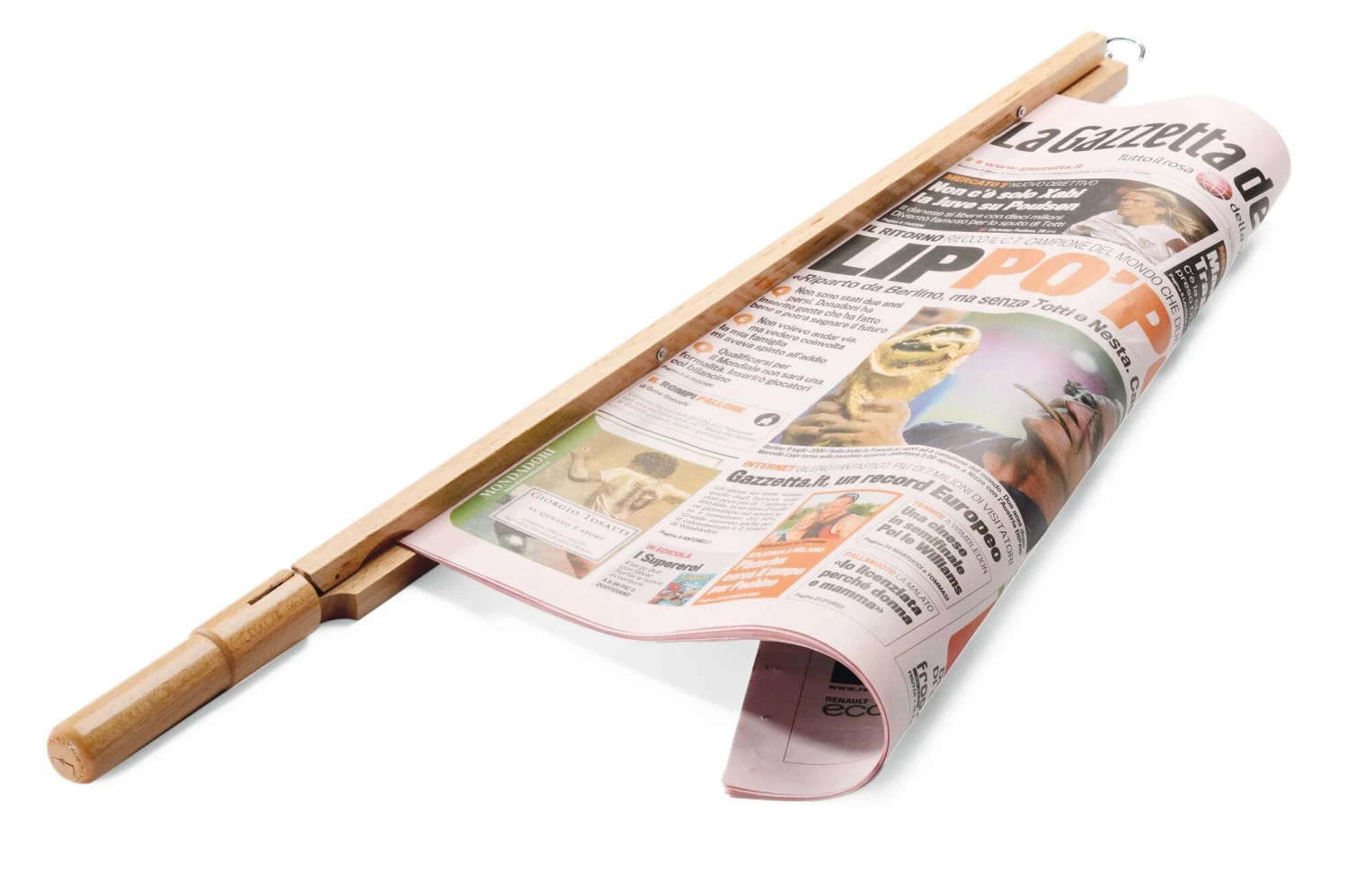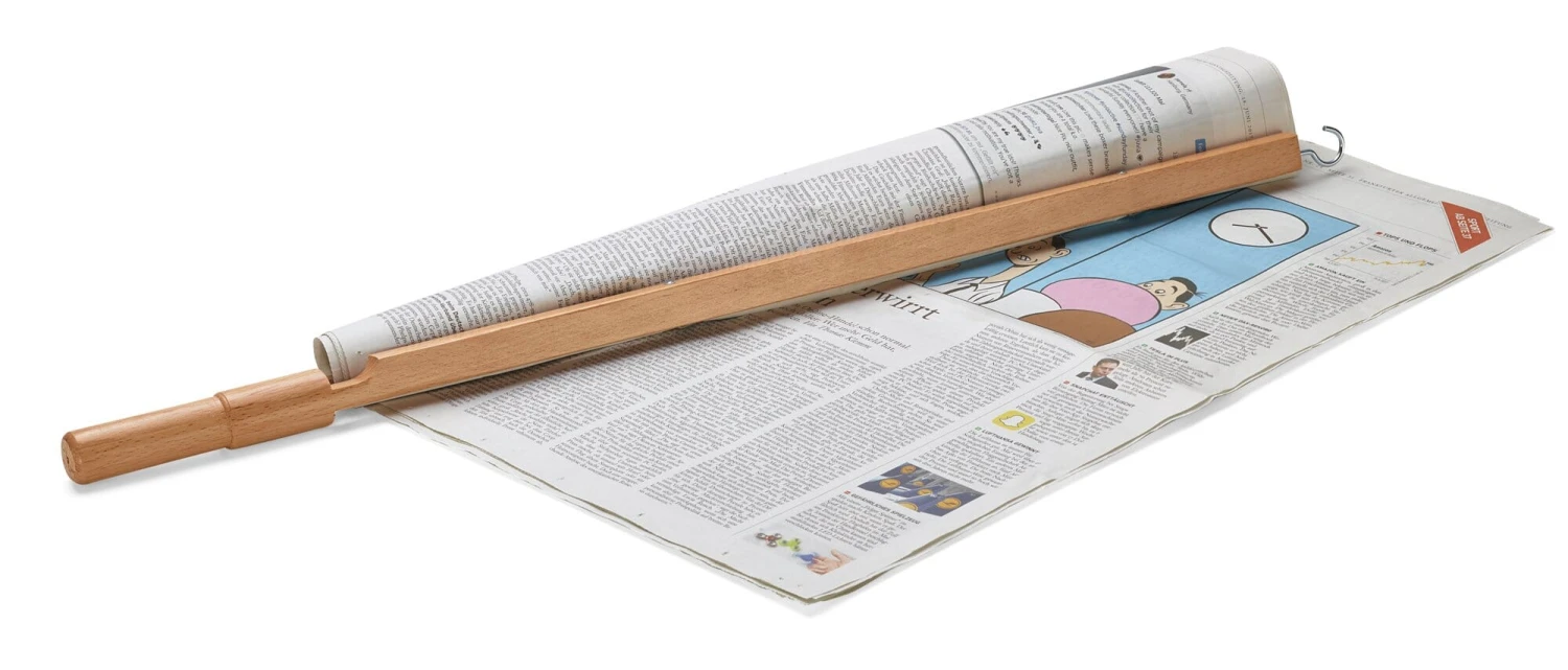 Massief beukenhout, stalen klemmechanisme en schroefhaak. Geschikt voor kranten tot 57 cm (“Scandinavisch formaat”, bijv. Zeit, FAZ, Süddeutsche). Lengte met haak 74 cm. Gewicht 240 g. Levering zonder krant.