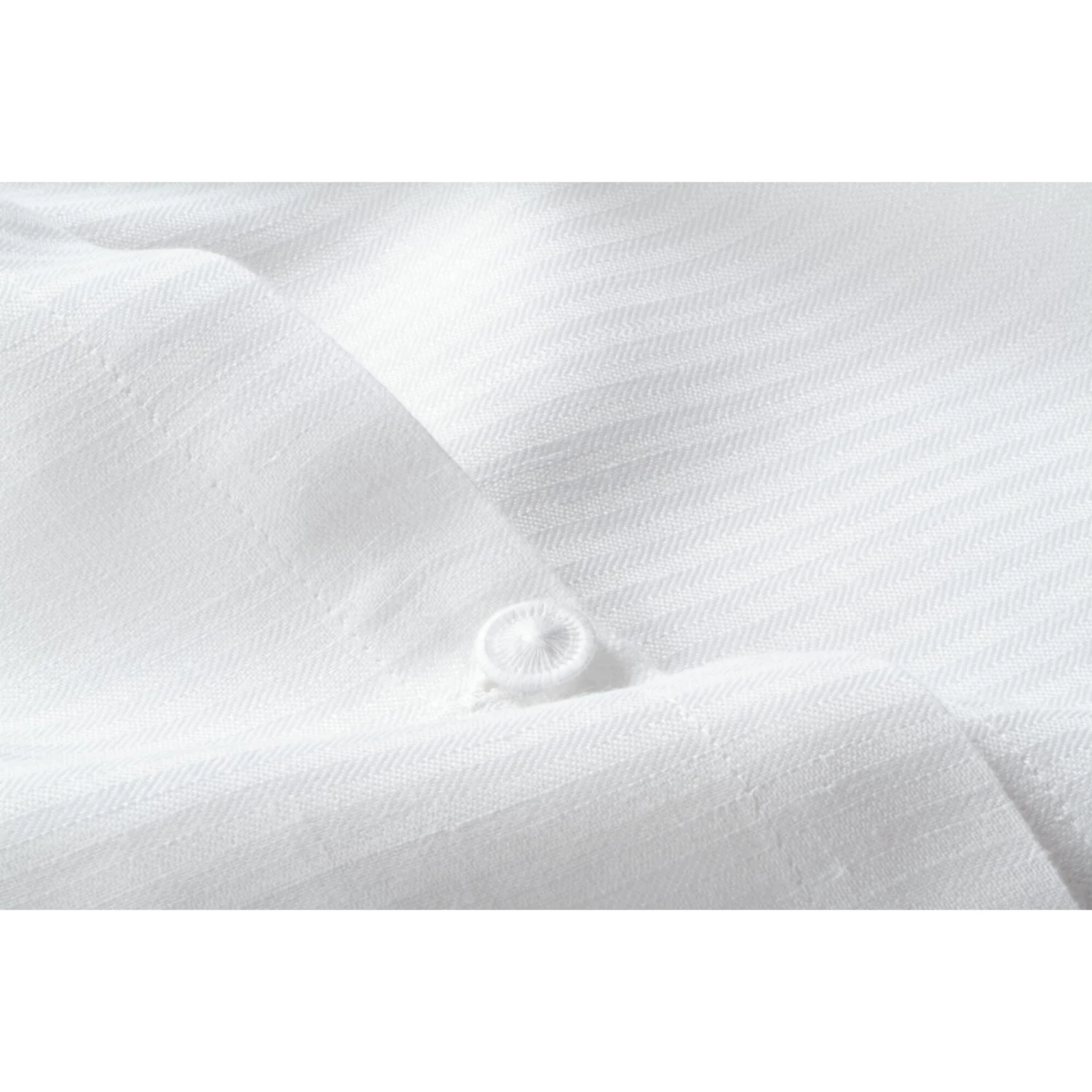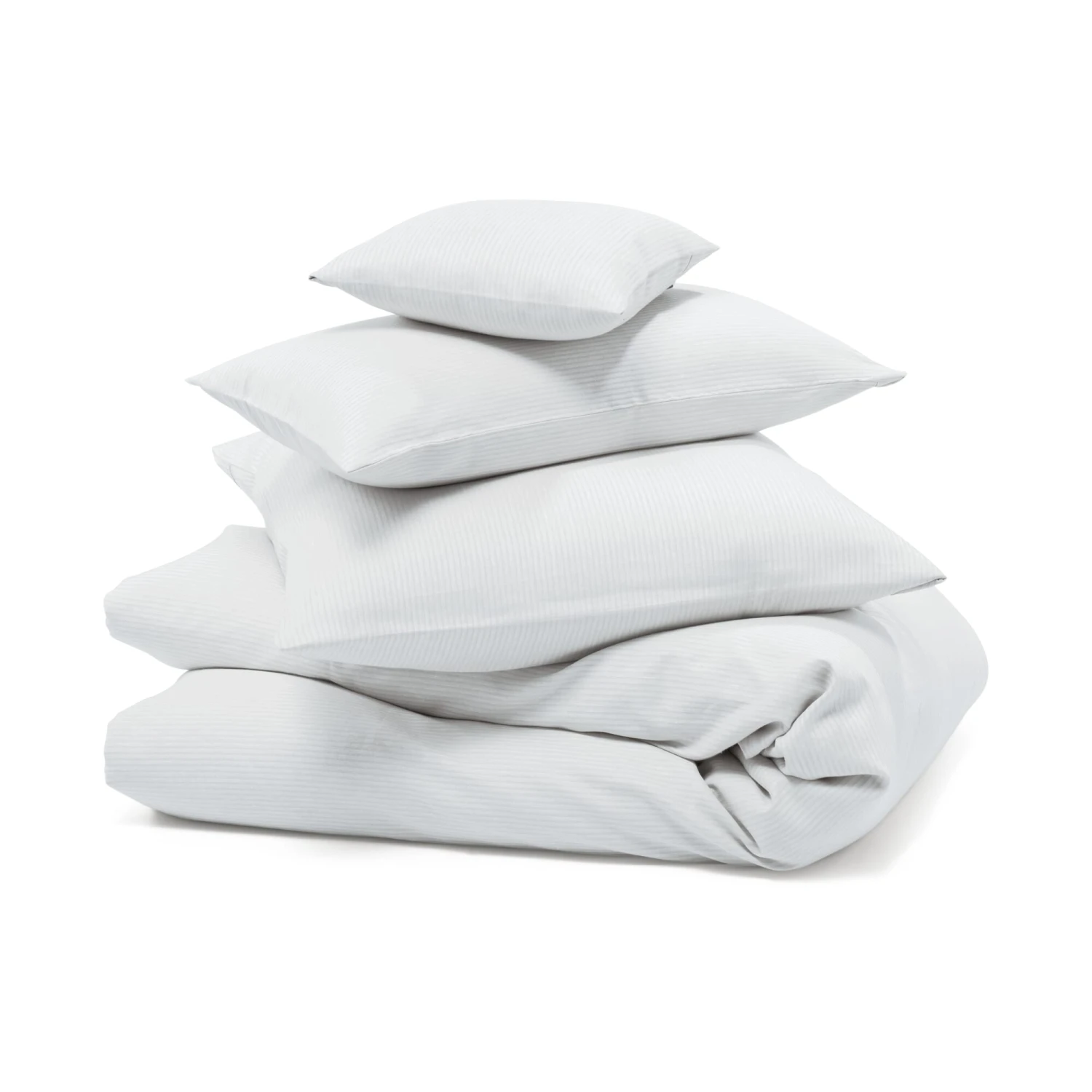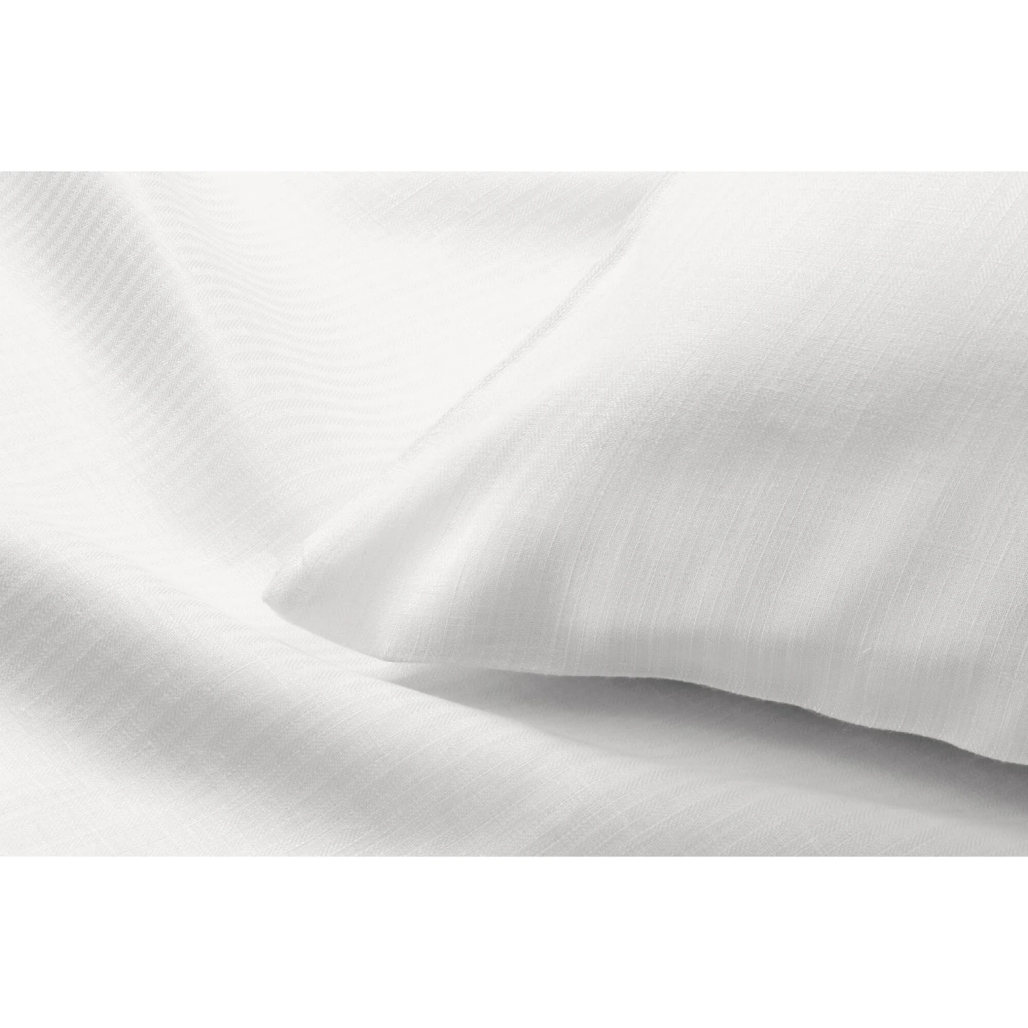 100% zuiver linnen van langvezelig vlas, herkomst Europa, geweven in keperbinding. Basisgewicht 134 g/m². Garengetal in de schering Nm 30, in de inslag Nm 36. Machinewas tot 95 °C voor de witte was, tot 60 °C voor de lichtblauwe was. Trek in vorm terwijl het nog vochtig is. Niet centrifugeren en niet in de droger drogen. Alle covers hebben met garen omwikkelde gedraaide knopen. Gemaakt in Oostenrijk.