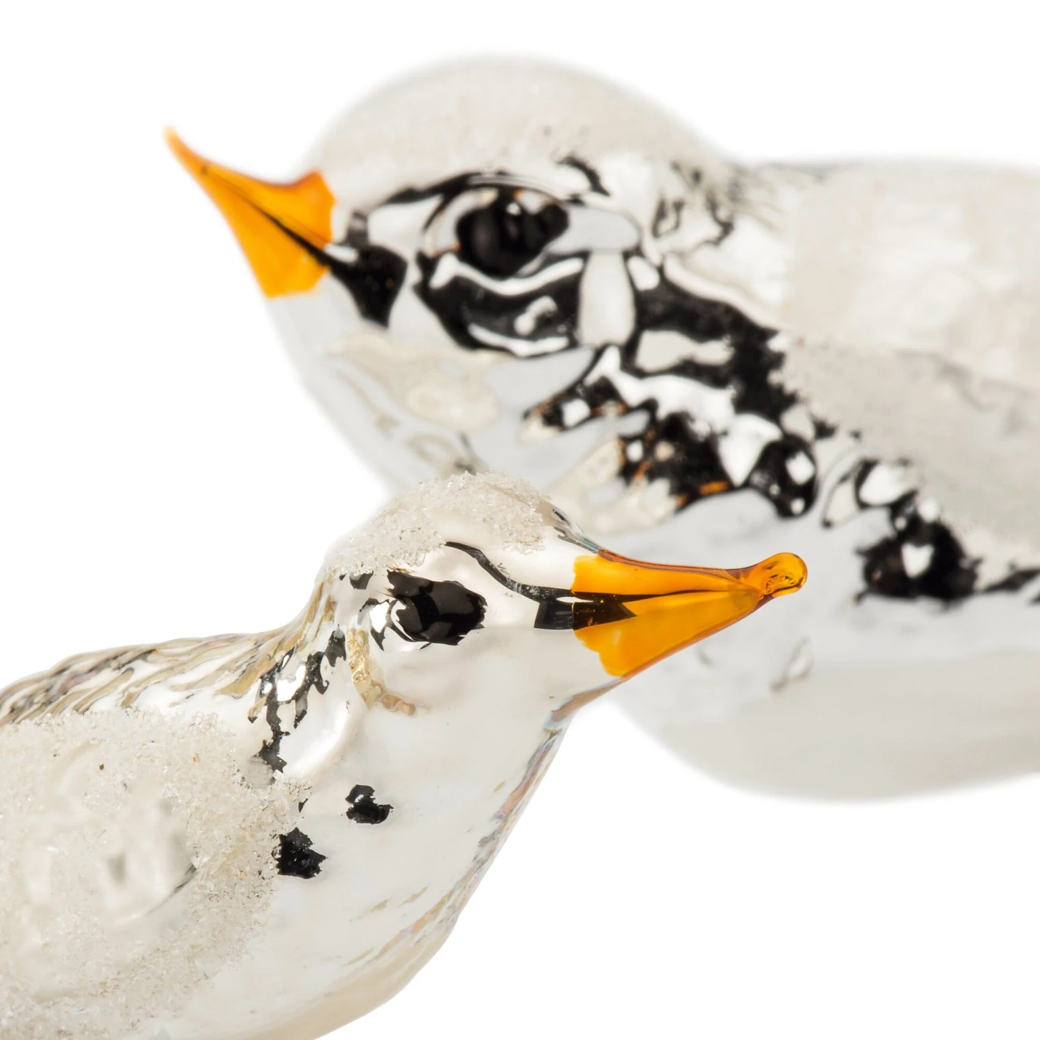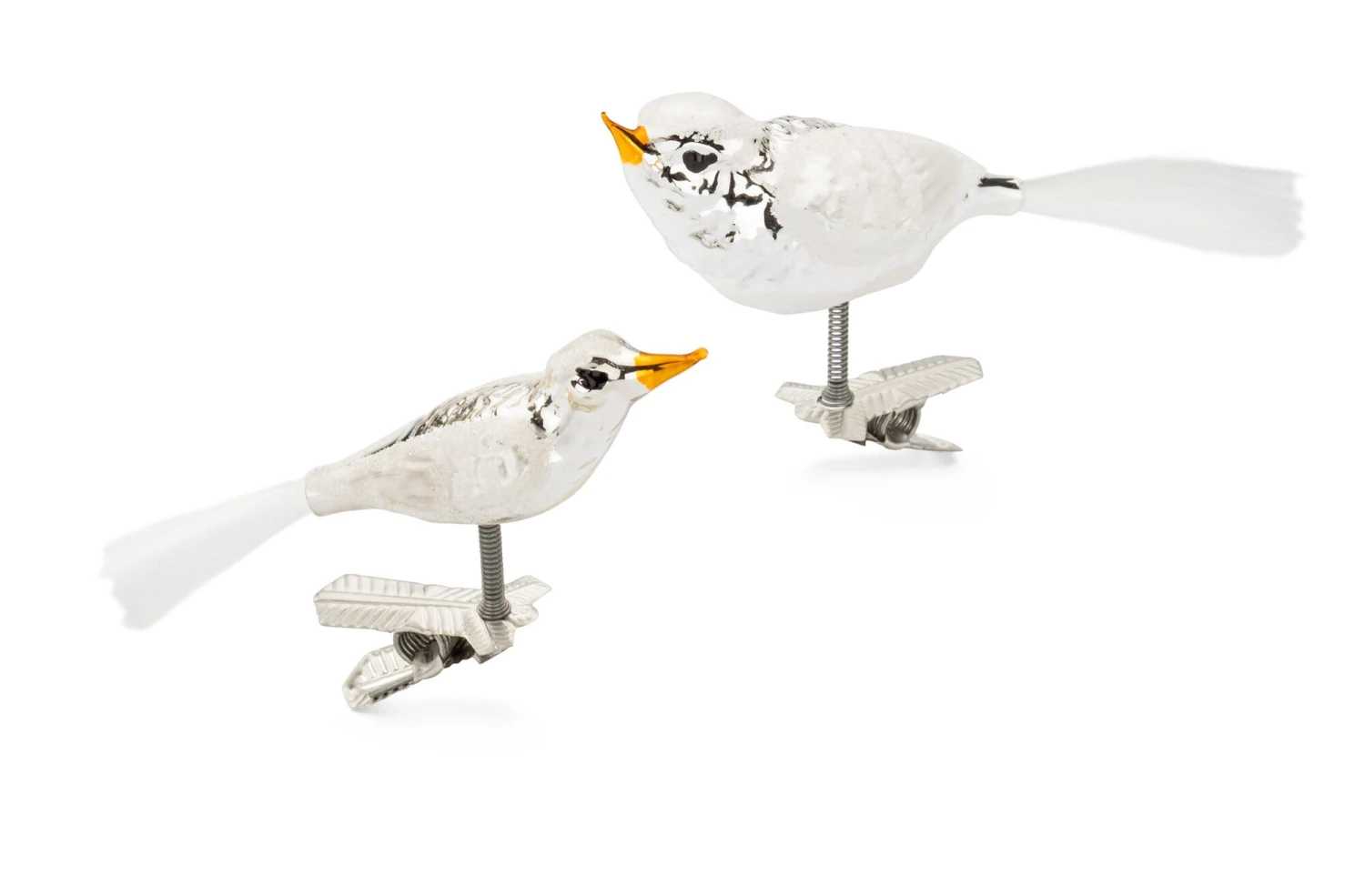 Vormgeblazen glas, met de hand beschilderd en versierd met mica. Metalen veren met klem, staartveren van glasvezel.Grote vogel lengte 12,5 cm, breedte 3 cm, hoogte 5 cm. Gewicht 9 g.Kleine vogel lengte 9,2 cm, breedte 2,2 cm, hoogte 4 cm. Gewicht 6 g.