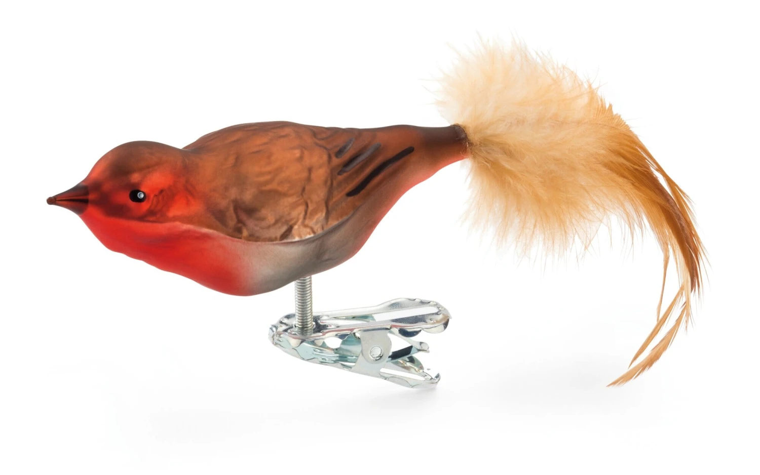 Het Lauscha roodborstje van glas is geblazen in een tweedelige negatieve mal van keramiek, artistiek met de hand beschilderd in roodtinten en Braunen versierd met een echte kippenveer. Het vogeltje hobbelt op een metalen veer.
