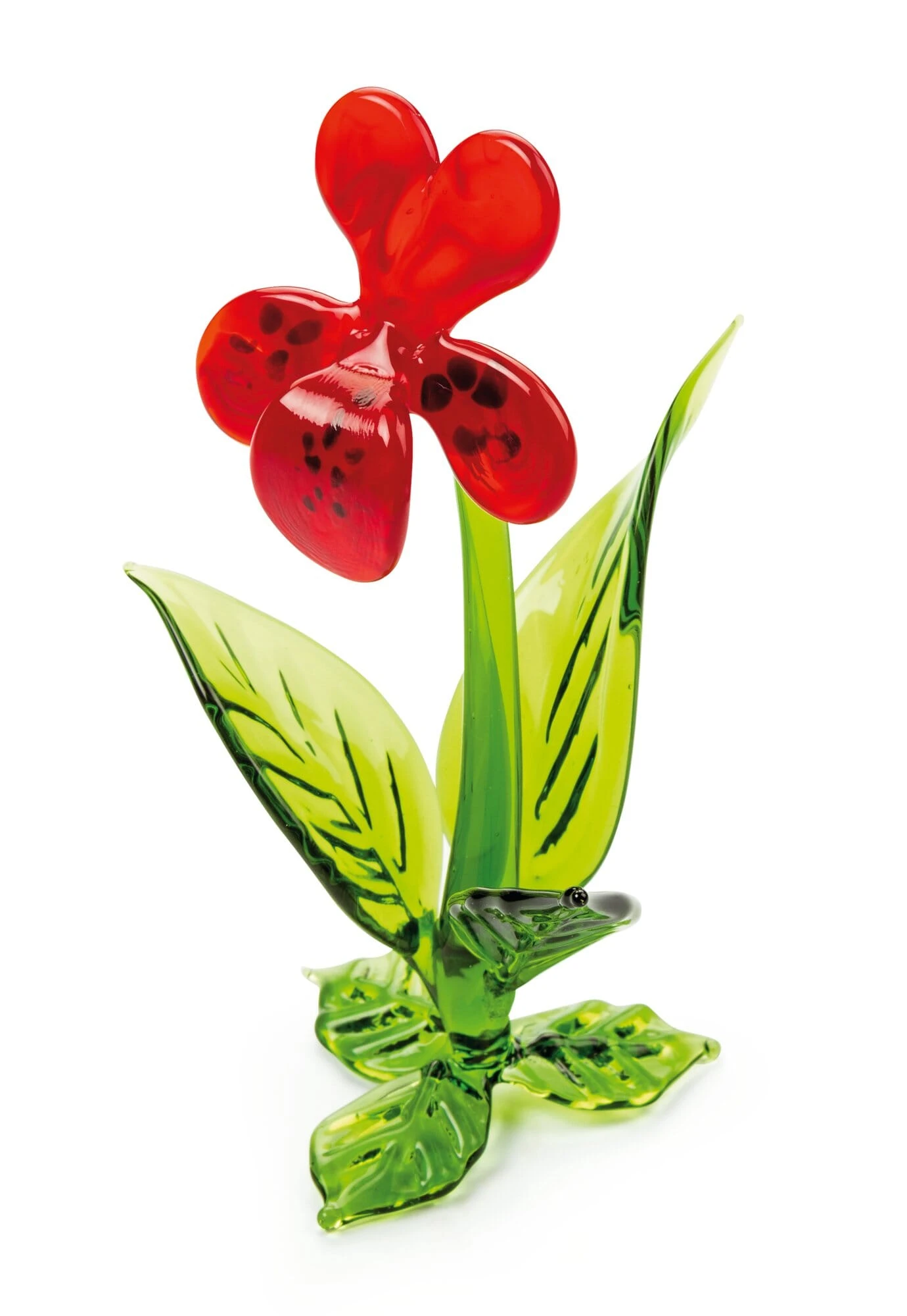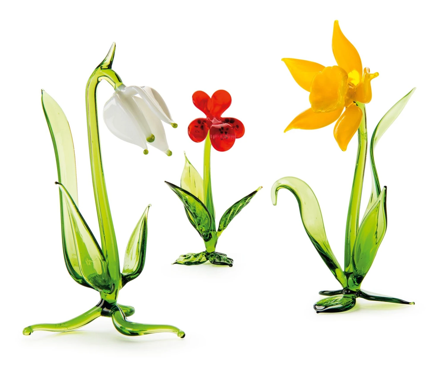 Voor deze werken gebruiken de glasblazers van Lauscha staven massief gekleurd glas. De gekleurde glasstaven worden eerst met de hand getekend in hun eigen atelier, en de glasblazers gebruiken deze blanco’s om de onderdelen van de bloem te modelleren. Stengels, bloemblaadjes en bladeren worden afzonderlijk in de genoemde volgorde bewerkt en vervolgens samengevoegd. Daartoe moet het glas tijdens het fabricageproces in een warme, viskeuze toestand worden gehouden.