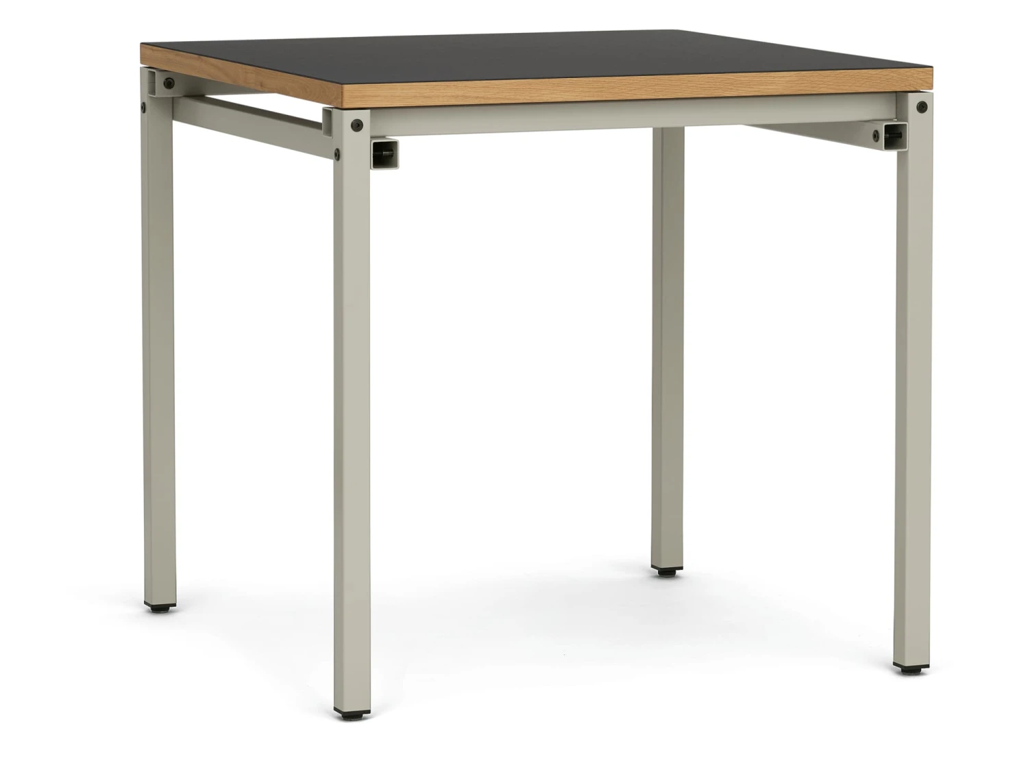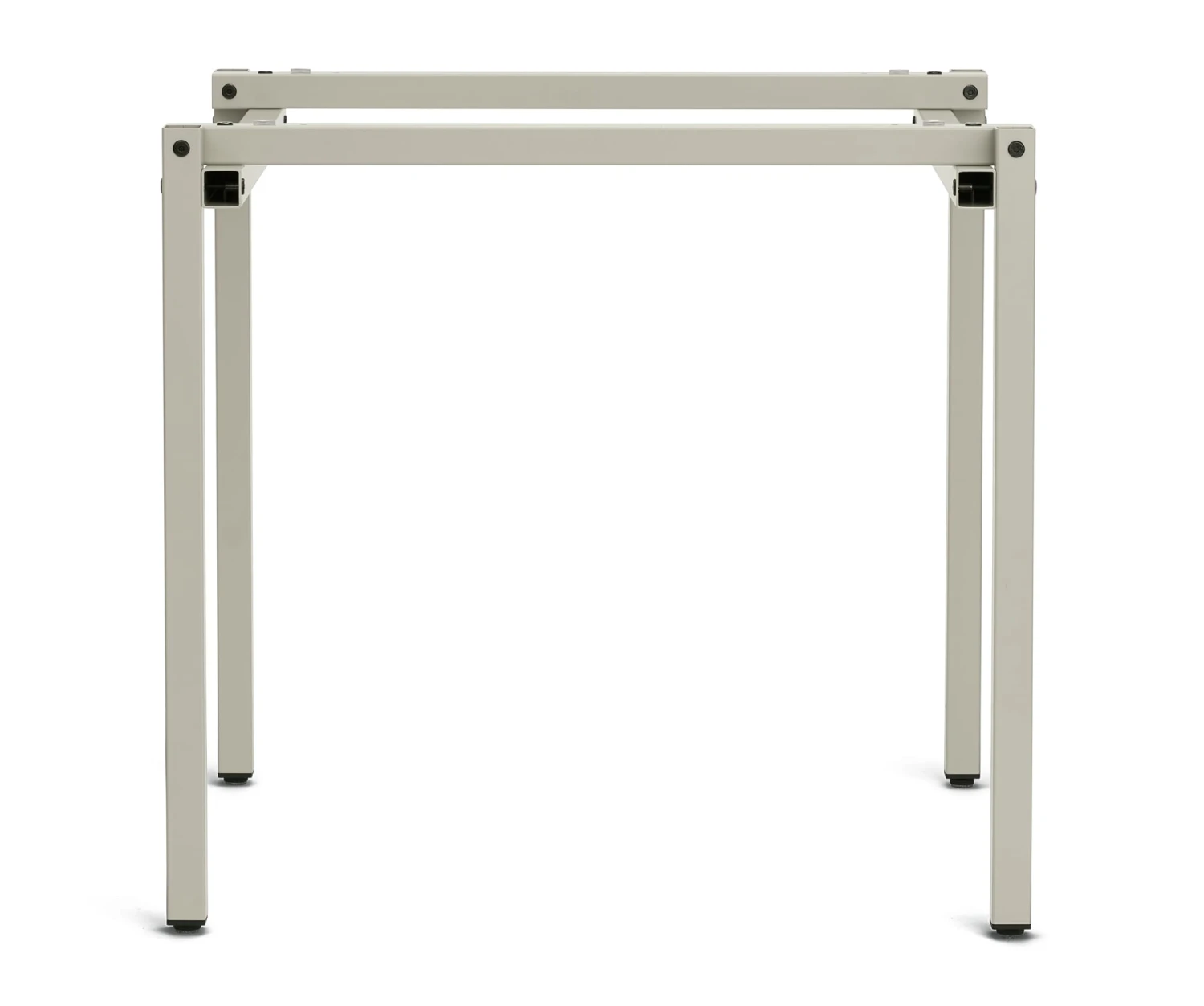 Hier in een vierkante uitvoering: ERIK – een veelzijdig tafelframe dat overtuigt door zijn stabiliteit. Het bestaat uit acht vierkante stalen buizen die op de hoeken kruislings aan elkaar zijn geschroefd. De poten aan de buitenkant creëren vrije voetruimte onder elk te plaatsen tafelblad. Qua vormgeving bieden de vrij te kiezen afmetingen van de tafelbladen een grote verscheidenheid aan mogelijkheden: overhangend aan één of alle zijden, verzonken met dan zichtbare knooppuntconstructie of eindigend met de buitenranden van het frame. Voor deze laatste optie bieden wij een bijpassend tafelblad met een linoleumlaag in het formaat 77 × 77 cm. Bovendien kunnen alle denkbare tafelbladmaterialen en -varianten op de ERIK-tafelonderstellen worden geplaatst.Tafelonderstel ERIK ERIK is geschikt als onderstel onder werk-, atelier- of eettafels. In deze uitvoering bijvoorbeeld als kleine eettafel in de keuken of de horeca. Dankzij de boutverbinding kan de tafel ook tijdelijk worden gebruikt wanneer op korte termijn extra werk- of presentatieruimte nodig is. Een snelle verandering van locatie kan ook snel worden gerealiseerd. De buisvormige delen van het gedemonteerde frame kunnen ruimtebesparend worden opgeborgen. Wij waarderen het ontwerp van dit tafelframe, dat gemakkelijk kan worden gecombineerd en universeel kan worden gebruikt. De archetypische hoekconstructie is niet nieuw en oogt vertrouwd en sympathiek. Het is al eeuwenlang bekend, vooral als een houten constructie, gebruikt door generaties timmerlieden. Wij kennen het vooral van de ontwerpen van de Nederlandse timmerman en architect Gerrit Rietveld. Wij leveren het frame gedemonteerd, met rubberen steunen voor tafelbladen op de dwarsbalken, verstelbare poten voor de tafelpoten en eindkappen waarmee tafelbladen ook kunnen worden vastgeschroefd.