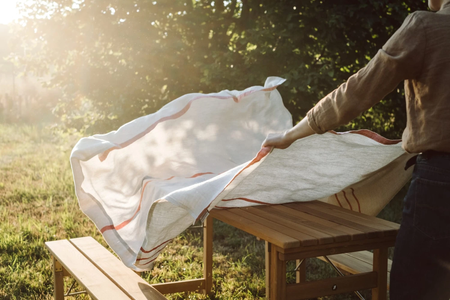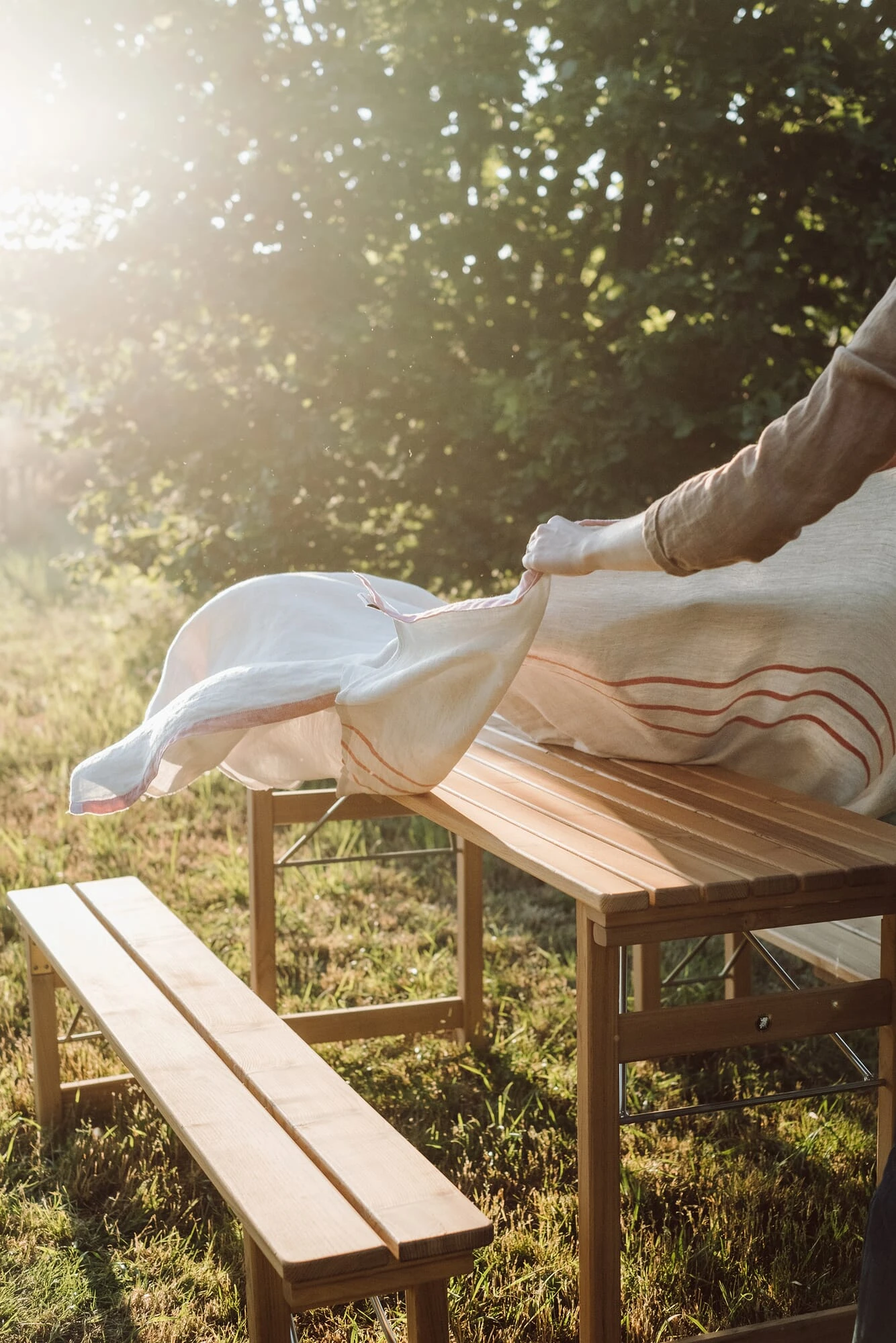 De Finse linnenwever Lapuan Kankurit weeft de basis van de deken van sterk, ongeverfd linnen, de strepen van geverfd linnengaren. Met een totaal gewicht van ongeveer 780 g is het niet te zwaar voor bagage, terwijl de stof sterk genoeg is om alle eisen van het reizen te weerstaan. Linnen is bijzonder aangenaam in de zomer, omdat het snel veel vocht kan opnemen en net zo snel weer kan afgeven – het voelt aangenaam koel aan, is ook antistatisch en dankzij het gladde vezeloppervlak pollen-, stof- en vuilafstotend. De doek is gesanforiseerd en voelt daardoor zacht en soepel aan.