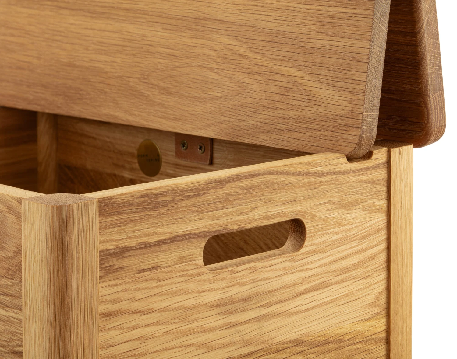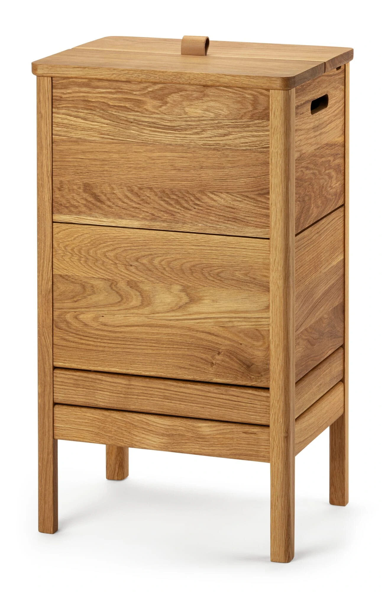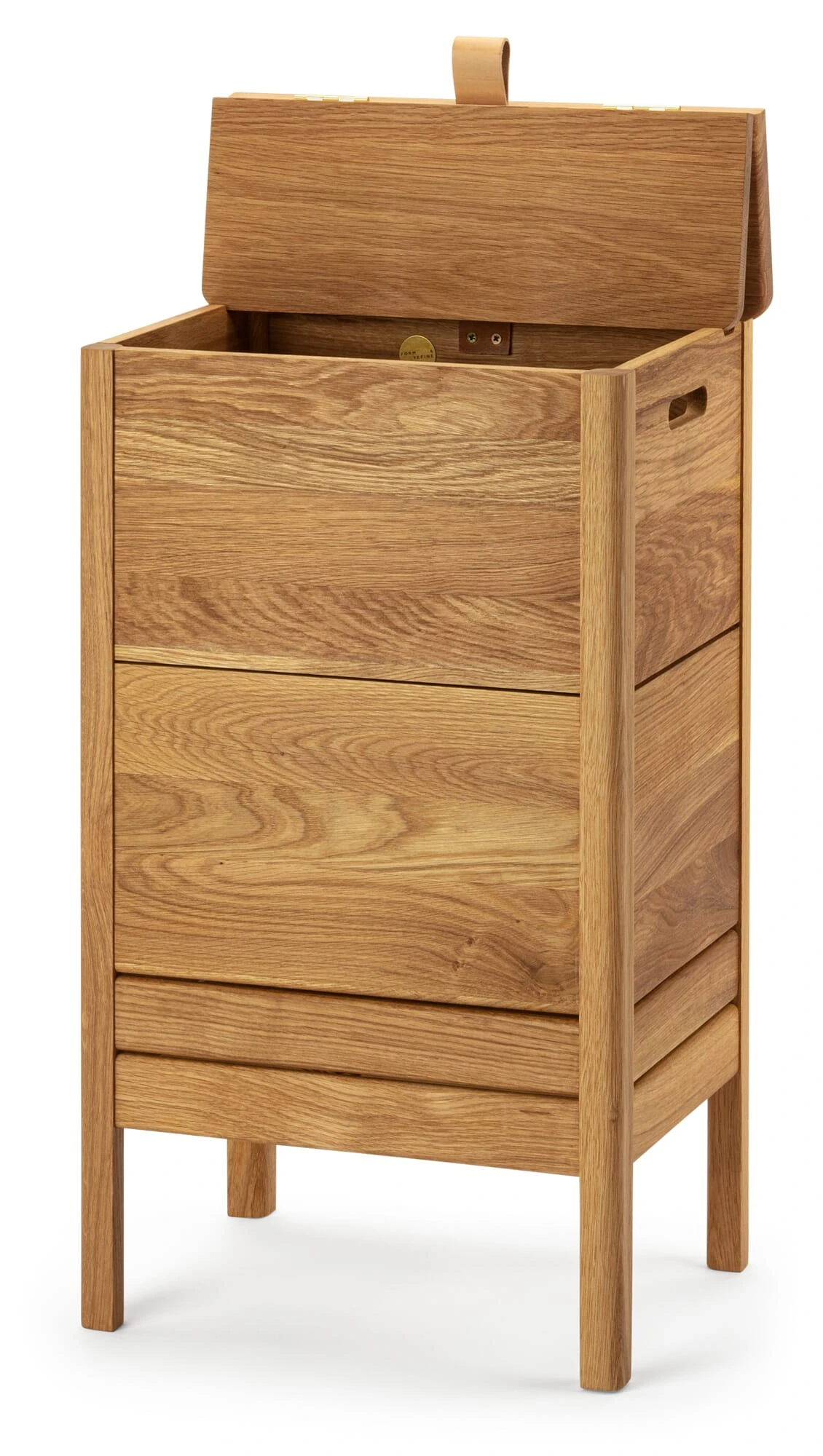 Deze linnen commode is onmiskenbaar een geestverwant van de commodebank van Form & Refine. Met zijn slanke rechtopstaande formaat is hij geschikt voor de badkamer, hal en garderobe, maar ook voor de slaapkamer of kleedkamer, waar hij linnengoed, kussens en dekens herbergt. In de kinderkamer dient het als verzamelpunt voor zacht speelgoed, bouwstenen enz. en zelfs in de keuken of de woonkamer staat het goed als mini dressoir of bar. Het heldere ontwerp vertoont beslist een verwantschap met de traditie van Shaker meubelen, wat het voordeel biedt dat de opbergkist in de meest uiteenlopende woonstijlen past. Dankzij zijn compacte afmetingen kan hij ook gemakkelijk in kleine ruimtes worden ondergebracht. De fabrikant produceert de kist identiek aan de kistbanken van massief, geolied eikenhout, die u ook in ons assortiment vindt. Het tweedelige deksel wordt geopend door middel van een lus van plantaardig gelooid, ongeverfd leer en klikt aan de achterkant vast. De bergruimte wordt geventileerd door openingen in de verbinding tussen de basis en de poten en in de uitsparing die is gefreesd om het deksel vast te zetten. Handgrepen rechts en links vergemakkelijken het vervoer en zorgen tevens voor ventilatie van het interieur.