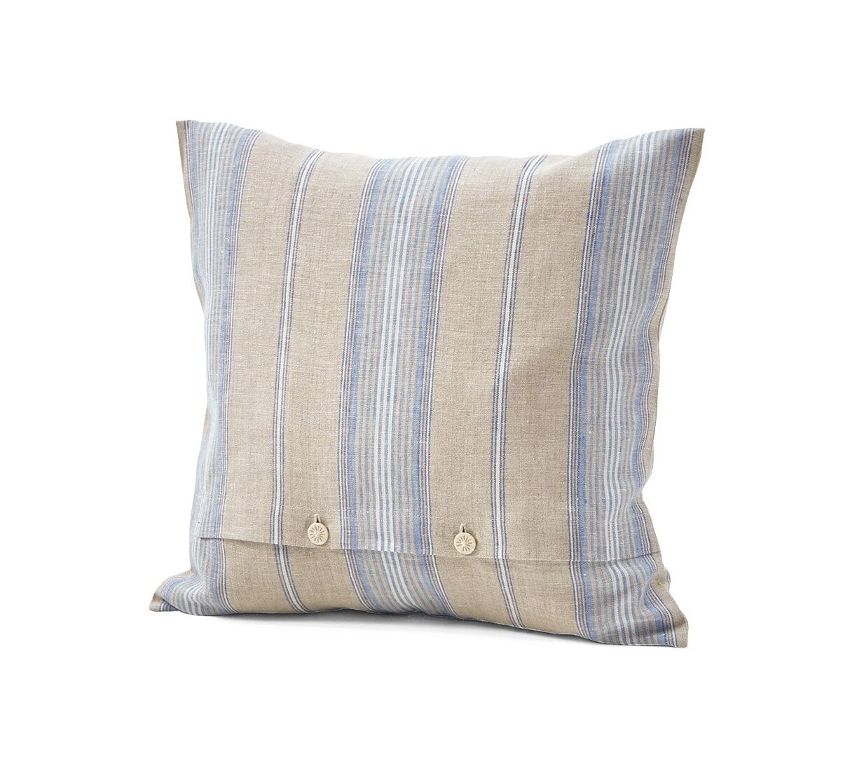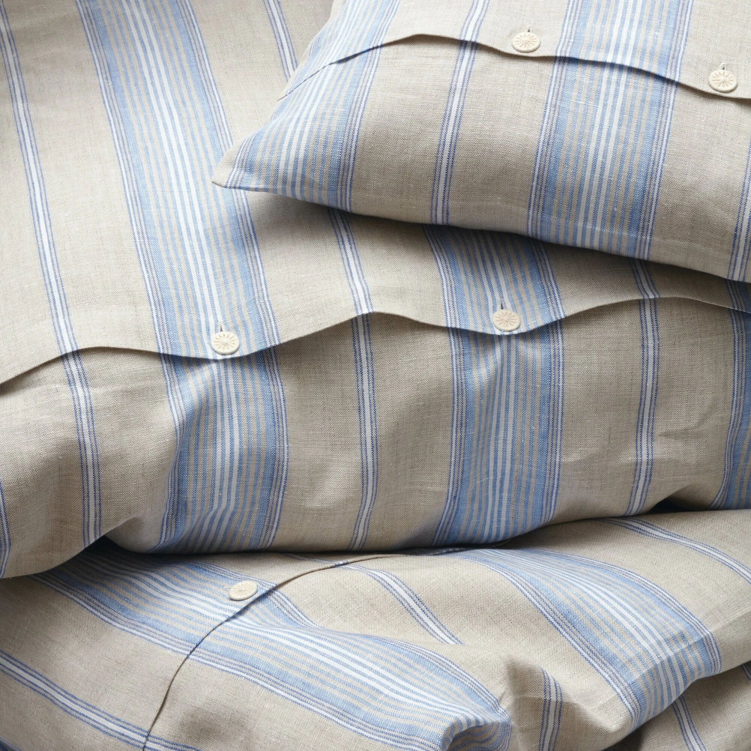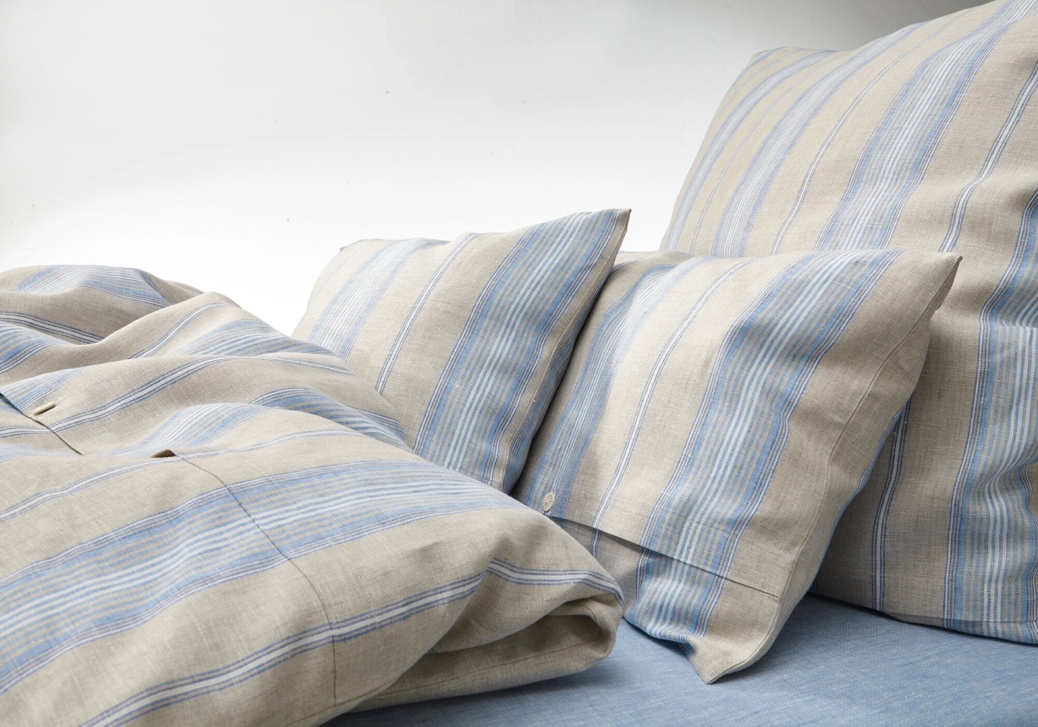 100% linnen, herkomst Europa. Natuurlijk en ongeverfd of garengeverfd in platbinding. Basisgewicht 220 g/m², garengetal in schering en inslag Nm 16. Bij de snit is rekening gehouden met 4% krimp. Alle hoezen zijn voorzien van met garen omwikkelde twijnknopen. Gemaakt in Duitsland.