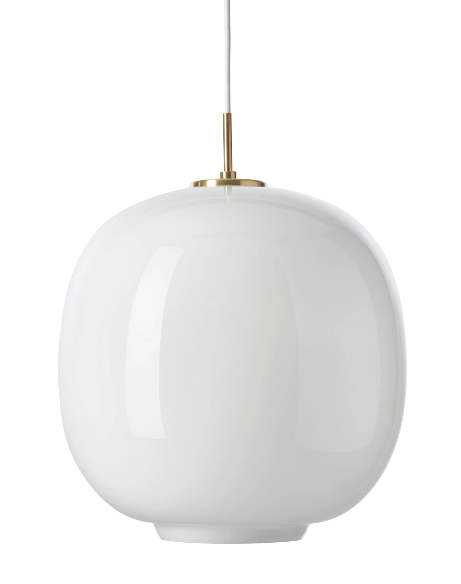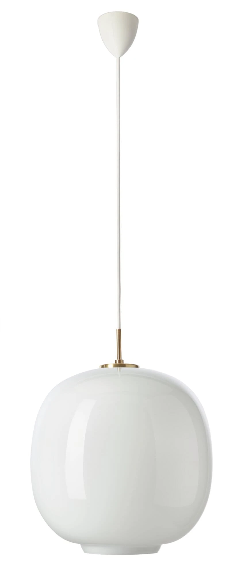 Vilhelm Lauritzen, een van de belangrijkste Deense architecten en een pionier van het Deense functionalisme, was een meester in het verenigen van materiaal en licht. Zijn hele leven lang werkte hij volgens het credo: “Geen leven zonder esthetiek.” De hier aangeboden armatuur ontwierp hij midden jaren veertig voor de Deense omroep. Het werd toen al geproduceerd door Louis Poulsen en werd al snel een van de best verkochte modellen. Het ontwerp volgt perfect Lauritzen’s basisidee om een gericht licht dat schaduwen werpt te combineren met een diffuus licht: Gericht licht valt naar beneden door de opening aan de basis, terwijl de handgeblazen kap zelf een gelijkmatig en zacht licht in de kamer verspreidt. De lampenkap bestaat uit drie lagen glas, waarbij de binnenste laag uit helder glas bestaat, de middelste laag uit wit glas en de buitenste laag weer uit helder glas. In 2016 hervatte Louis Poulsen de productie van de lamp, die geschikt is voor zowel hoge als lage montage, die inmiddels was stopgezet – alleen qua lichttechniek en energieverbruik werd ze bij de tijd gebracht.