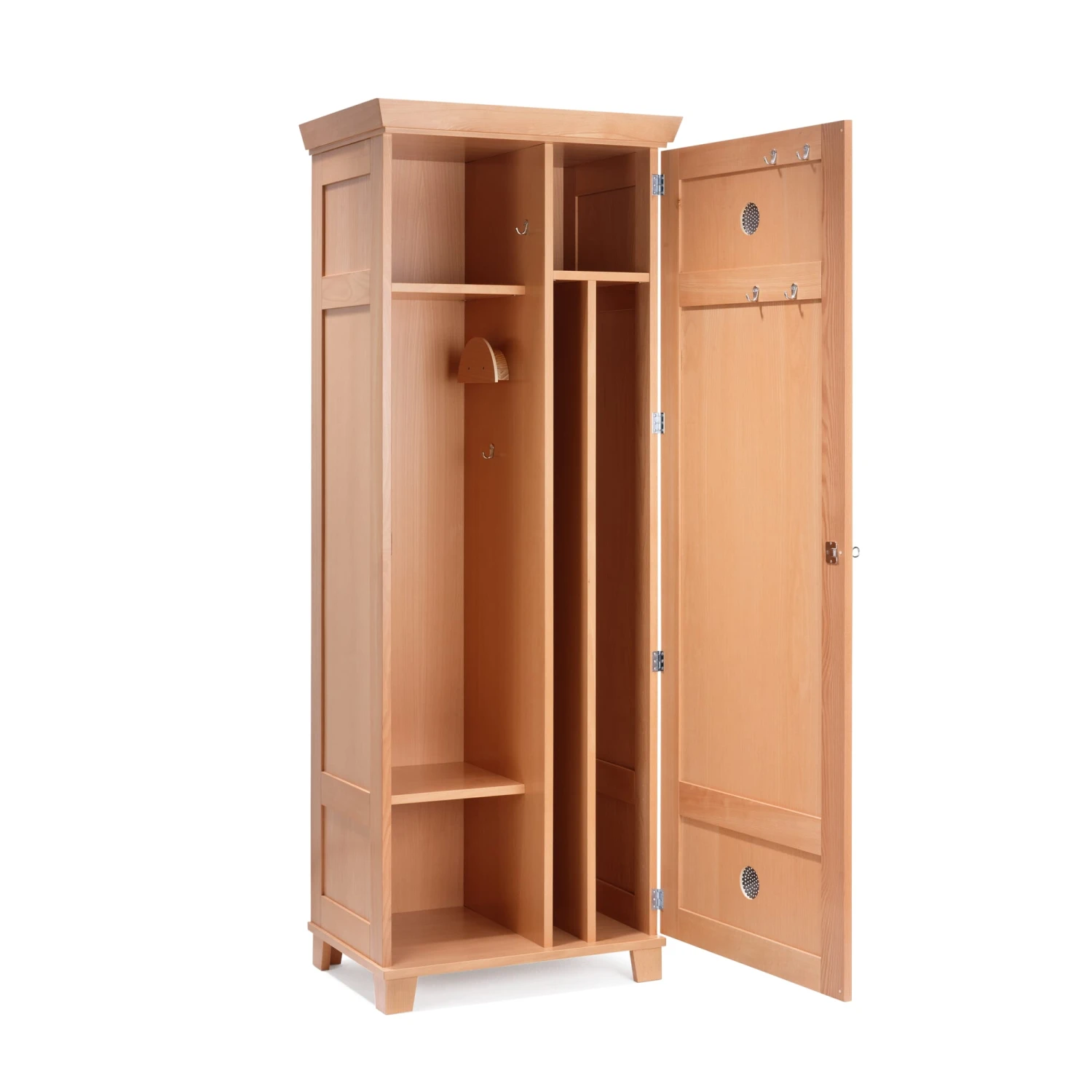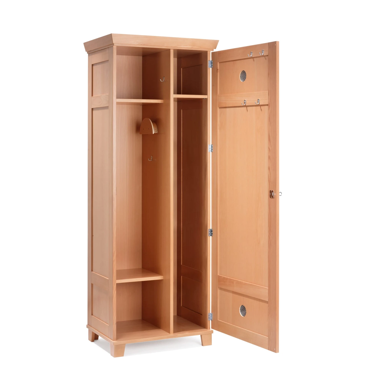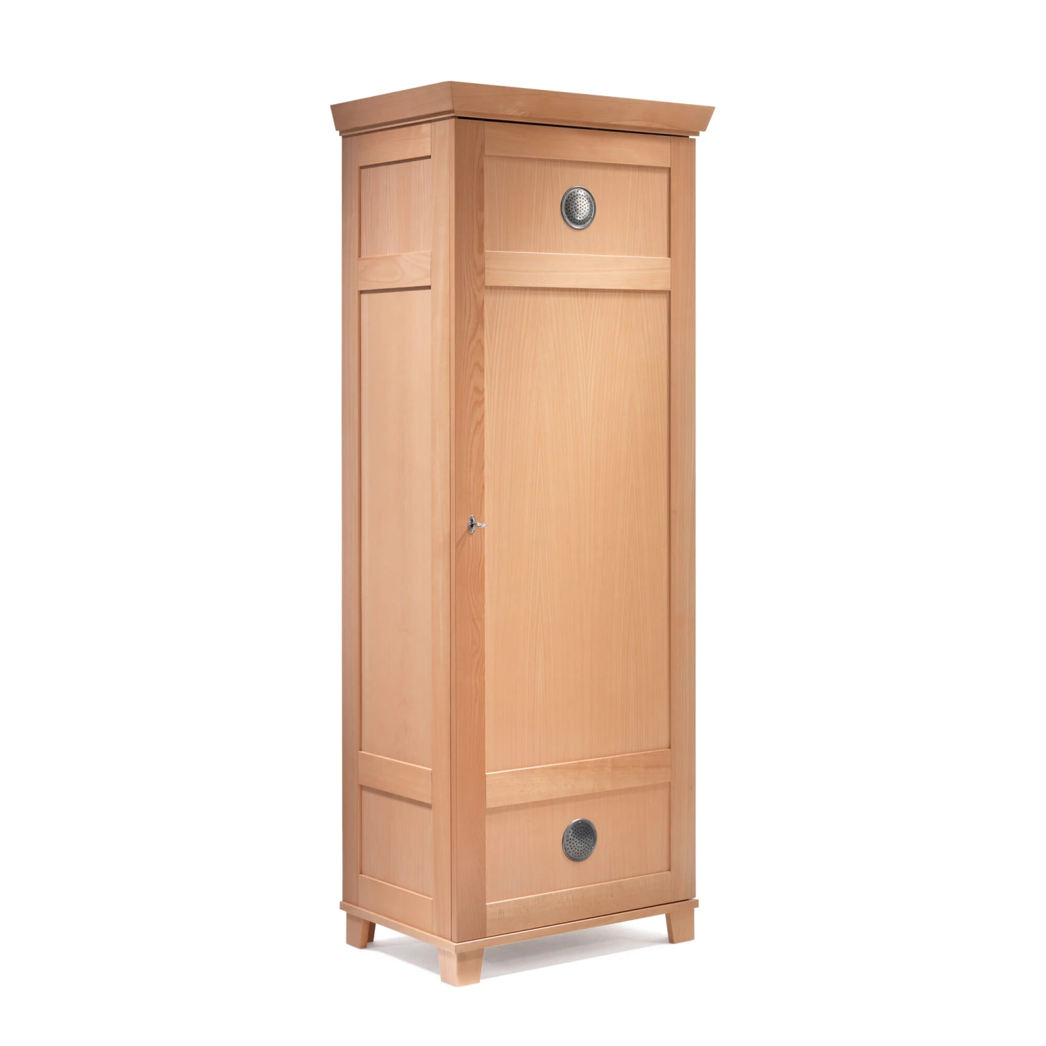 Deur en kozijndelen van massief beukenhout (22 mm dik), achterwand en panelen van multiplex, beukenfineer (materiaaldikte 8 mm), binnenwand van 22 mm dik, gefineerd blokplaat van beukenhout. Deurscharnieren staal, vernikkeld. Geperforeerde platen van vertind staal, haken en slot van vernikkeld gegoten zink. Een bevestigingsbeugel is voorgemonteerd voor wandmontage. Uitwendige afmetingen: hoogte met kroonlijst 206 cm, breedte 73,5 cm, diepte 52,5 cm. Gewicht 58 kg.