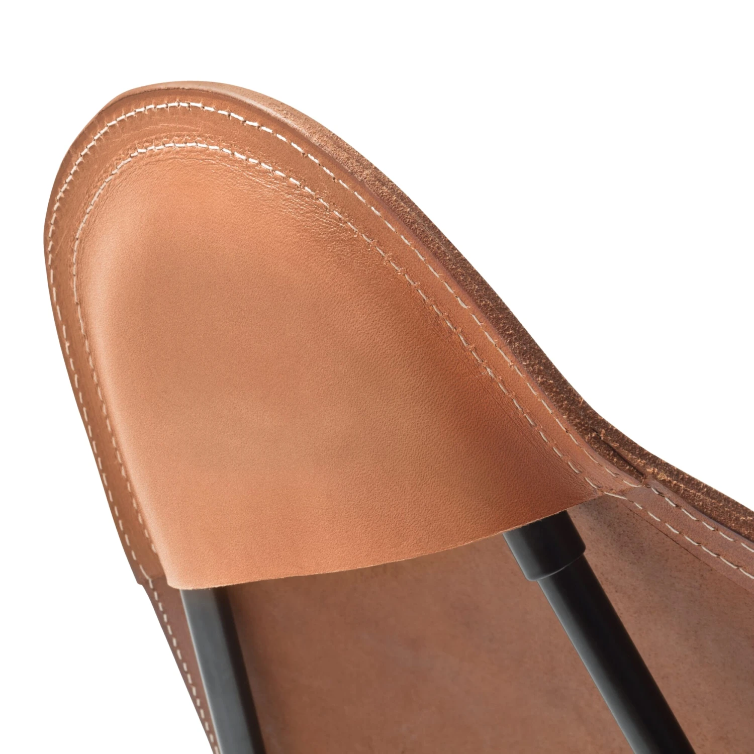 Zitting van plantaardig gelooid, geverfd rundleer, 4 mm dik, met open rand gestikt. Frame ronde stalen staven, open gelast en zwart gepoedercoat. Connectoren van gegoten aluminium. Hoogte 93,5 cm, breedte 81 cm, diepte 83 cm. Zithoogte vooraan 28 cm. Gewicht 9,6 kg. Geleverd in losse onderdelen.