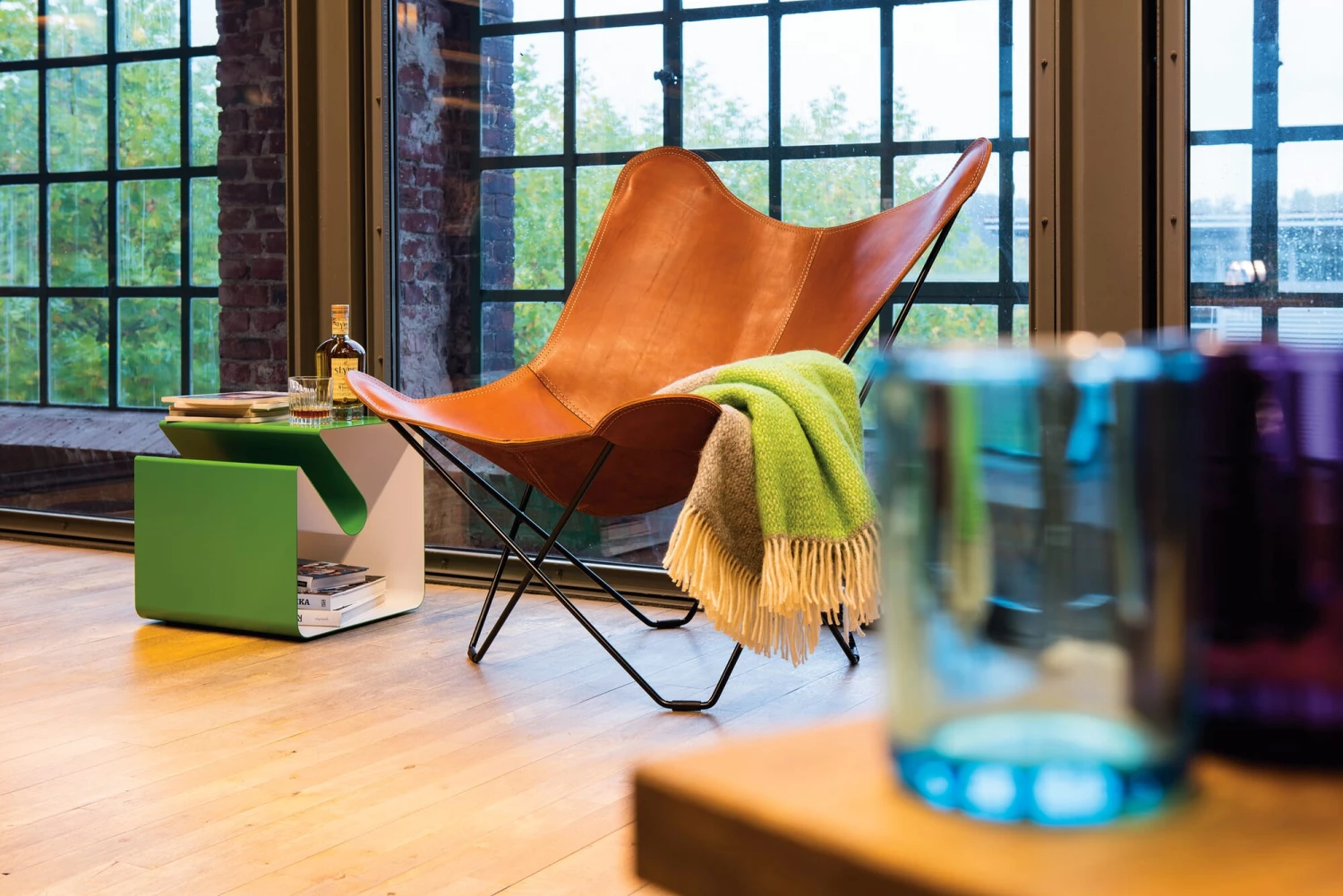 Voor ons is deze fauteuil, waarvan de voorganger in de jaren 1950 beroemd werd als de “Butterfly Chair” (of vleermuisstoel), nog steeds een van de meest succesvolle zitmeubelen in zijn soort. Het origineel was een eenvoudige fauteuil met een vertakt frame, ontworpen in de jaren 1930 door de Argentijnse architecten Antoni Bonet i Castellana, Juan Kurchan en Jorge Ferrari-Hardoy. Ons model komt qua vorm heel dicht bij dit originele type en draagt de naam “Mariposa” – vlinder.