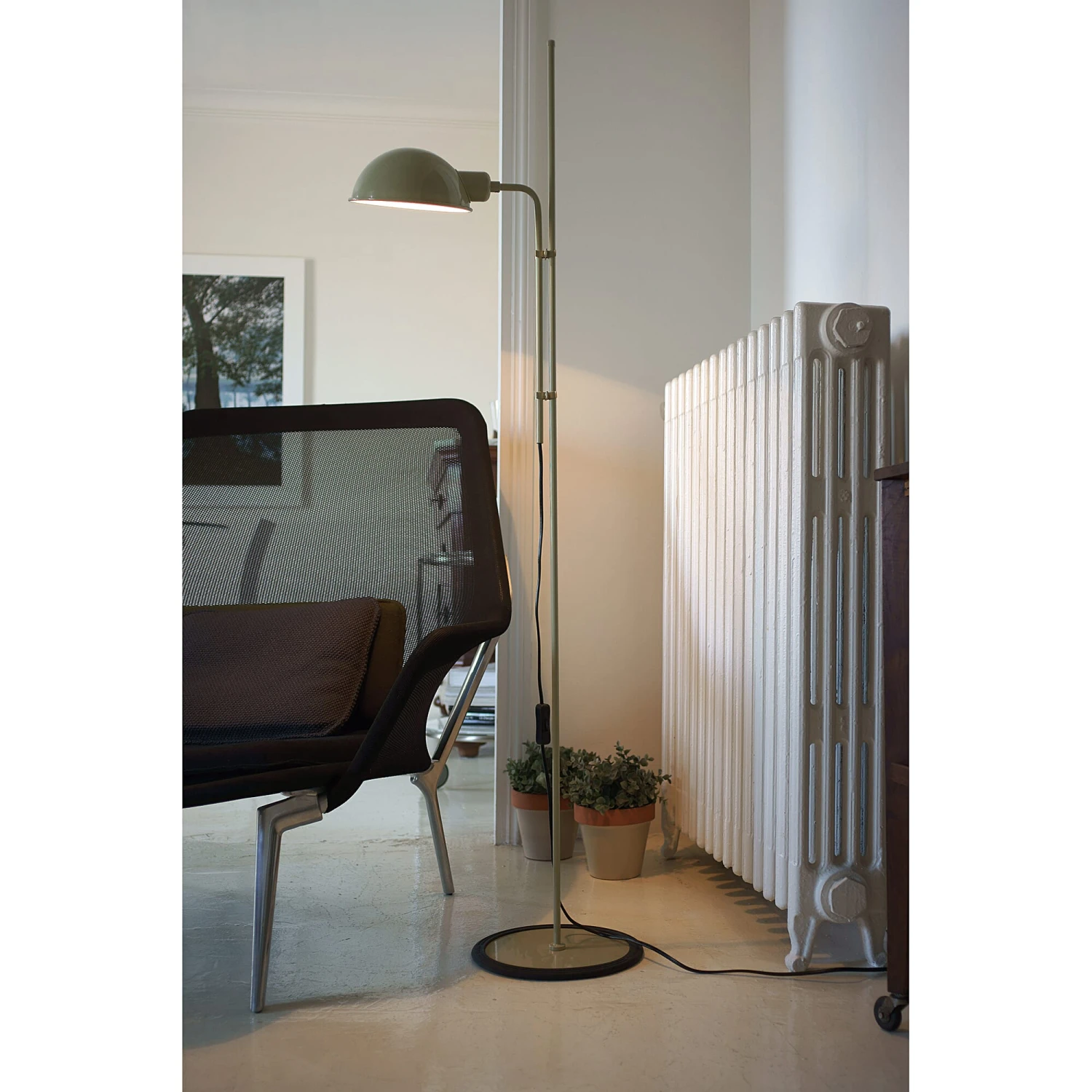 Vloerlamp in klassieke industriële vorm. Voor gebruik op de leesplek, naast de bank of het bureau, in hoogte verstelbaar en met zijdelings draaibare kap voor verduistering. Kabel: L 215 cm, Eurostekker. Stopcontact: E27. Lamp niet inbegrepen. Stroomverbruik: max. 53 W.