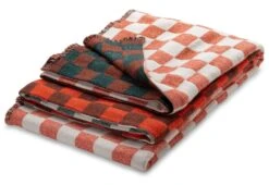 Deze jacquard geweven wollen deken heeft twee bijzondere kenmerken. Ten eerste het materiaal: katoen (32%) is gemengd met de warme, zachte en soepele merinowol (68%). Dit zorgt ervoor dat het oppervlak nog huidvriendelijker is, niet krast en de deken een mooie, zware drapering heeft. Daardoor voelt het aangenaam aan tegen het lichaam. Anderzijds bekoort het door zijn ingewikkelde design. Op het eerste gezicht een eenvoudig schaakbordpatroon, maar het mooie kleurverloop van de twee donkere tinten naar de lichtere wordt pas duidelijk als de deken helemaal is uitgespreid. In gebruik onthult de drap een levendig patroon dat dankzij de gedempte kleuren toch rustig en ongekunsteld overkomt. De merinowol wordt gesponnen in Finland en volledig verwerkt in de weverij in Kankurit. De deken wordt geweven op jacquardweefgetouwen, wat niet alleen het ongewone patroon mogelijk maakt, maar ook betekent dat de twee zijden in verschillende kleuren worden geweven (als een dubbel gezicht). Aan de lange randen is de deken bewerkt met zogenaamde wimper franjes, d.w.z. zeer korte franjes.