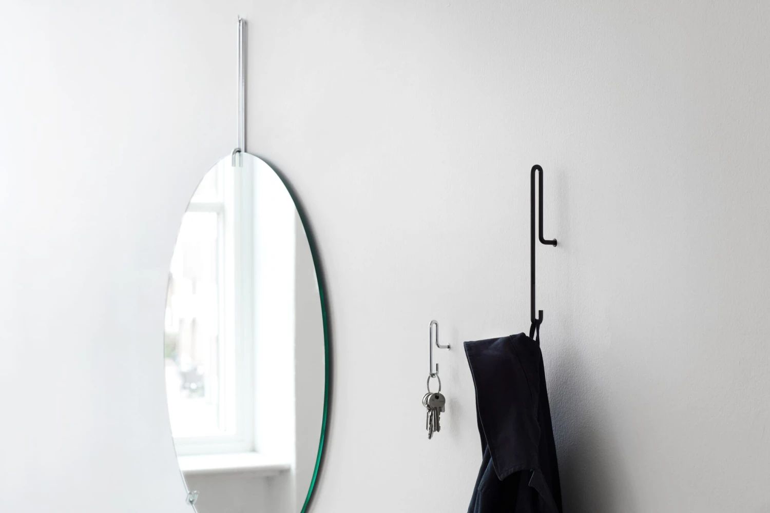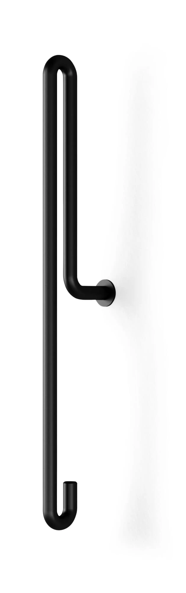 Mooi gevormde wandhaak – hier in zijn grote vorm – in verschillende materialen en oppervlakken. De vorm biedt een dubbel gebruik: aan de onderkant en aan de bovenkant een zacht gevormde straal. Bruikbaar voor kleding in de kledingkast of ook voor handdoeken in de badkamer.
