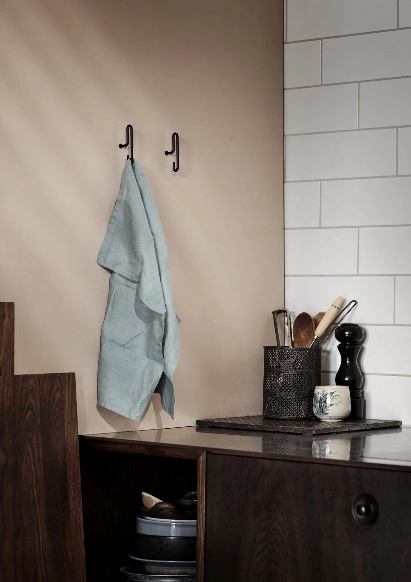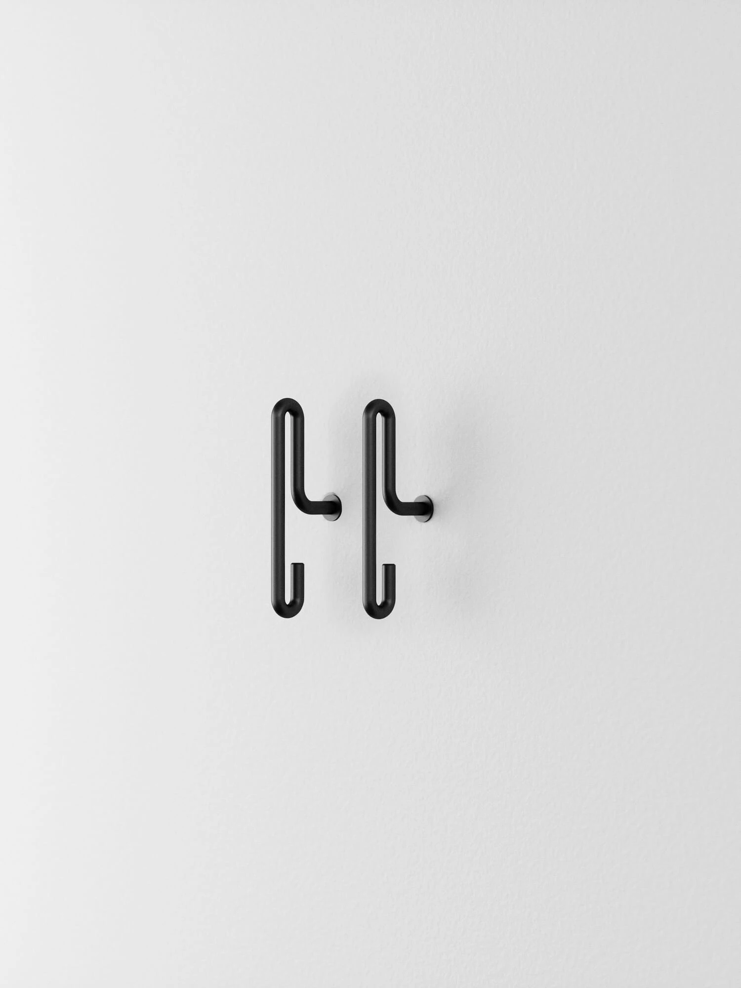 Mooi gevormde wandhaak – hier in zijn kleine vorm – in verschillende materialen en oppervlakken. De vorm biedt een dubbel gebruik: aan de onderkant en aan de bovenkant een zacht gevormde straal. Bruikbaar voor kleding in de kledingkast of ook voor handdoeken in de badkamer.