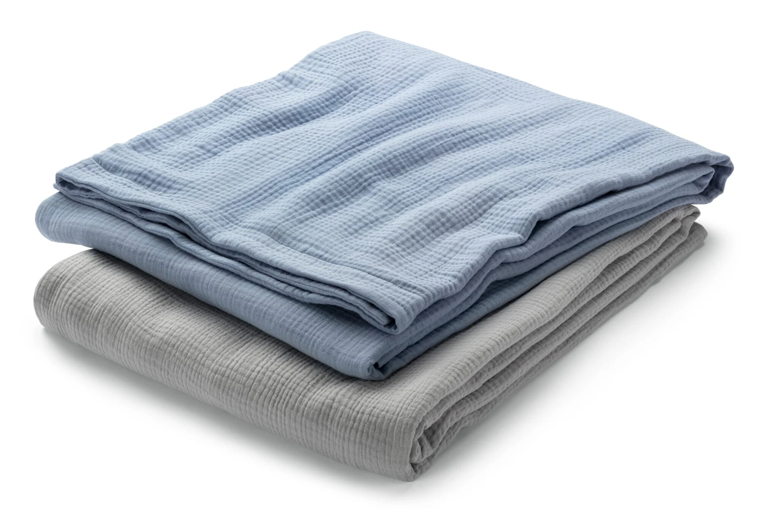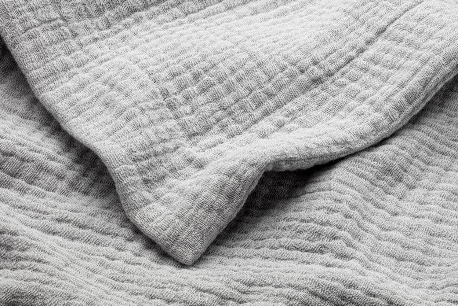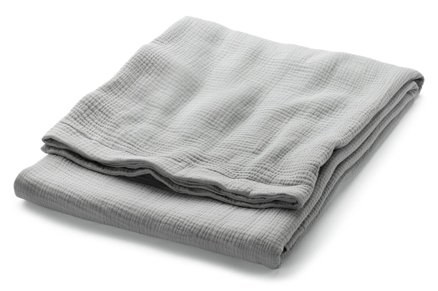 Mousseline is een lichte, luchtige stof, geweven in een losse platbinding van slechts licht gedraaide garens. Het voelt zacht aan en heeft een gekreukte structuur die nog opvallender is door de kleine verdikkingen en knopen die typisch zijn voor het materiaal. Voor deze zachte, ademende deken hebben wij de drielaagse mousseline dubbel verwerkt, zodat deze zijn temperatuurregelende eigenschappen bijzonder goed kan weergeven. Tegelijkertijd is het nog steeds zeer licht met een basisgewicht van 165 g/m². Het gebruikte katoen is GOTS-gecertificeerd, zodat u de deken ook kunt gebruiken als luchtig alternatief voor een dekbed op warme zomernachten. Met zijn 135 × 220 cm heeft hij daarvoor ook de juiste afmetingen.