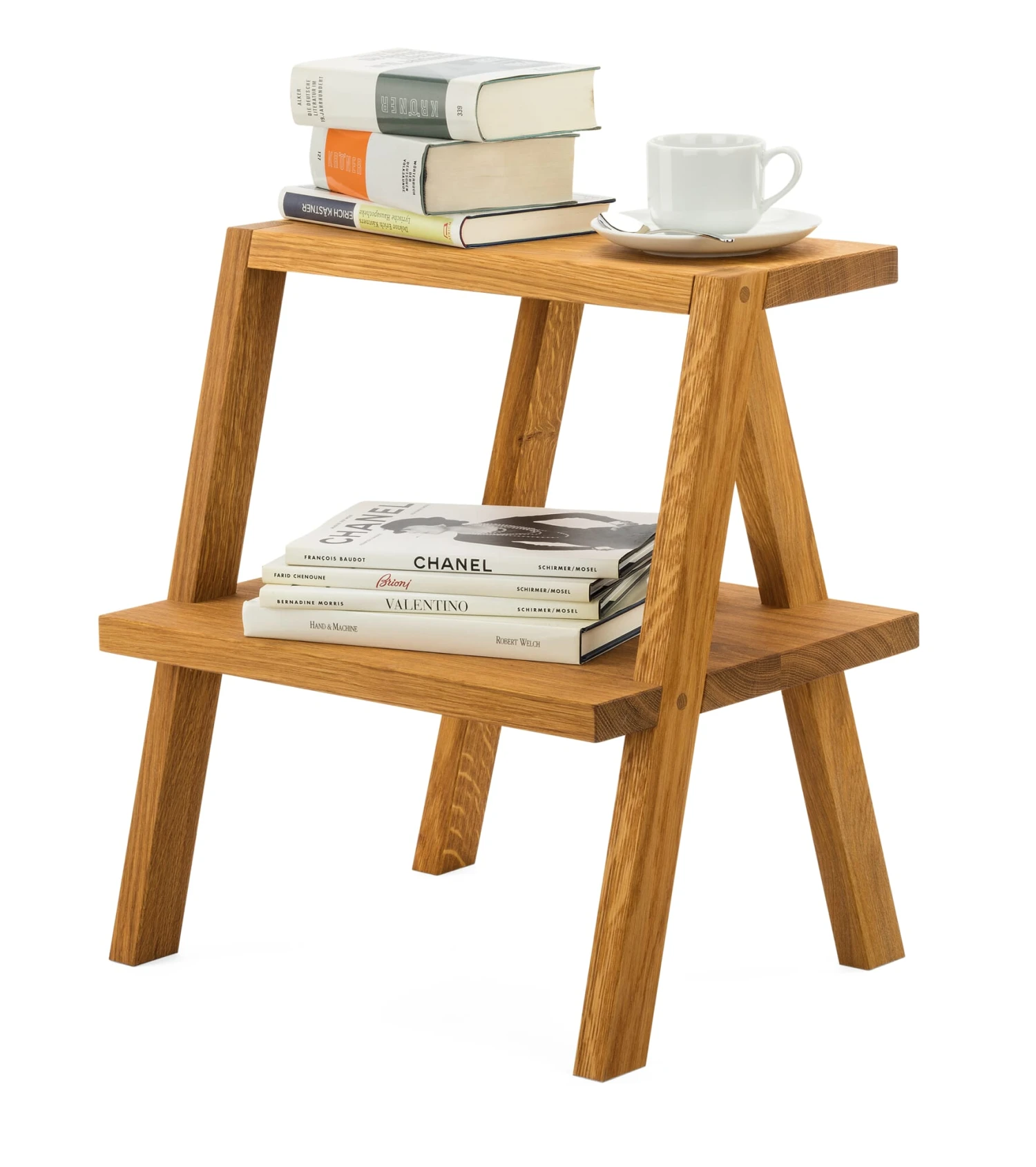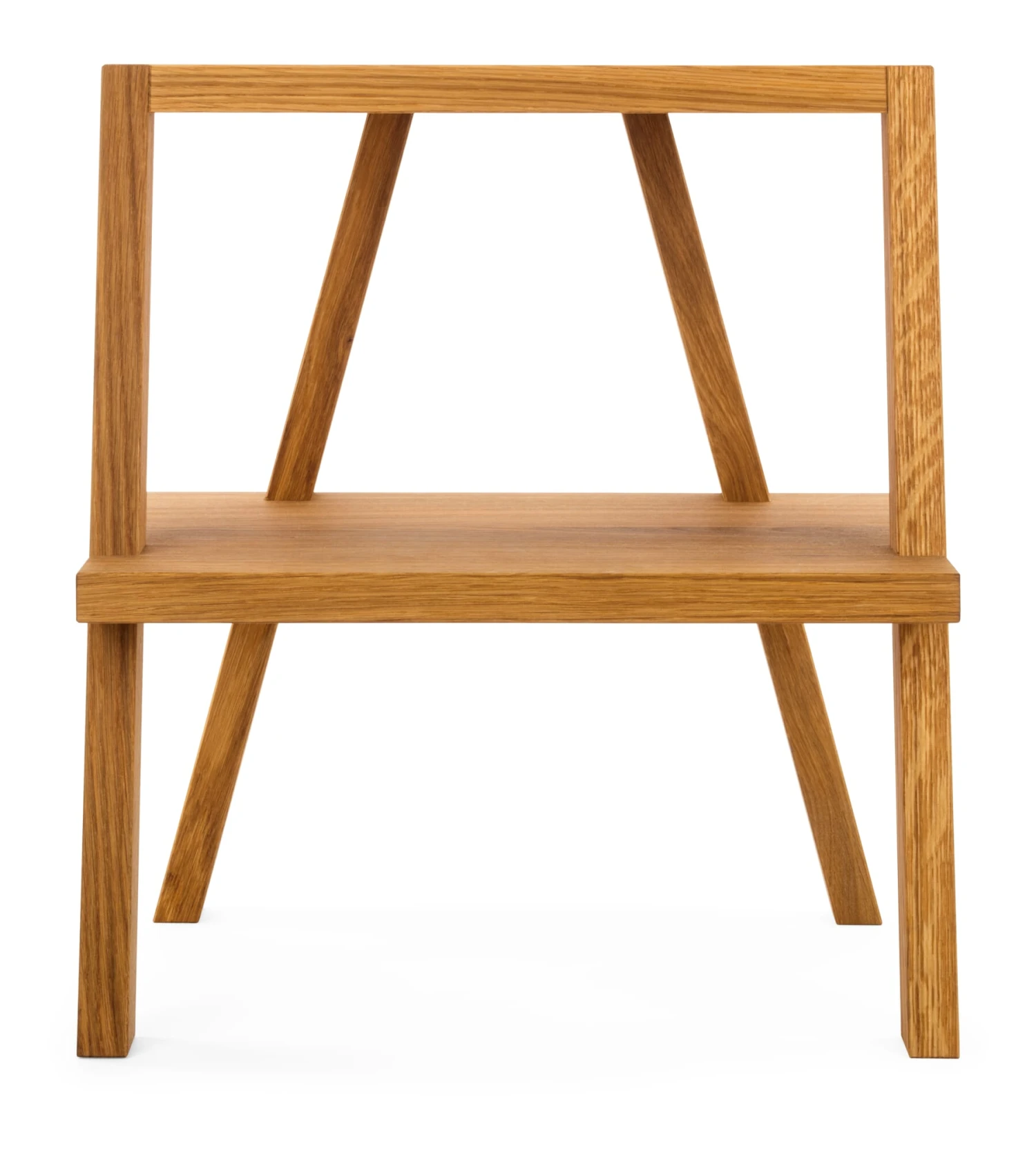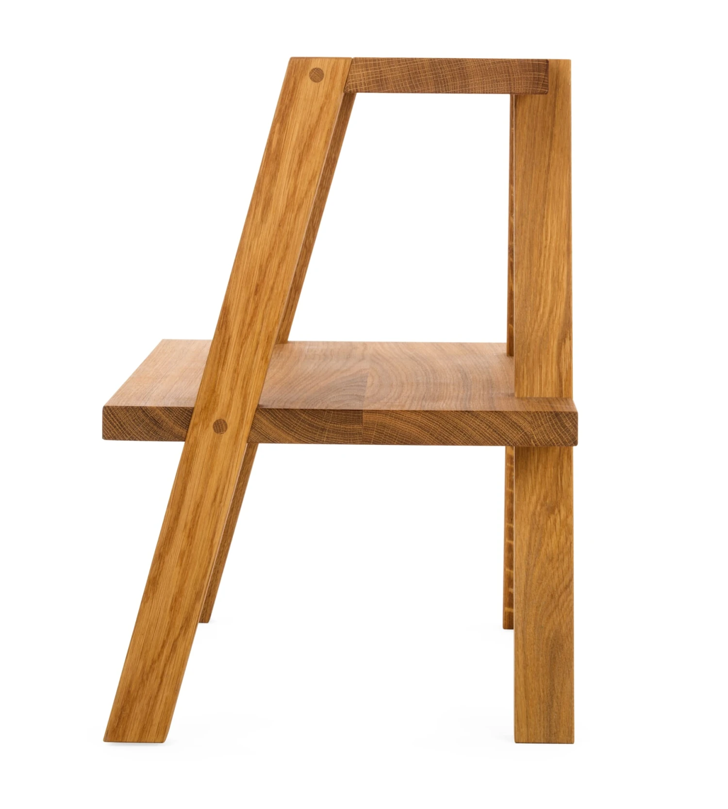 Een zitje en opstapje, maar ook een bijzettafel en nachtkastje in één: dit kleine universele meubel van massief hout kan op verschillende manieren worden gebruikt en overtuigt vooral door zijn stabiele constructie: om ervoor te zorgen dat het meubel nog grotere belastingen kan weerstaan (bijv. in zijn functie als opstapje), is het frictievergrendeld (de vier poten ontmoeten de twee horizontale planken niet in een rechte hoek, maar onder een hoek – dit zorgt voor stabiliteit door statische wrijving), 2. gelijmd en 3. extra geschroefd (de zak is van hout). Het opstapje is gemaakt in Duitsland – van PEFC-gecertificeerd geolied eikenhout of mat zwart gelakt essenhout uit Zuid-Duitsland.