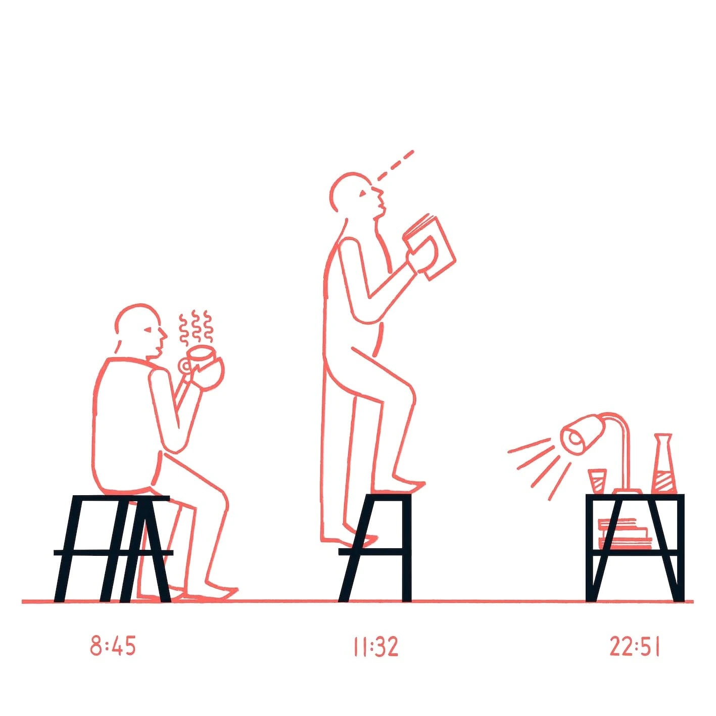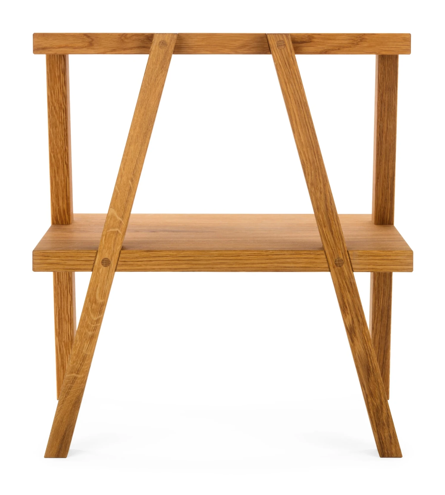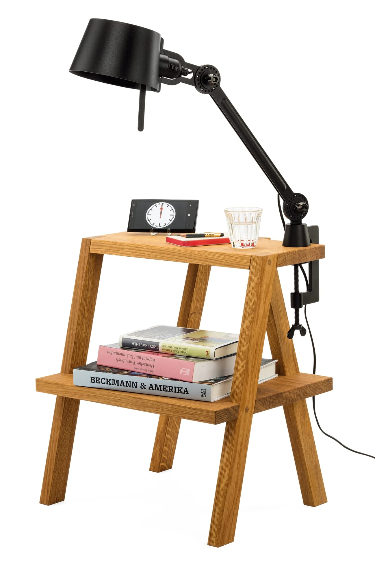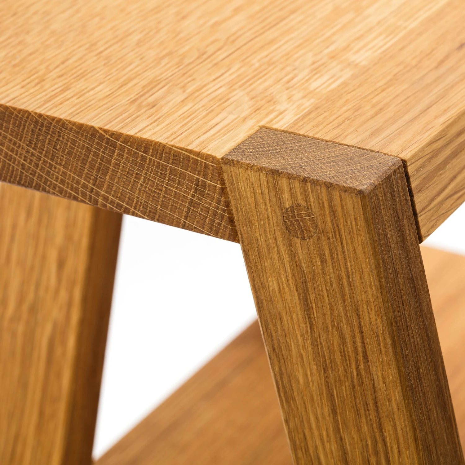 Een zitje en opstapje, maar ook een bijzettafel en nachtkastje in één: dit kleine universele meubel van massief hout kan op verschillende manieren worden gebruikt en overtuigt vooral door zijn stabiele constructie: om ervoor te zorgen dat het meubel nog grotere belastingen kan weerstaan (bijv. in zijn functie als opstapje), is het frictievergrendeld (de vier poten ontmoeten de twee horizontale planken niet in een rechte hoek, maar onder een hoek – dit zorgt voor stabiliteit door statische wrijving), 2. gelijmd en 3. extra geschroefd (de zak is van hout). Het opstapje is gemaakt in Duitsland – van PEFC-gecertificeerd geolied eikenhout of mat zwart gelakt essenhout uit Zuid-Duitsland.