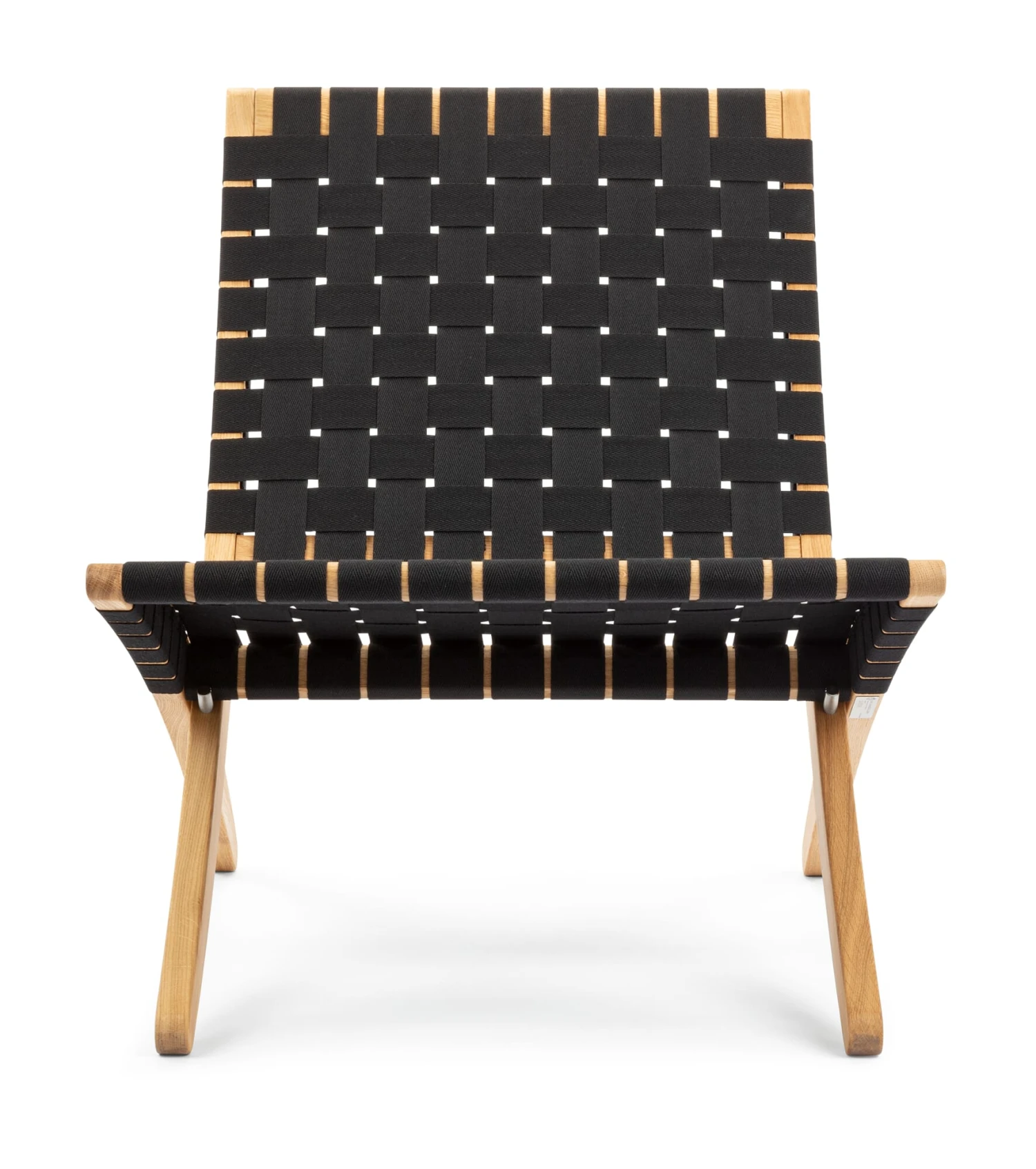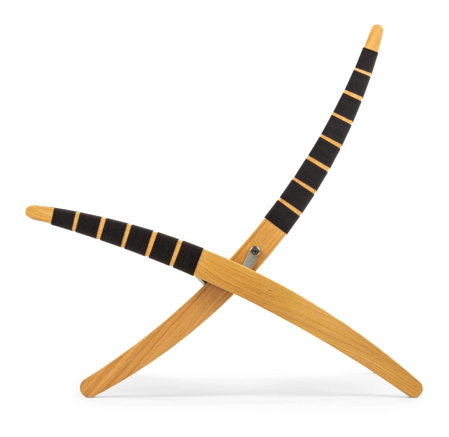 Deze Deense klapstoel is voorbestemd om te “loungen”, want naast zijn lage zithoogte heeft hij een buitengewone zitbreedte, waardoor hij in bijna elke houding comfortabel zit. Het eikenhouten frame is bekleed met banden van een katoen-PP mengsel, geweven in een patroon dat de fabrikant “sildebensmønster” (d.w.z. haringgraatpatroon) noemt. Deze banden, een onmiskenbaar kenmerk van Scandinavisch meubeldesign, zijn gespannen over 25 meter van elke fauteuil en vormen een buitengewoon sterk en duurzaam weefsel.